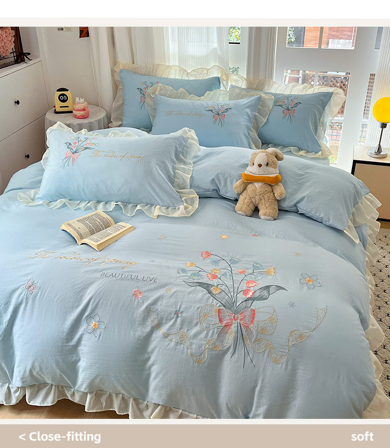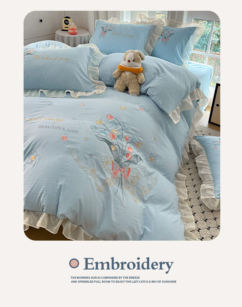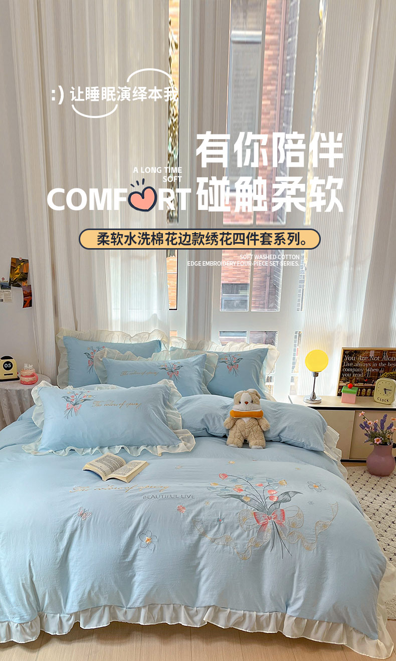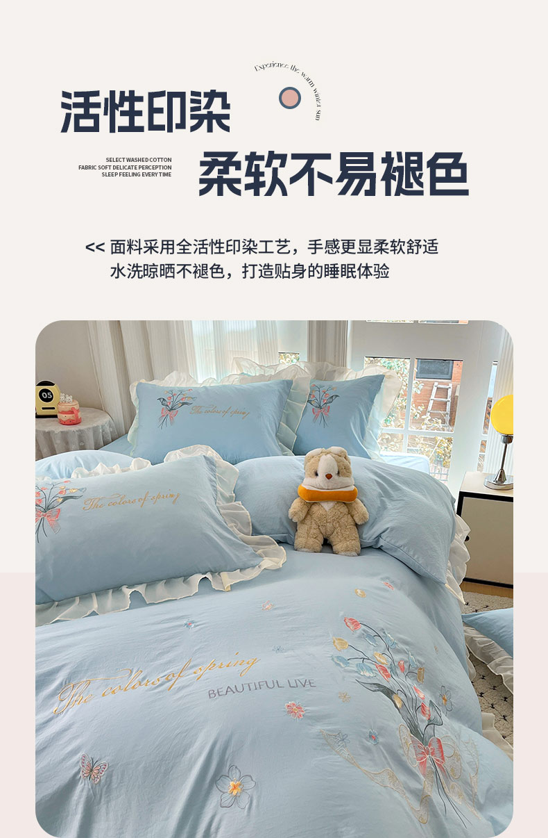 ab家纺 2025新款水洗棉绣花四件套-铃兰语 铃兰语 天空蓝