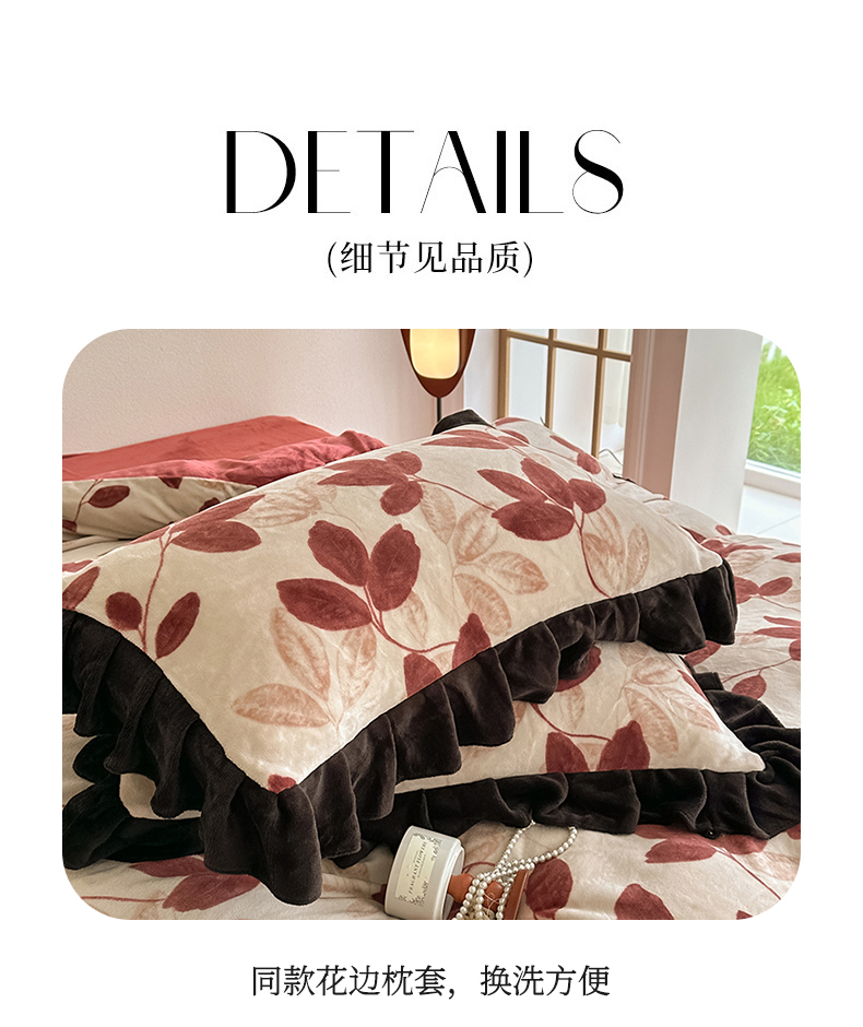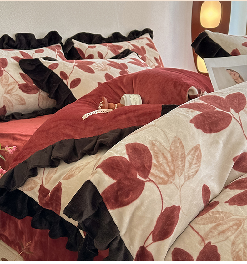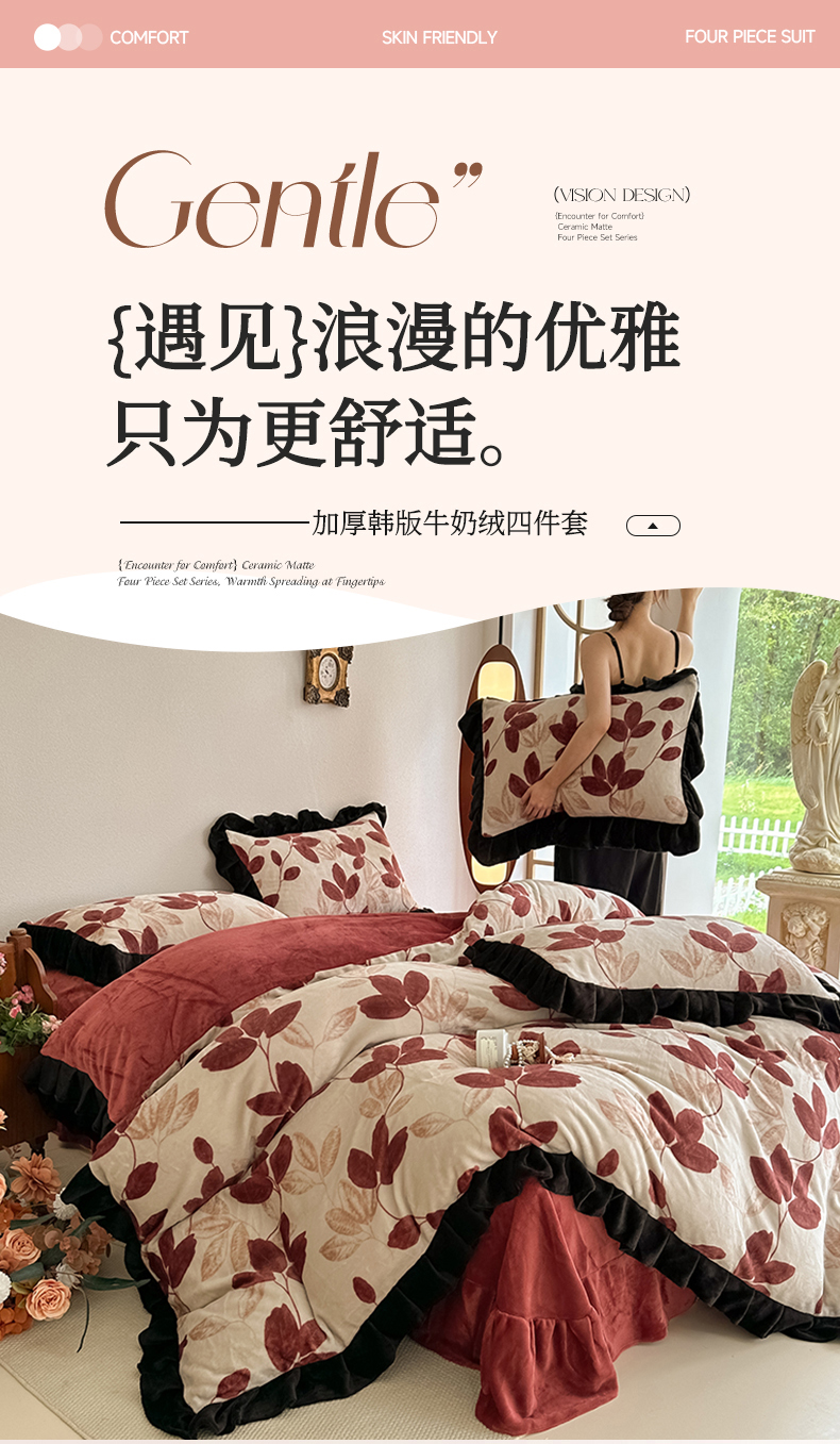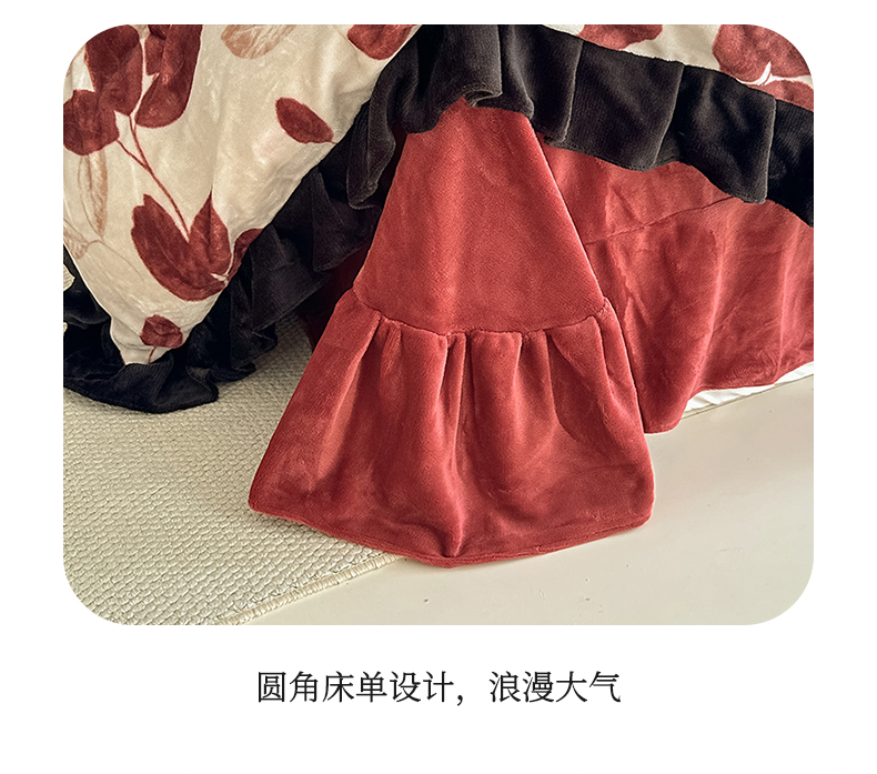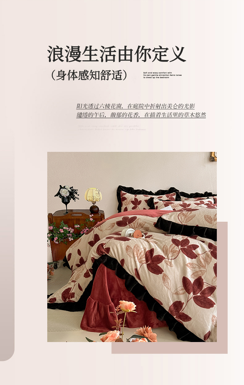 商品名称:亿品2025新款直播爆款韩版赫本风高克重牛奶绒四件套床裙款 8.5斤(有买家秀加v) 红叶寄暖
