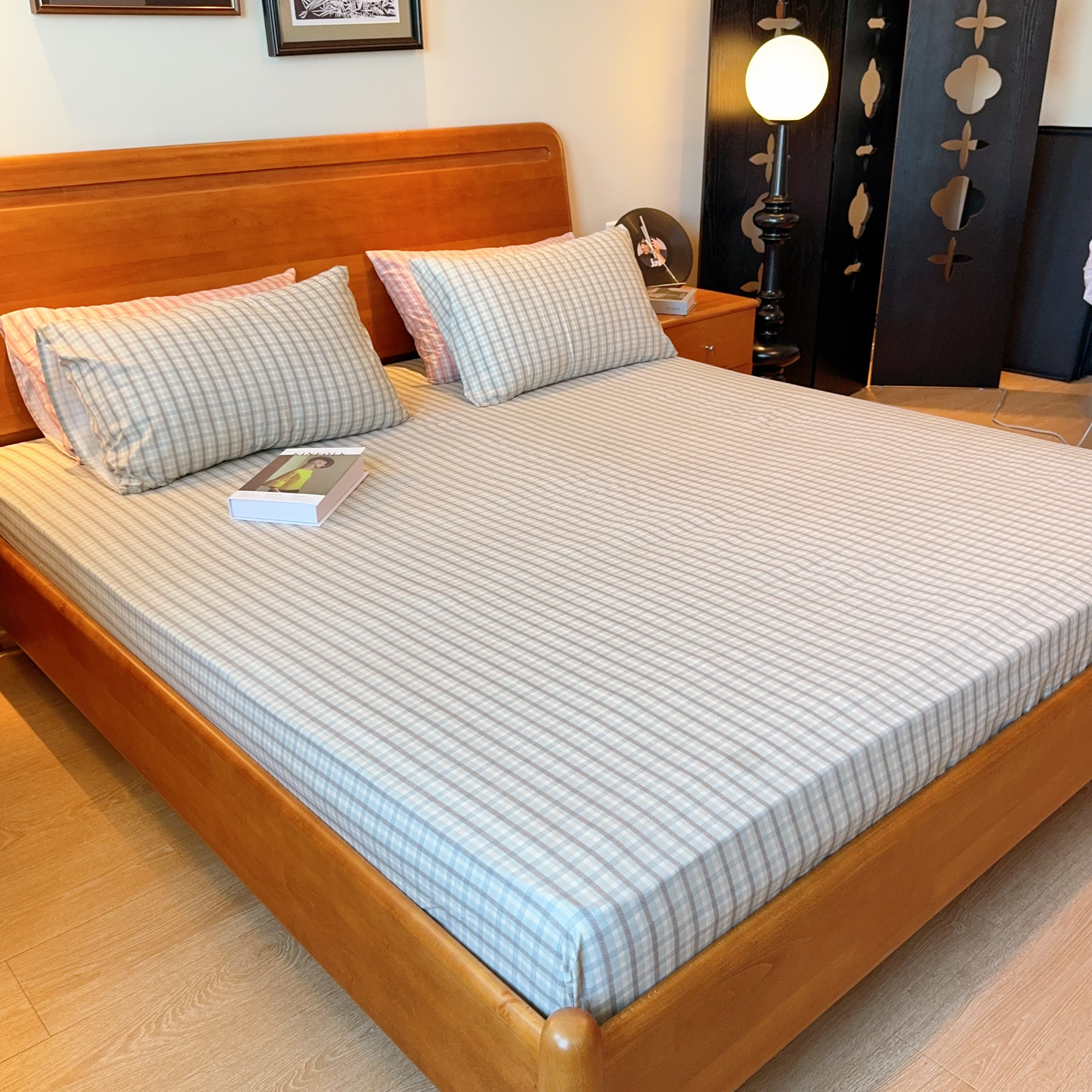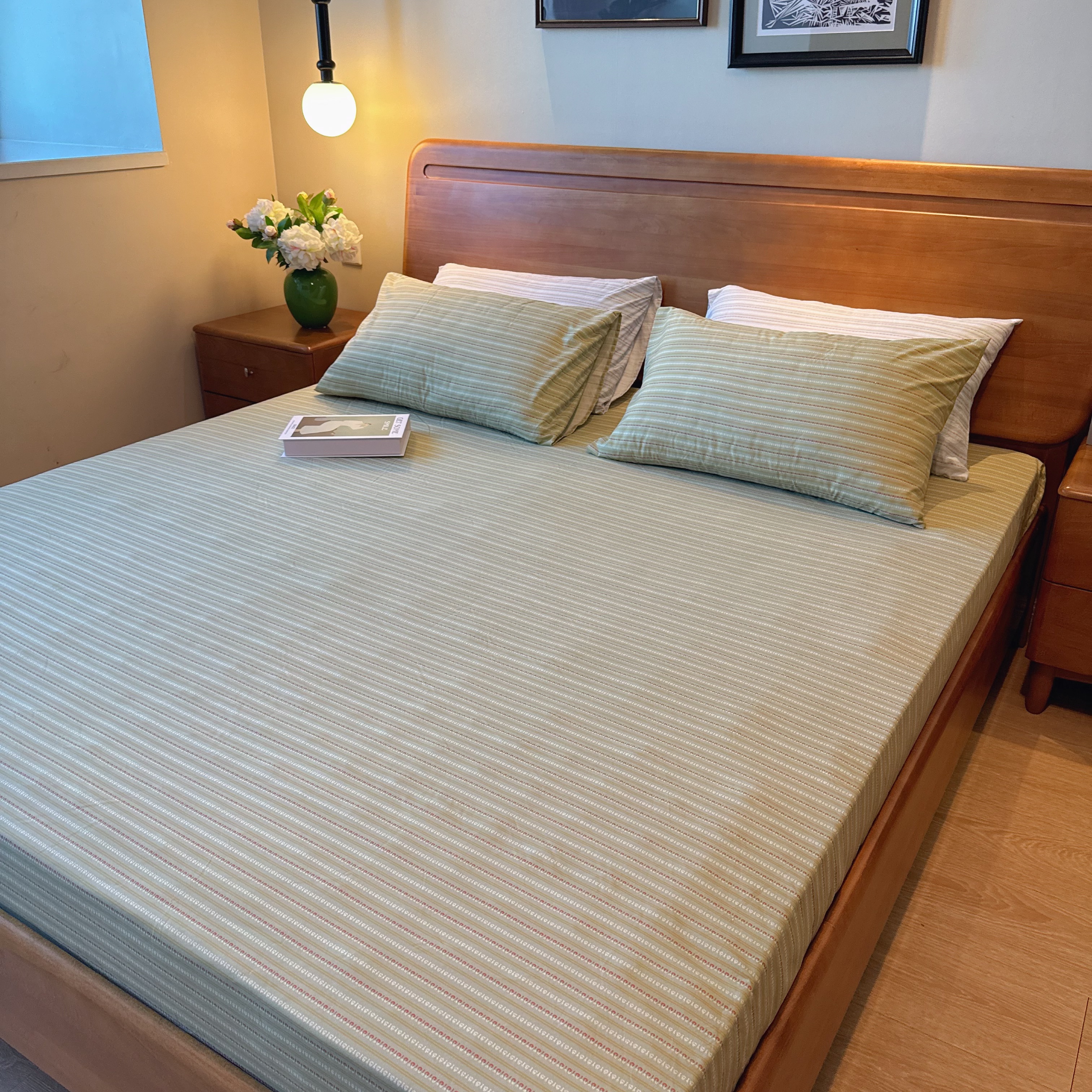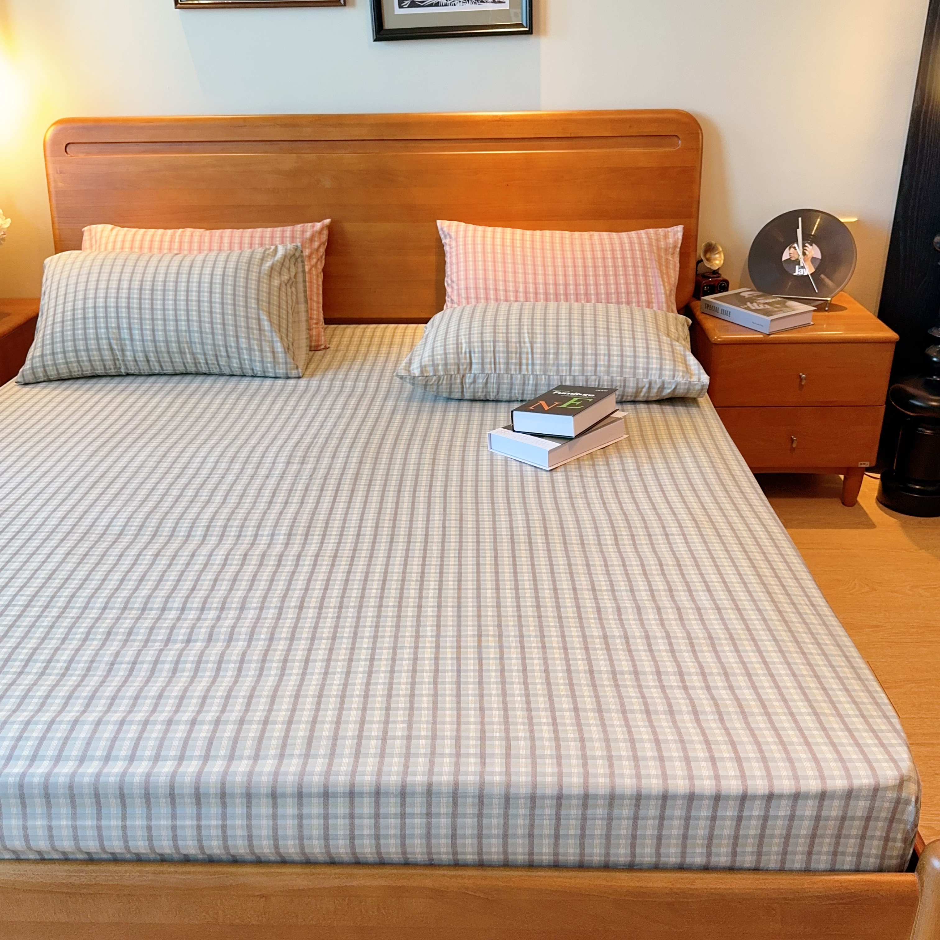 兜米家居 2025新款简约轻氧水洗色织棉床笠 格纹绿