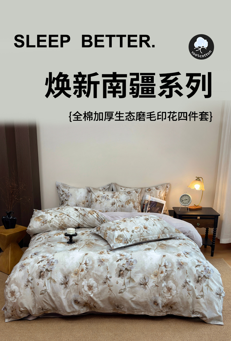 当前位置: 91家纺网 > 商品网购 > 床品套件 > 四件套 > 全棉普通四件套 > 未来家居 2025新款焕新南疆秋冬全棉加厚磨毛纯色印花四件套 春晓-咖