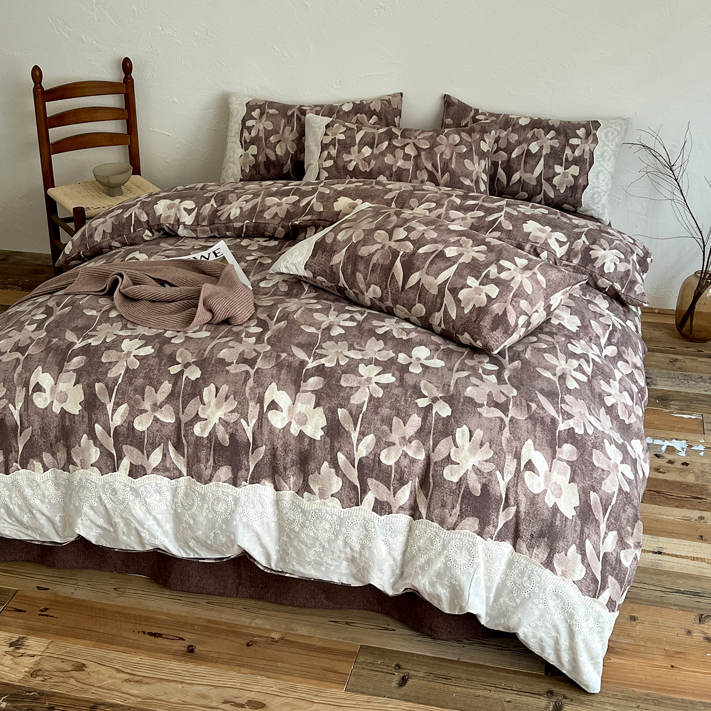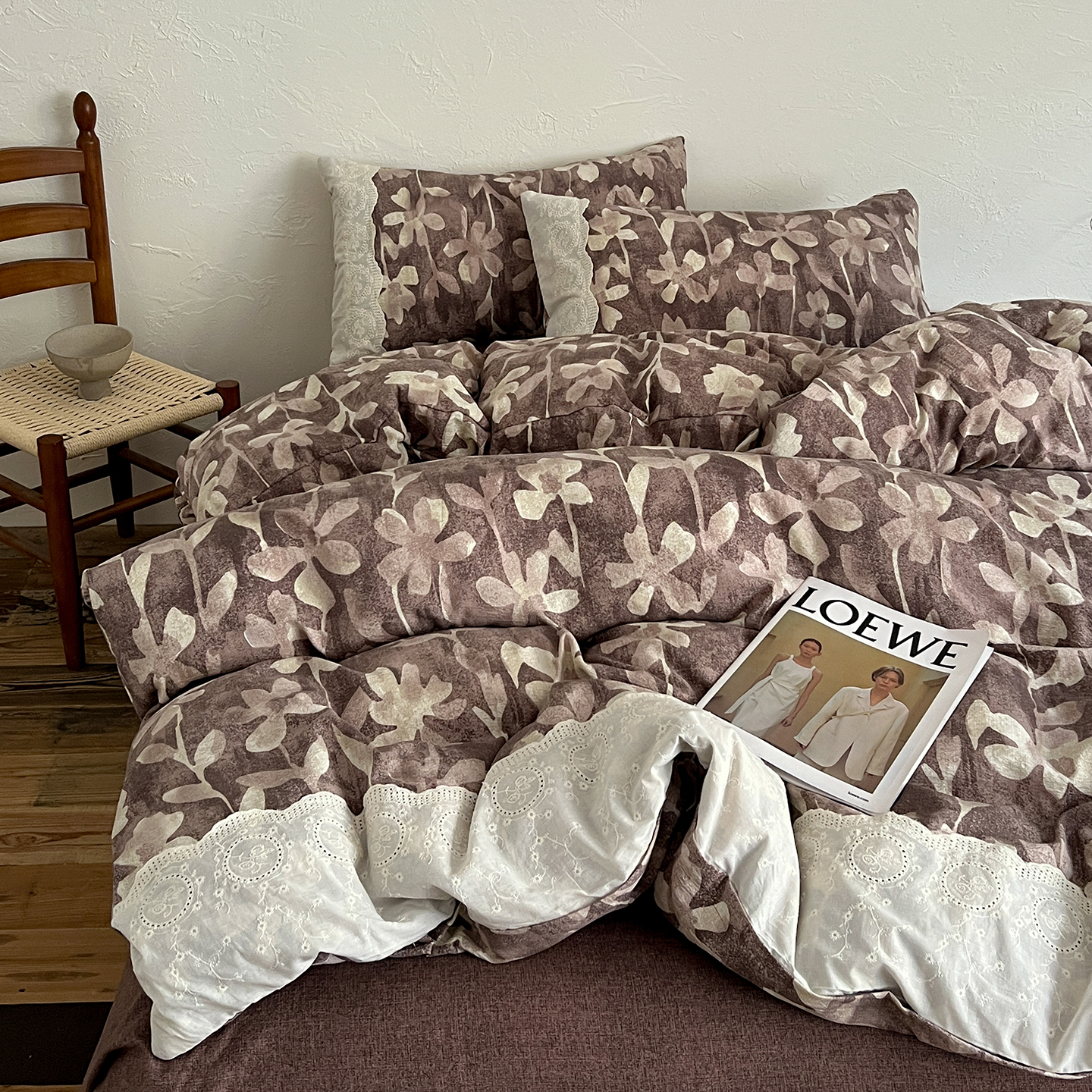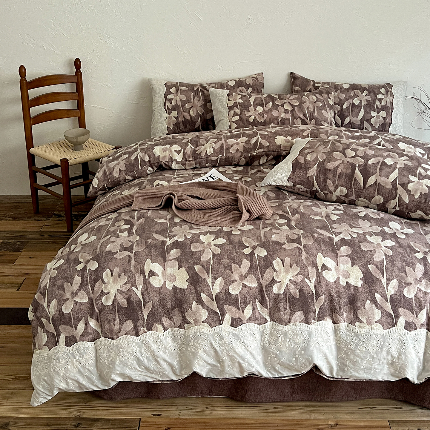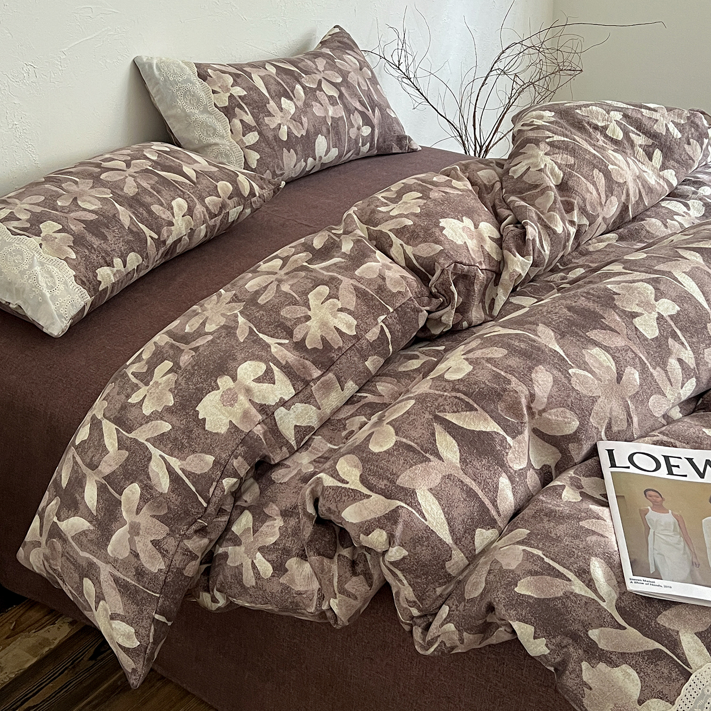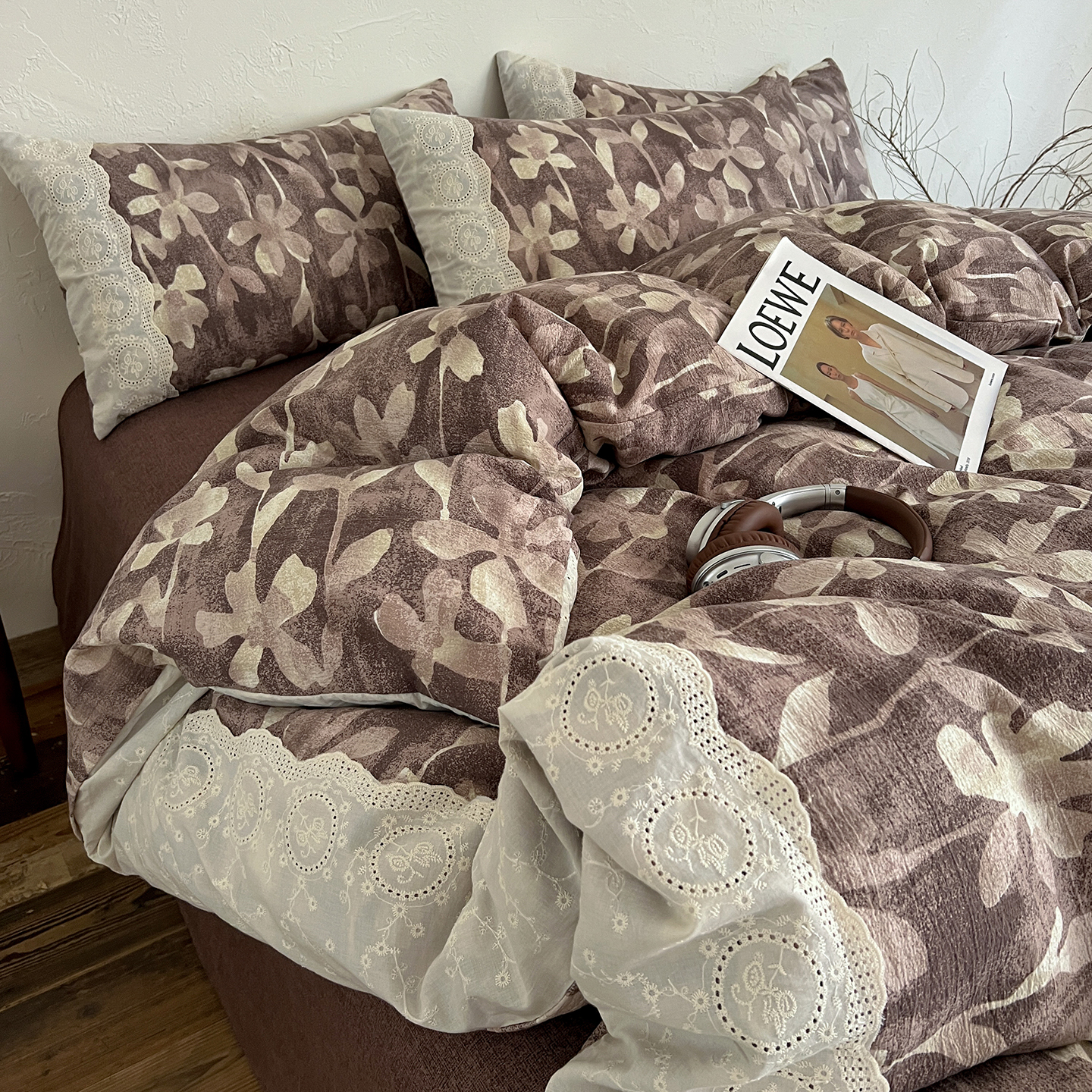 商品名称:一比一家纺 2026秋冬新品高克重原麻复古全棉花边棉麻侘寂风原麻四件套 (控价99元)花影棕
