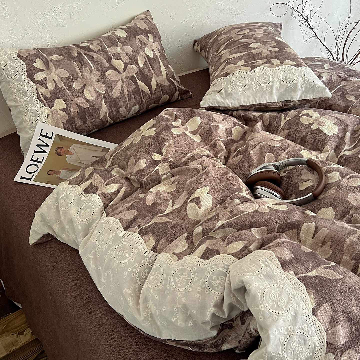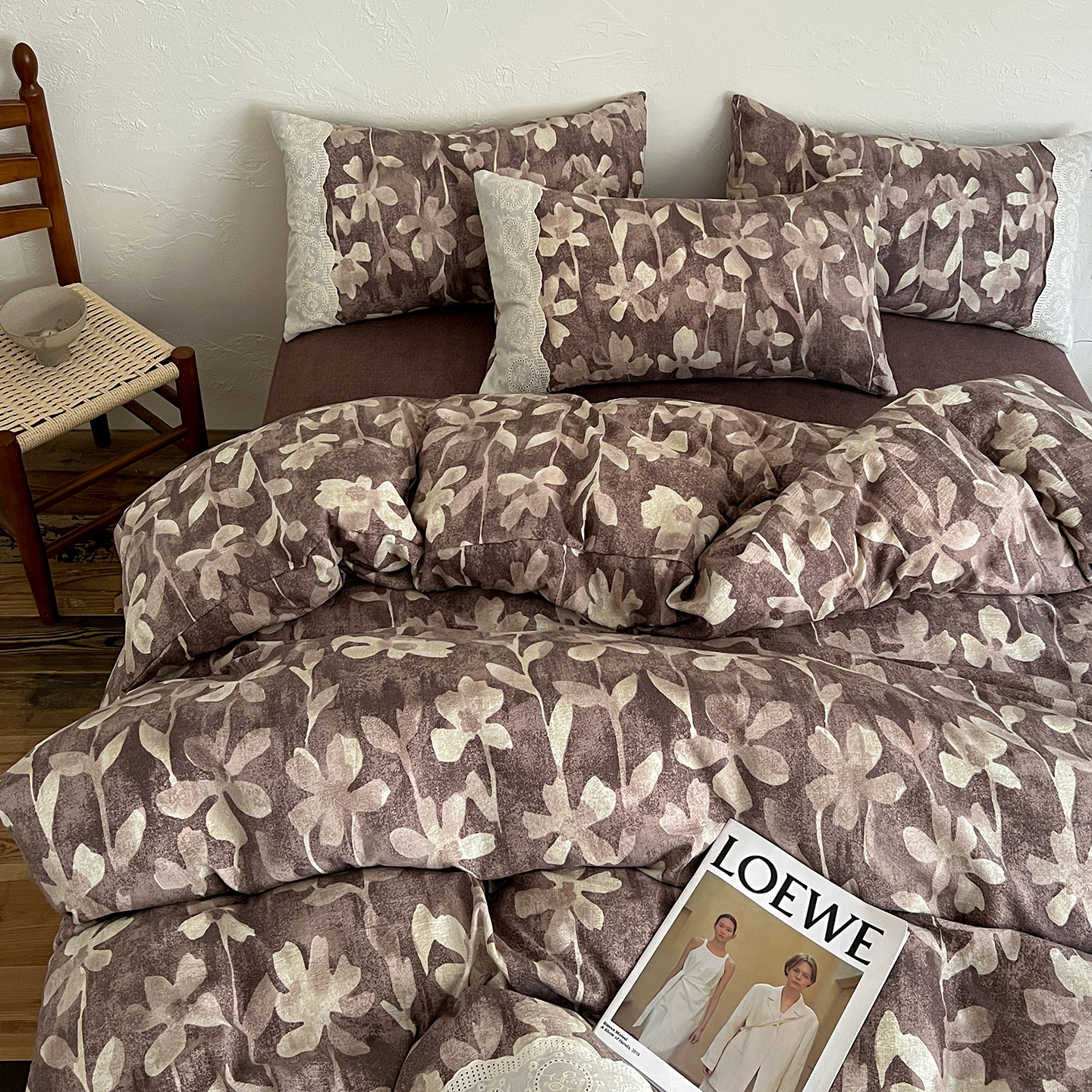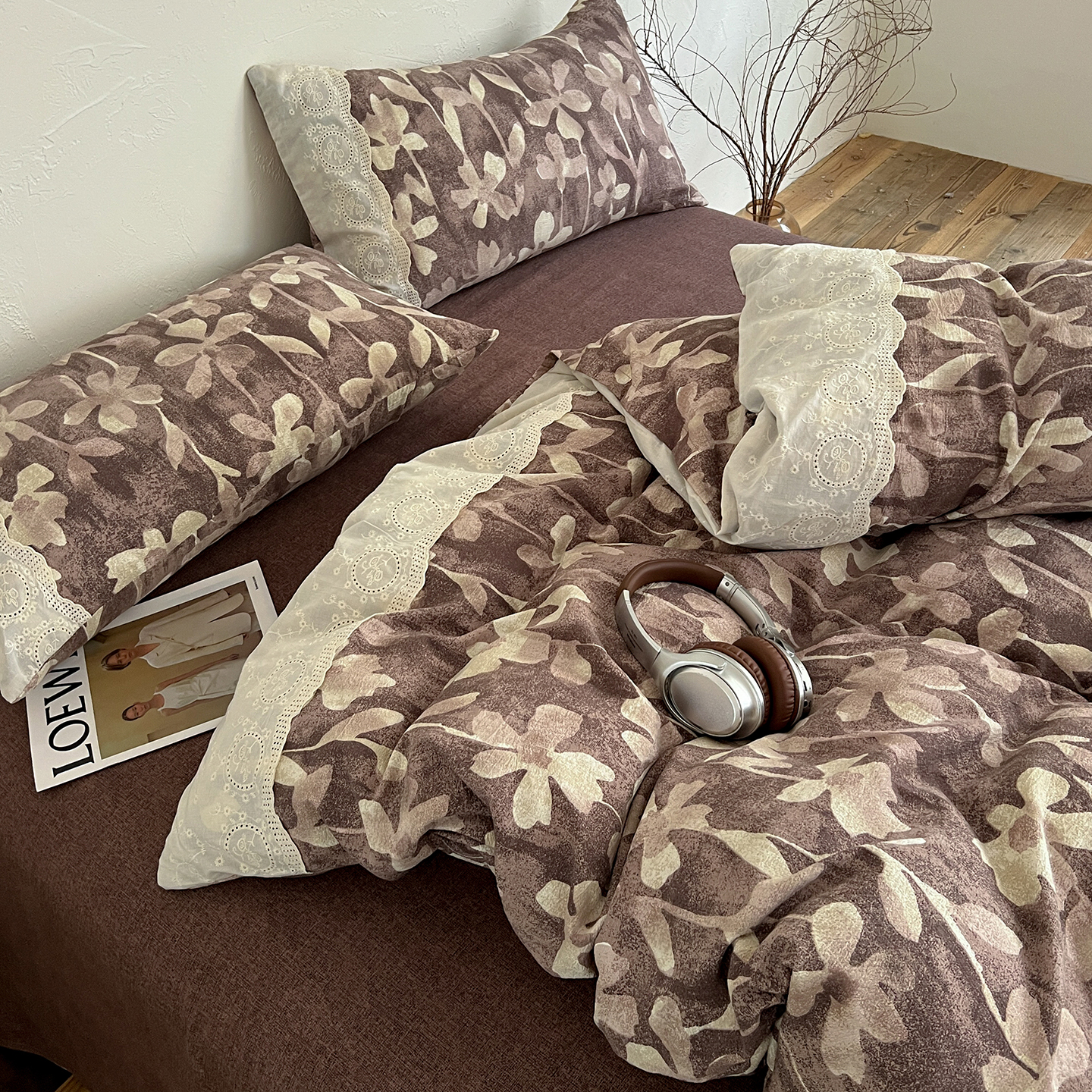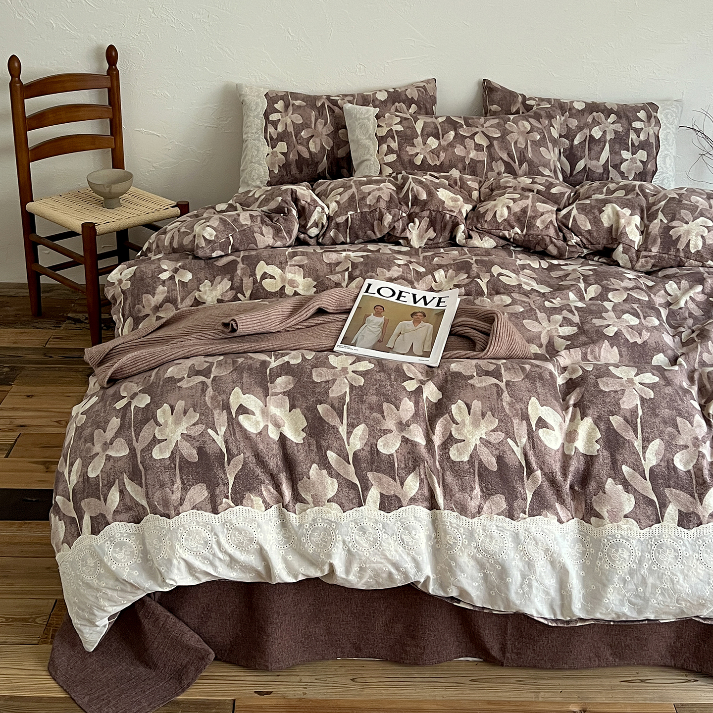 商品名称:一比一家纺 2026秋冬新品高克重原麻复古全棉花边棉麻侘寂风原麻四件套 (控价99元)花影棕