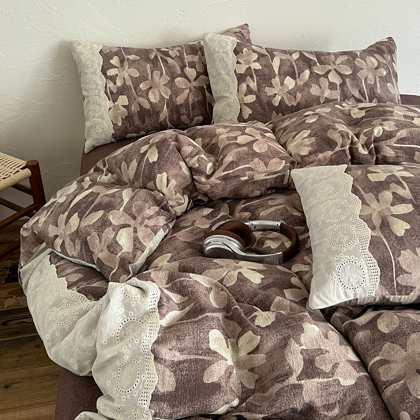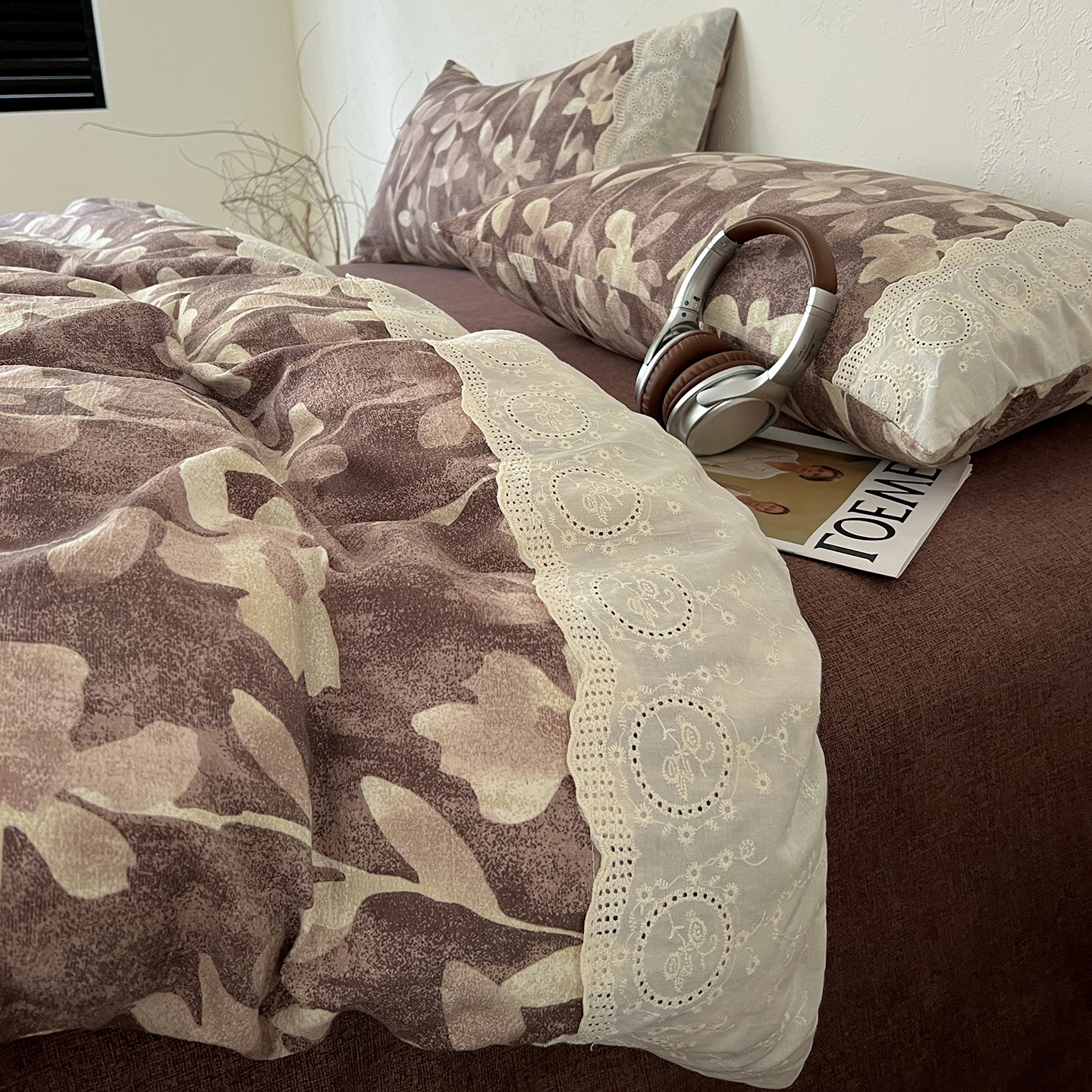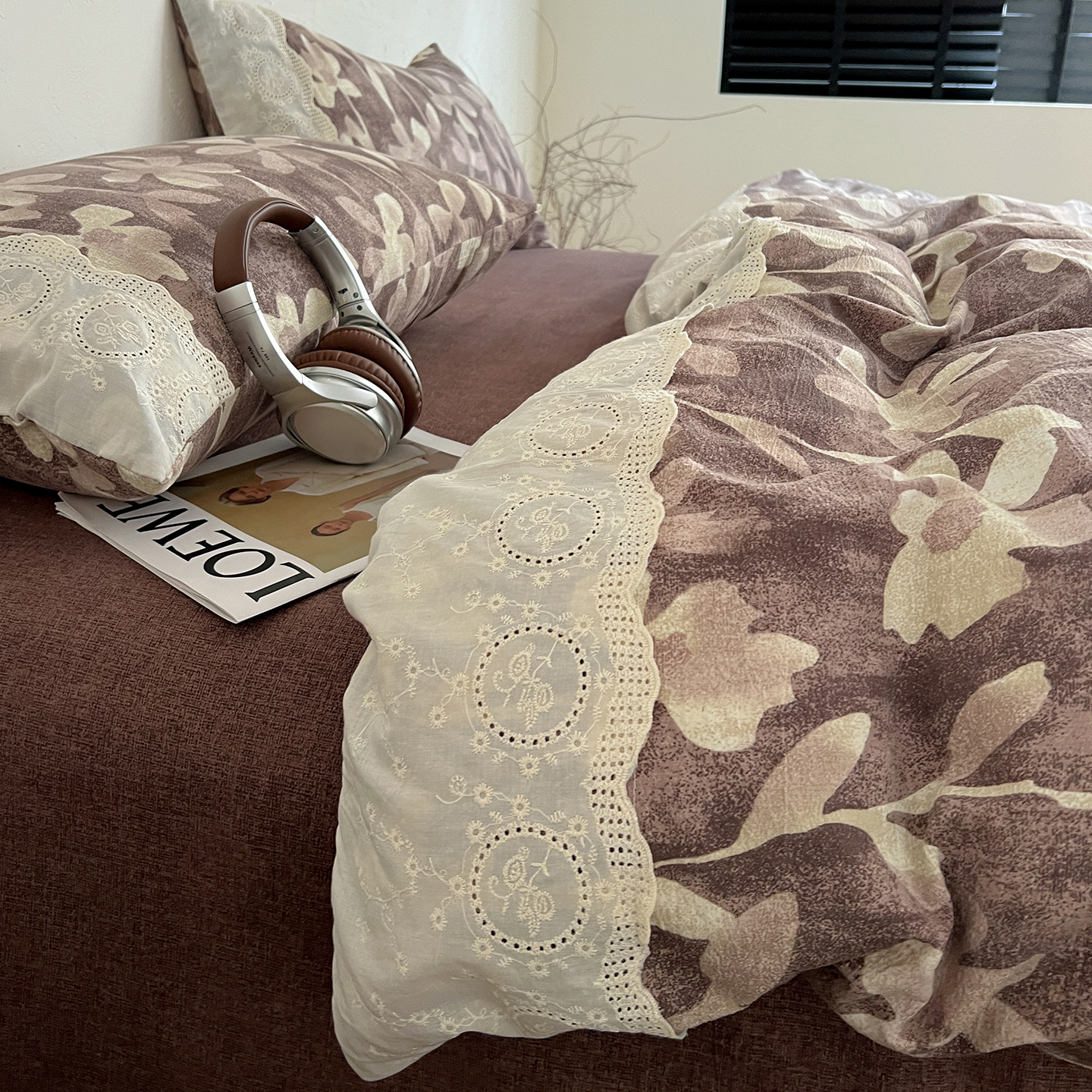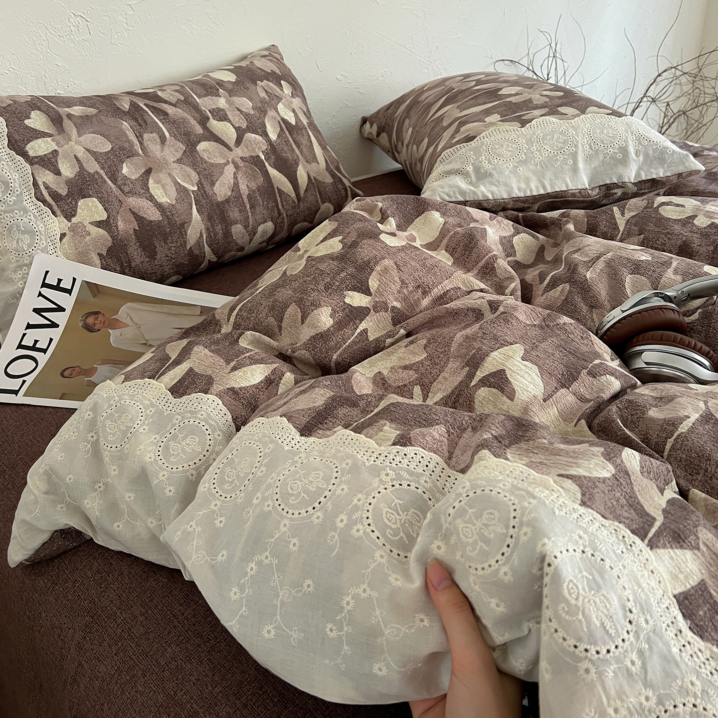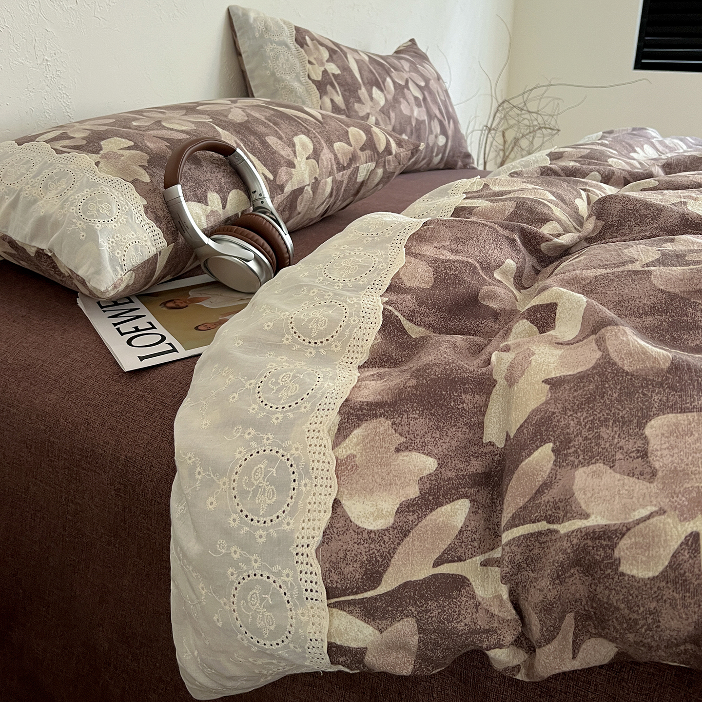 商品名称:一比一家纺 2026秋冬新品高克重原麻复古全棉花边棉麻侘寂风原麻四件套 (控价99元)花影棕