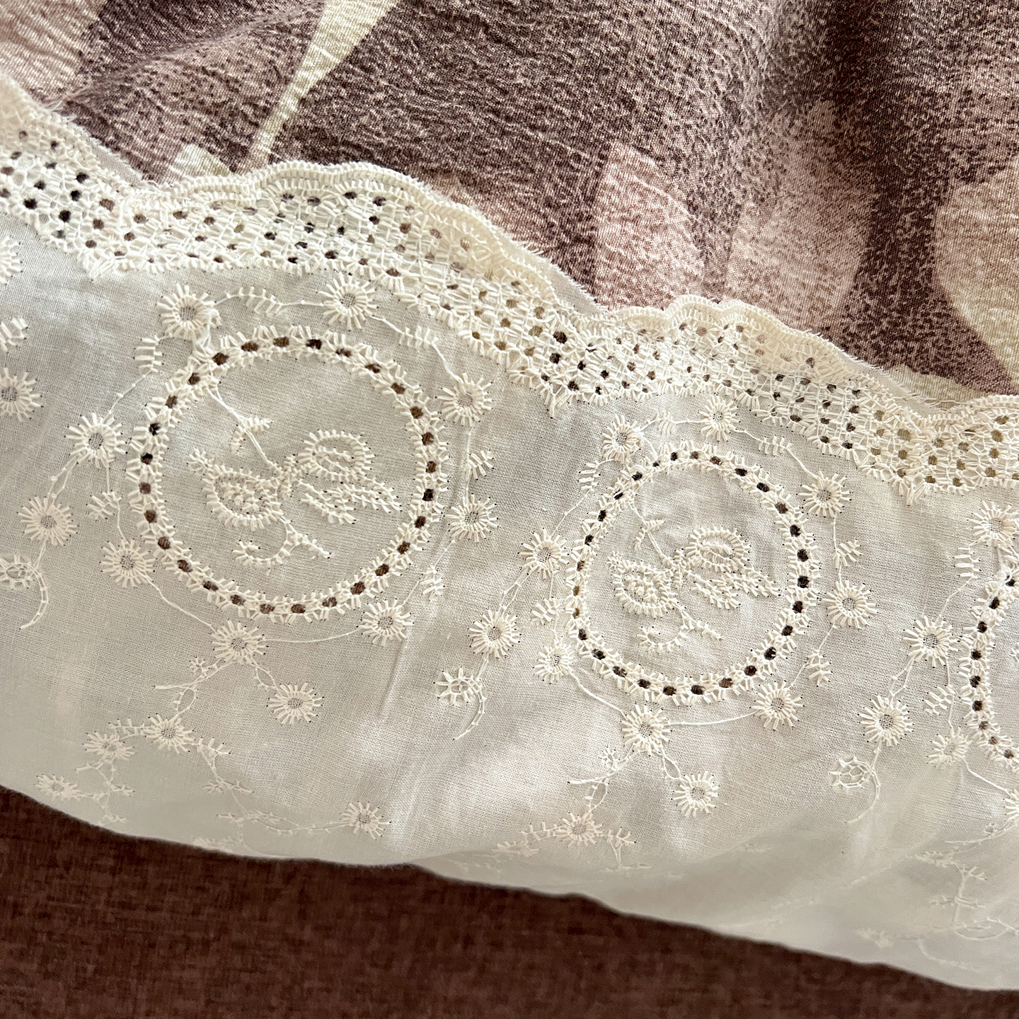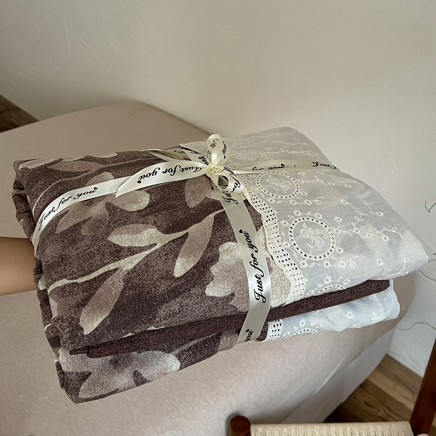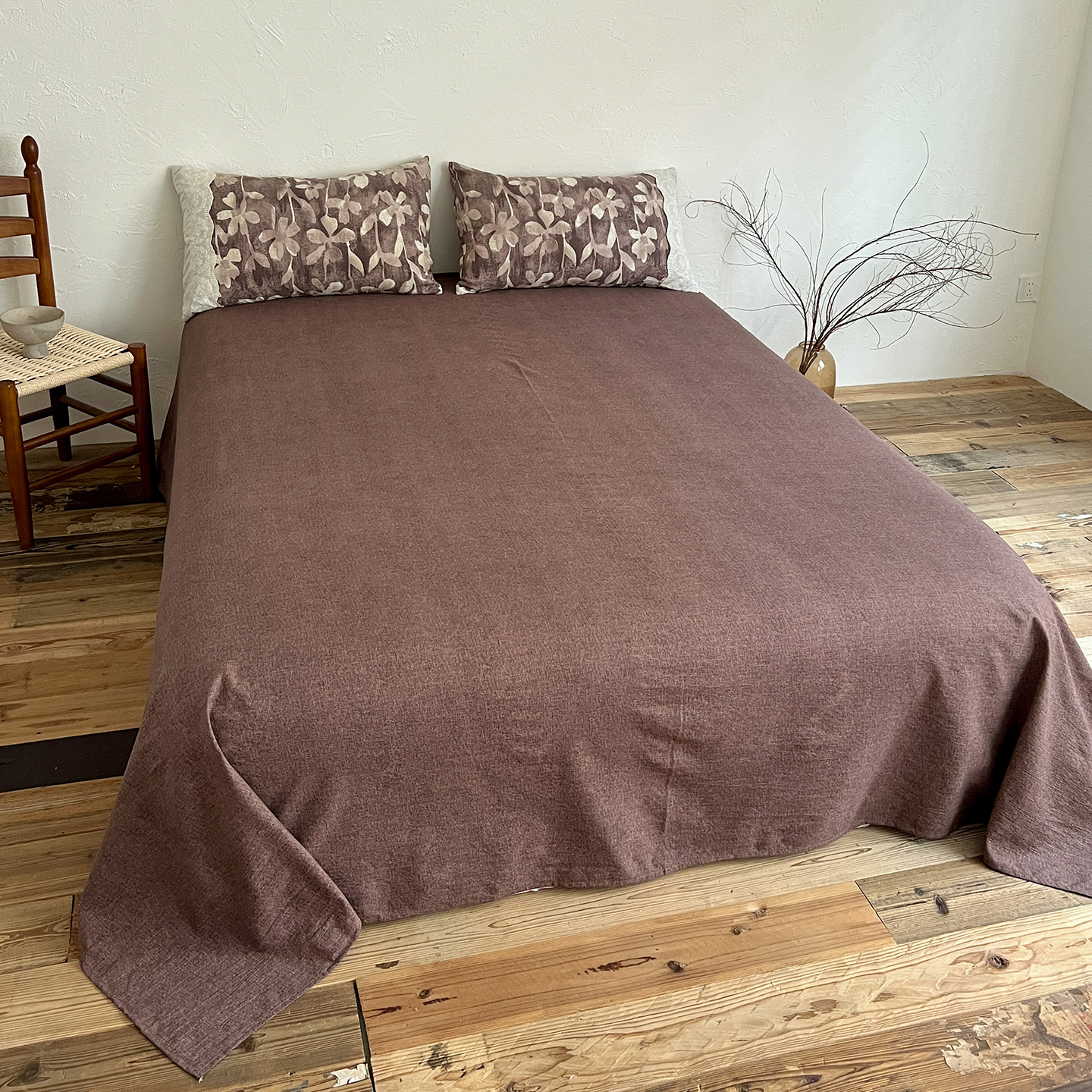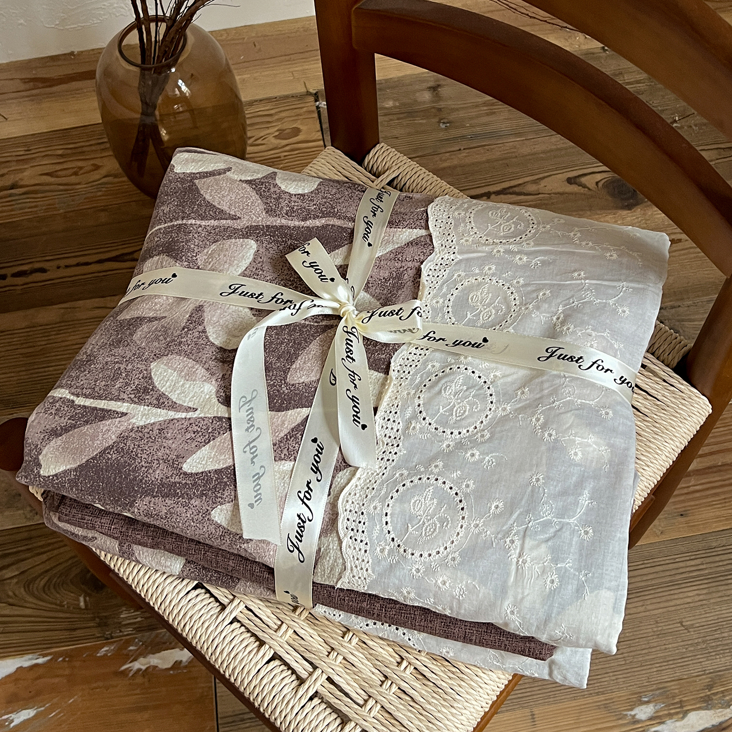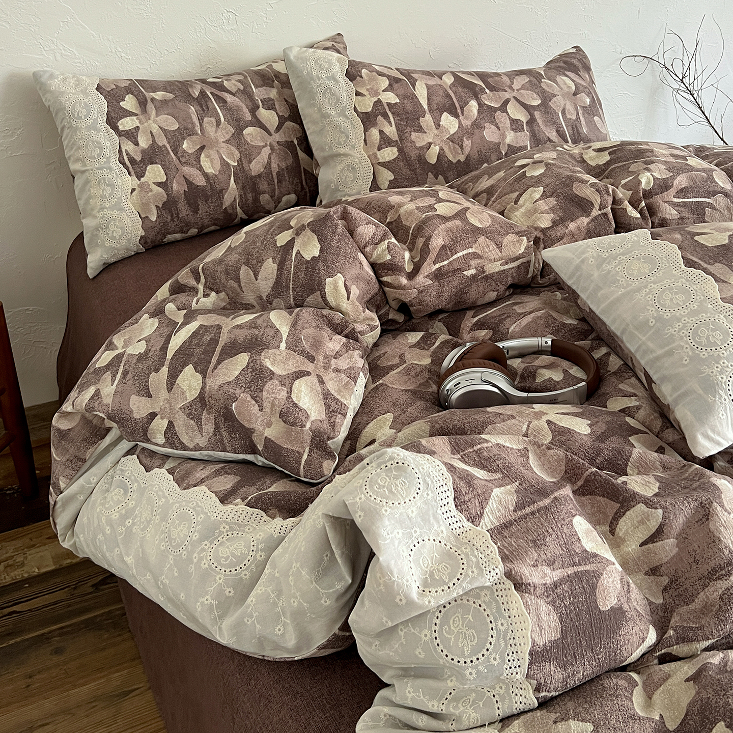 商品名称:一比一家纺 2026秋冬新品高克重原麻复古全棉花边棉麻侘寂风原麻四件套 (控价99元)花影棕