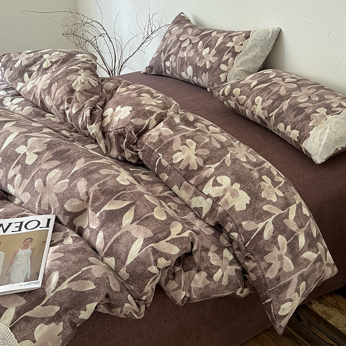 一比一家纺 2026秋冬新品高克重原麻复古全棉花边棉麻侘寂风原麻四件套 (控价99元)花影棕