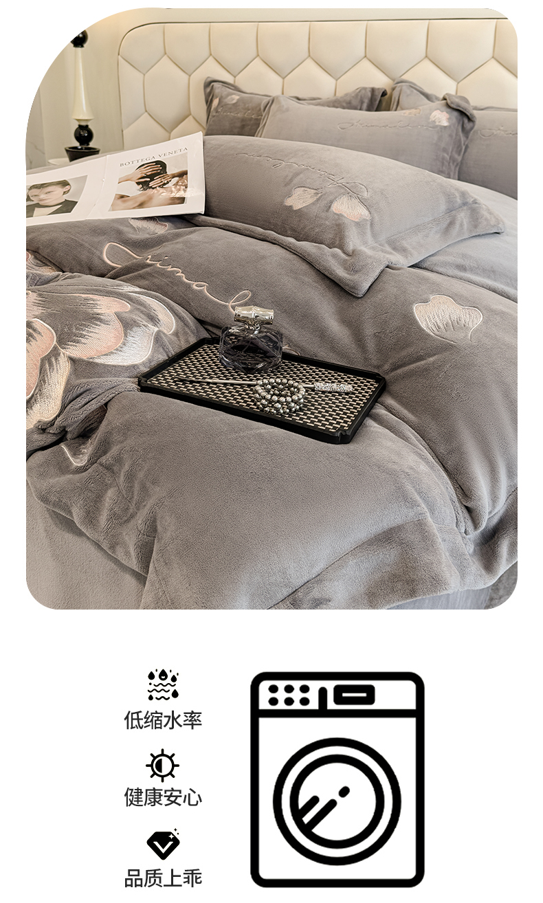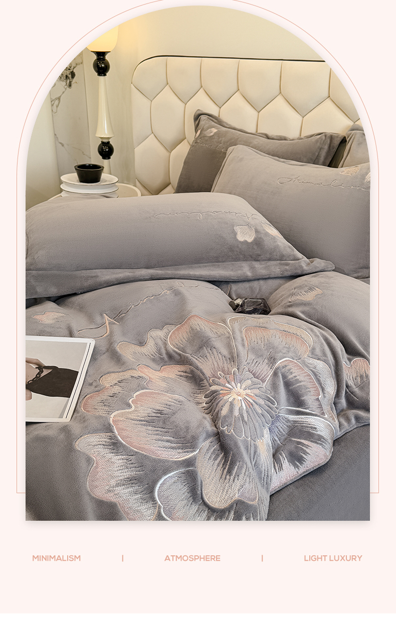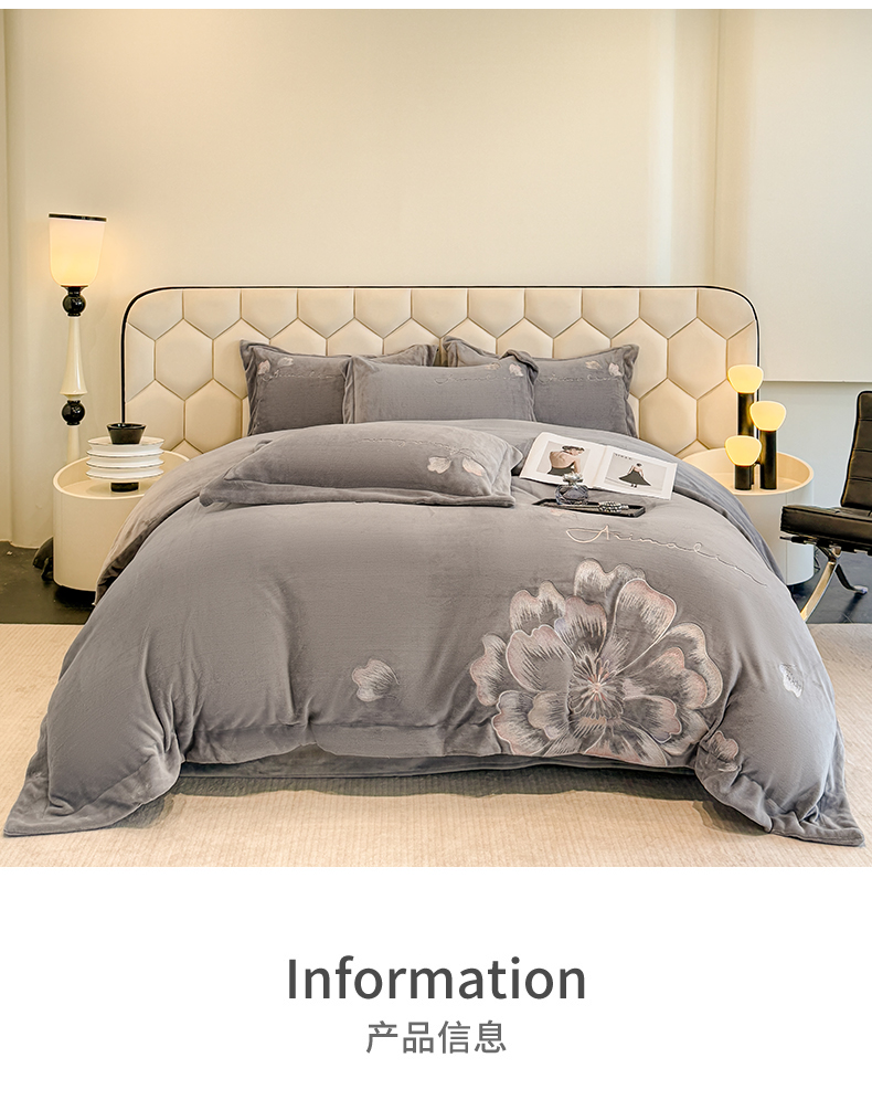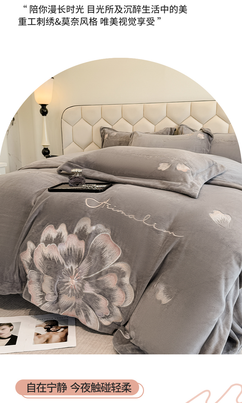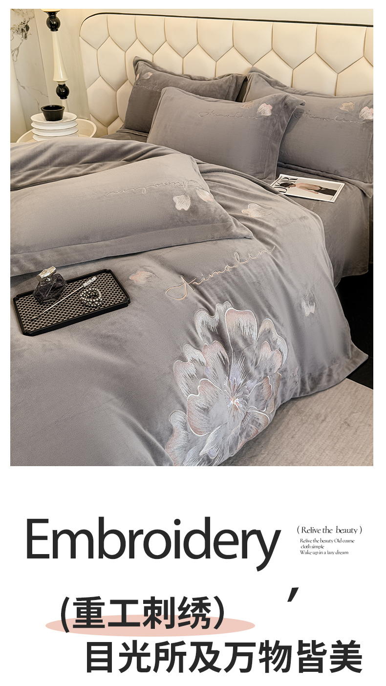 商品名称:狂想家 2025新款刺绣牛奶绒四件套向阳花系列 向阳花-高级灰