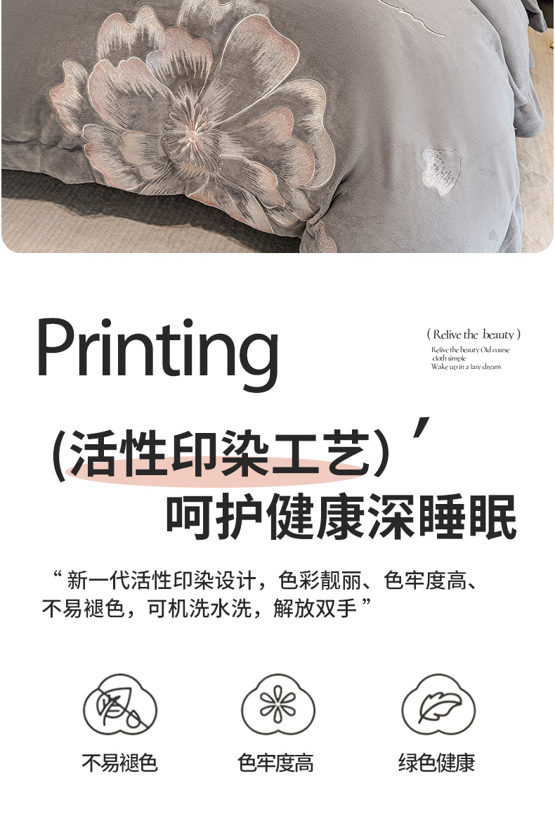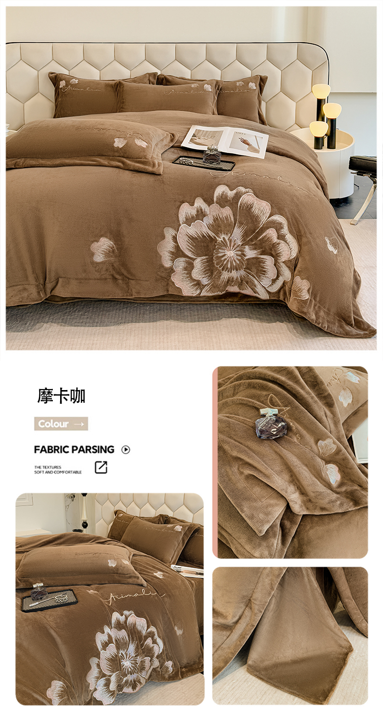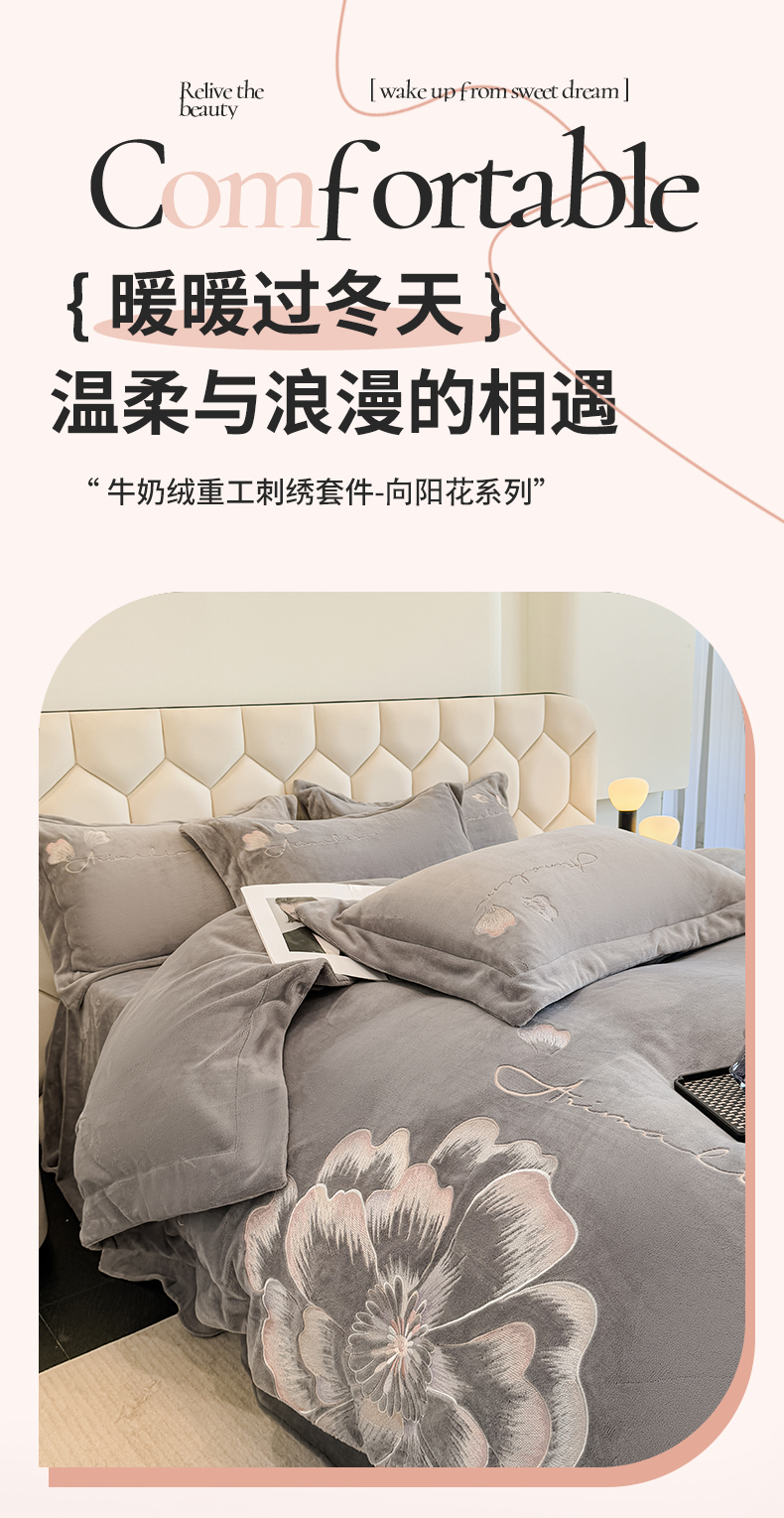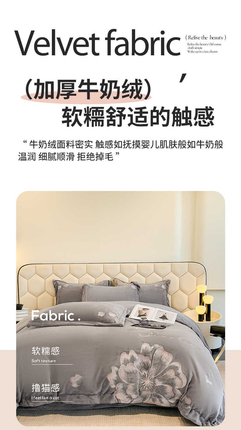 商品名称:狂想家 2025新款刺绣牛奶绒四件套向阳花系列 向阳花-高级灰