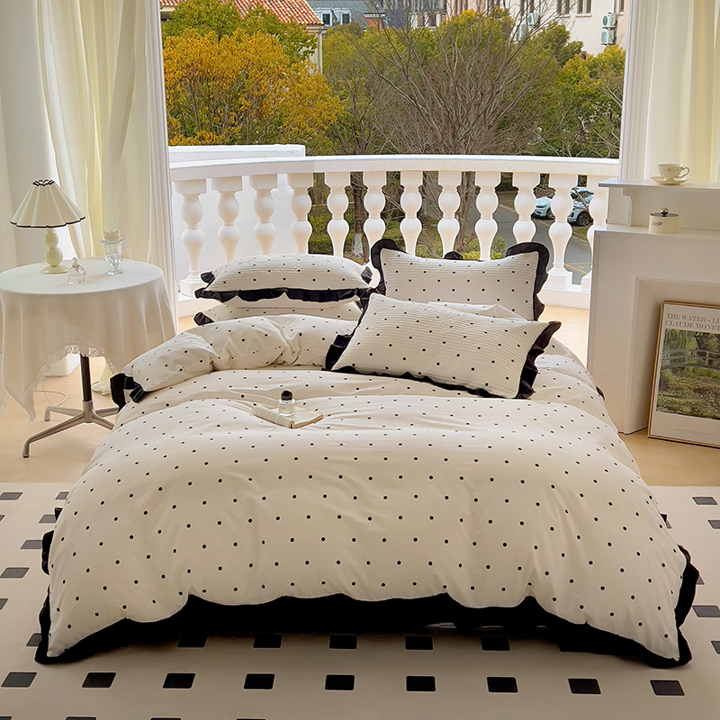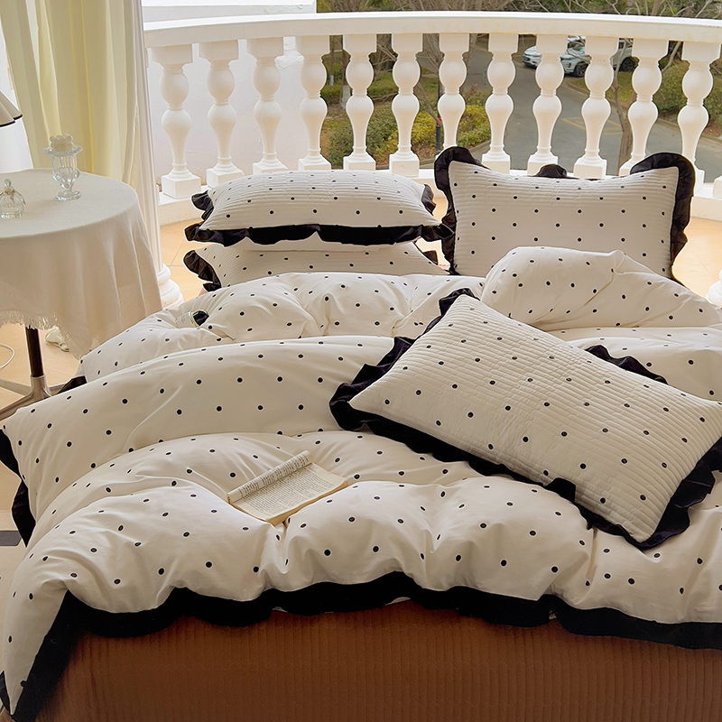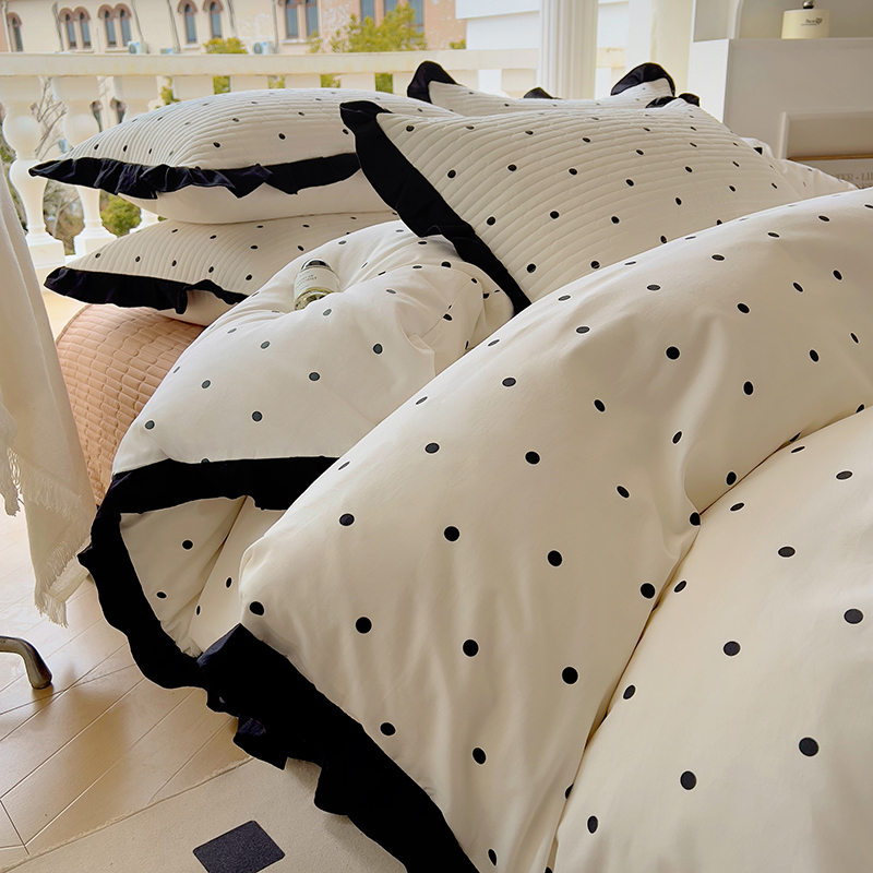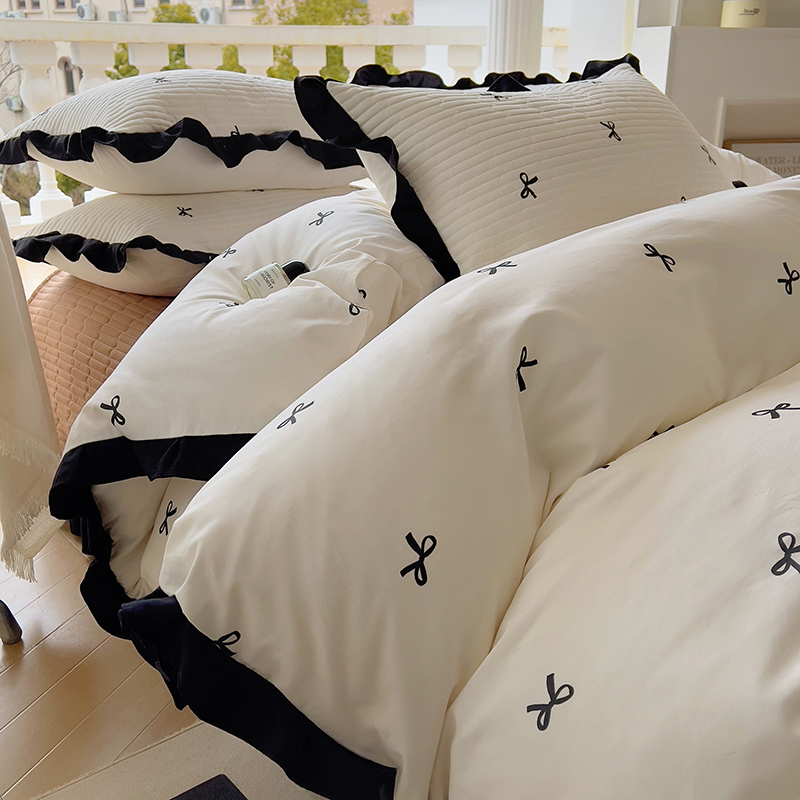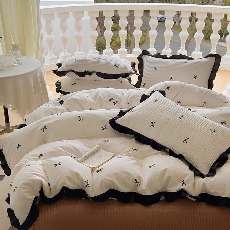 (总)美梦家纺 2025新款A类全棉13372花边床盖四件套-黑边,波点,蝶恋花,敦敦熊,浮绘花影,蝴蝶结,莱茵河畔白