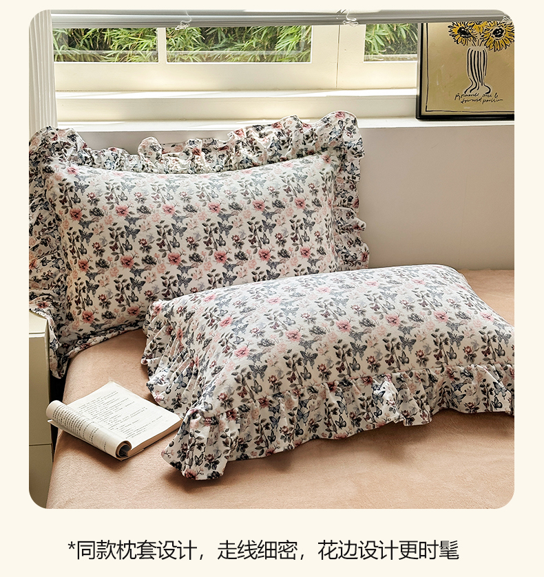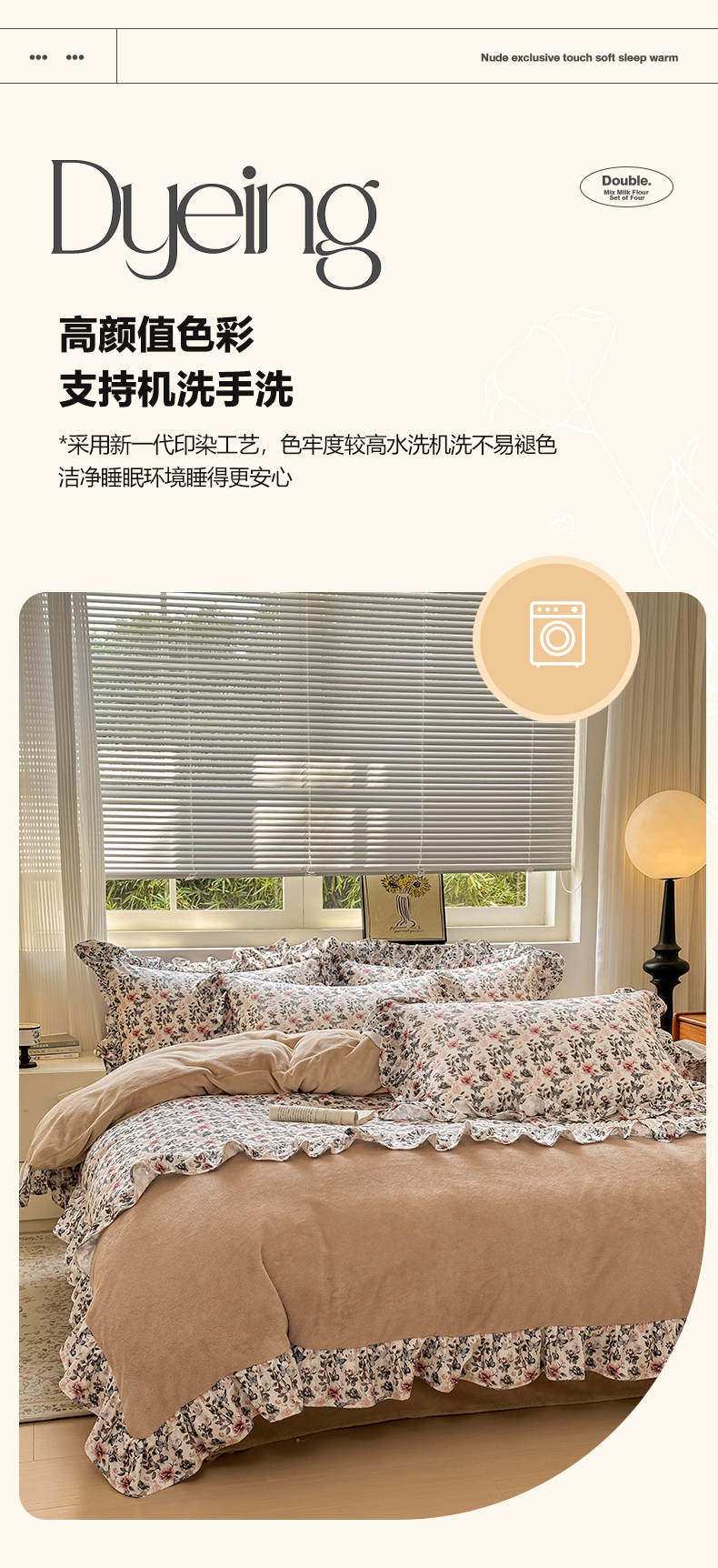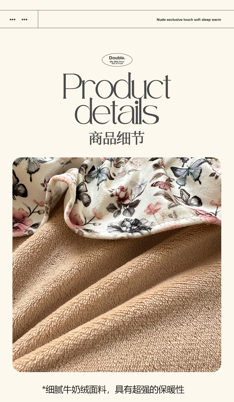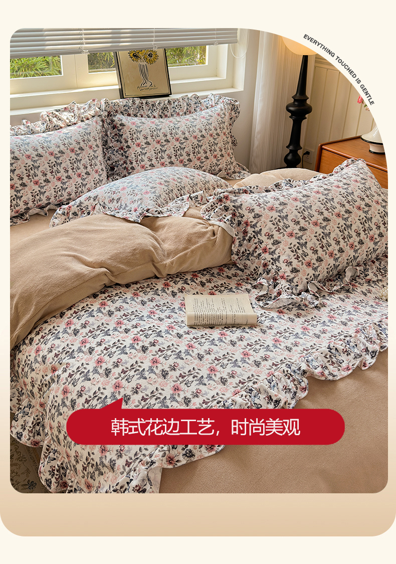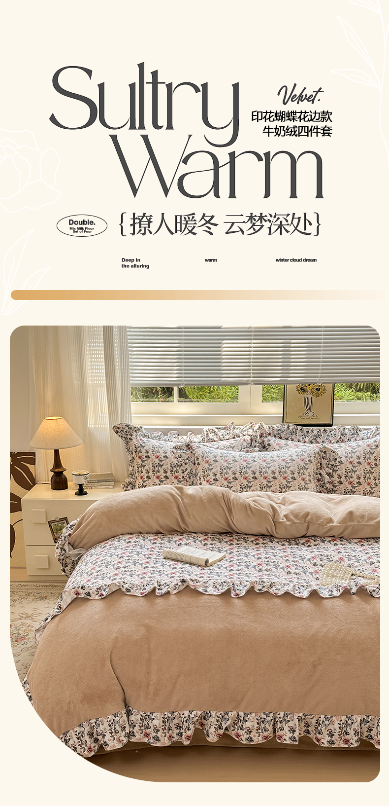 当前位置: 91家纺网 > 商品网购 > 床品套件 > 四件套 > 牛奶绒四件套 > 兰紫橙家纺 2025新款印花蝴蝶花边款牛奶绒四件套 花边款-奶油驼