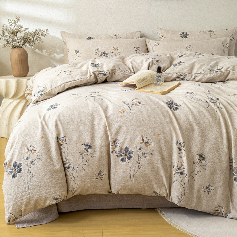 七里香 2025秋冬新品A类加厚高克重原麻复古风亚麻皱皱纱印花四件套 花蕾-咖