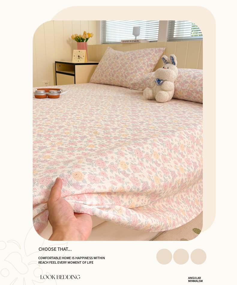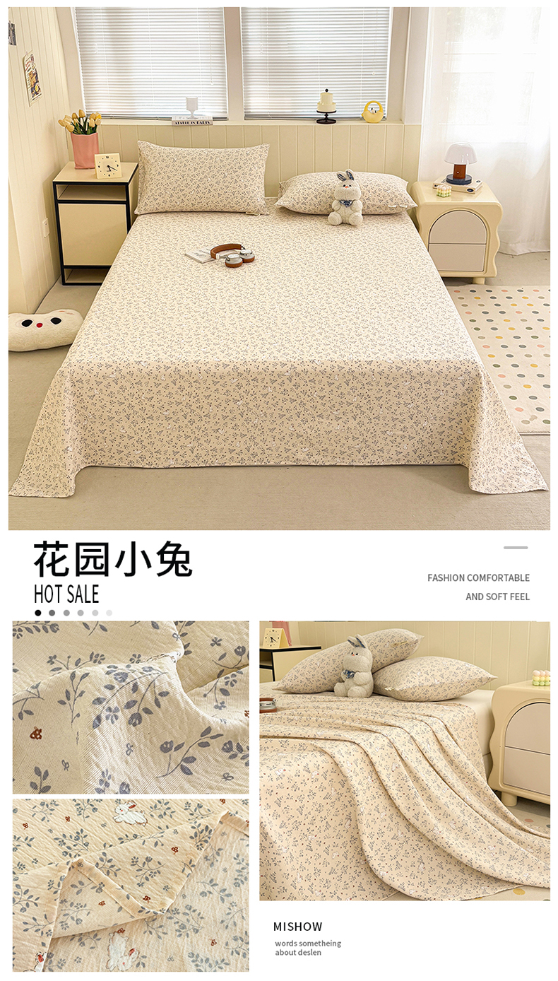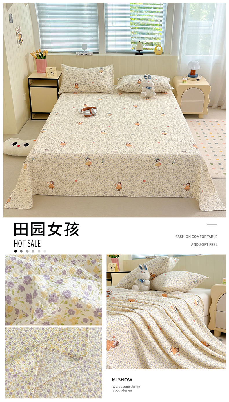 (总)青泽家纺 2025新款水洗棉皱皱纱双层纱床单三件套,芝士奶酪,半亩花田,田园女孩,疏影之心,南瓜派对,萌兔兔,萌宠乐园,梨花落,花园小兔,花间序语,海盐耶耶,乖乖象,格子小狗,豆蔻年华,花轻舞,半岛红茶