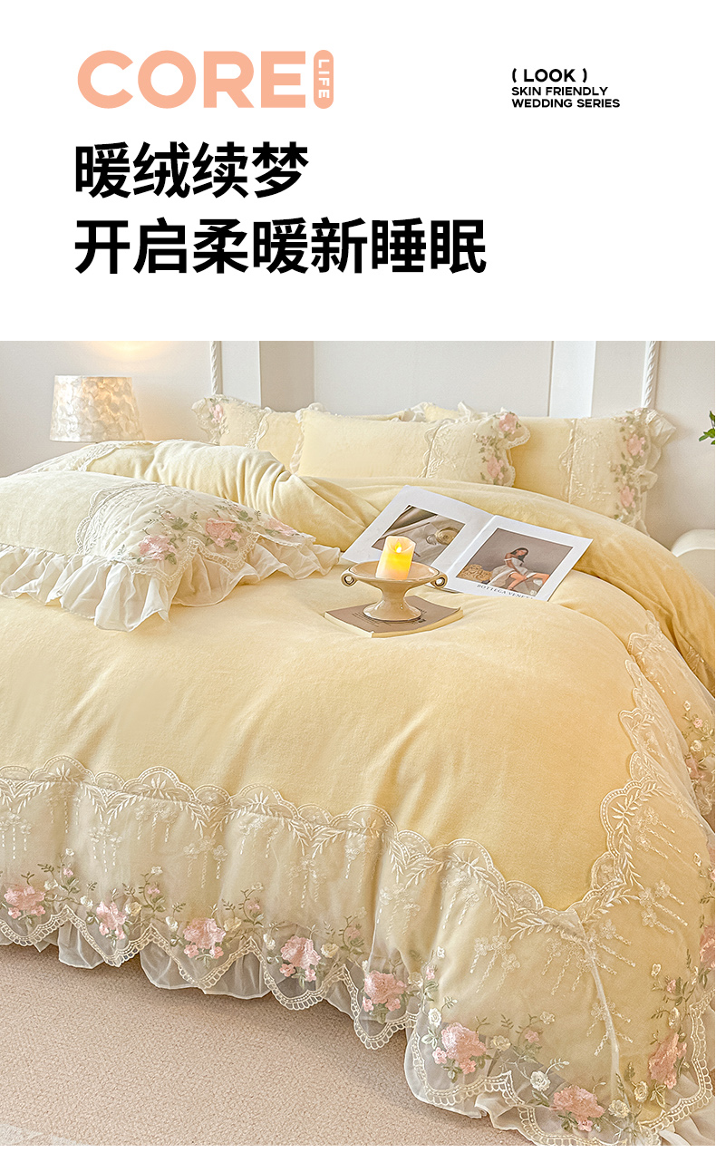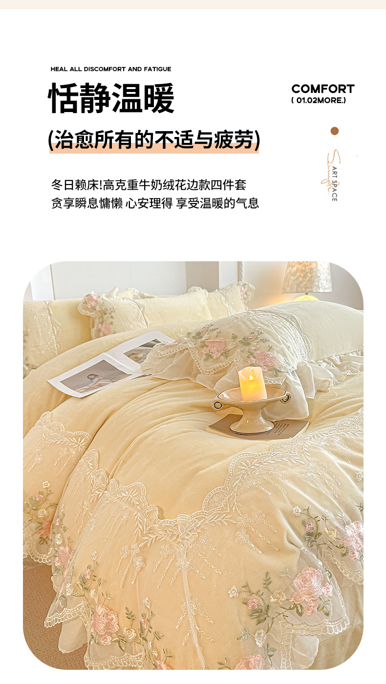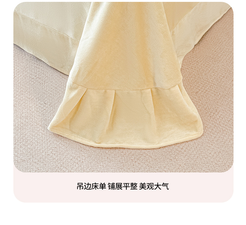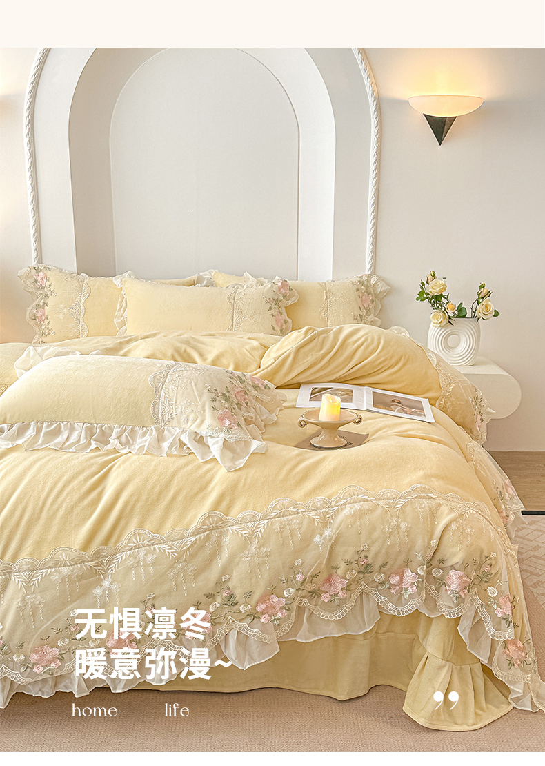 当前位置: 91家纺网 > 商品网购 > 床品套件 > 四件套 > 牛奶绒四件套 > 凯美家居 2025新款A类牛奶绒蕾丝刺绣四件套-锦上添花 锦上添花-浅黄