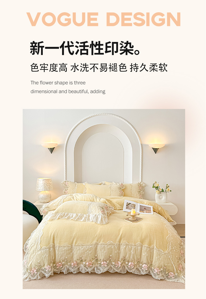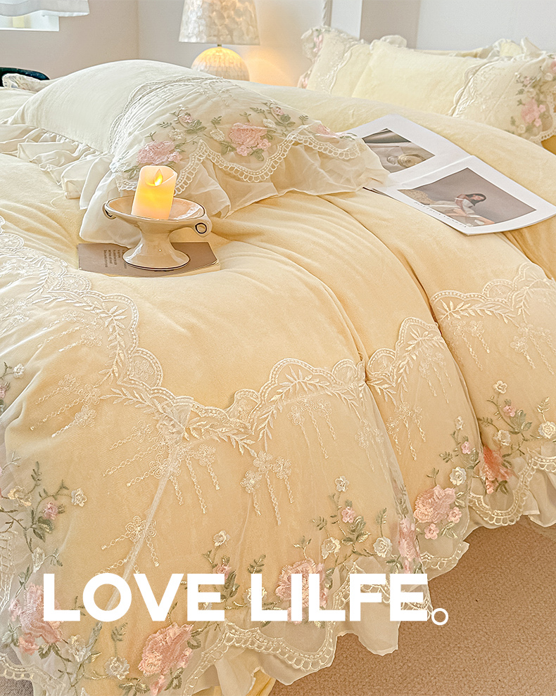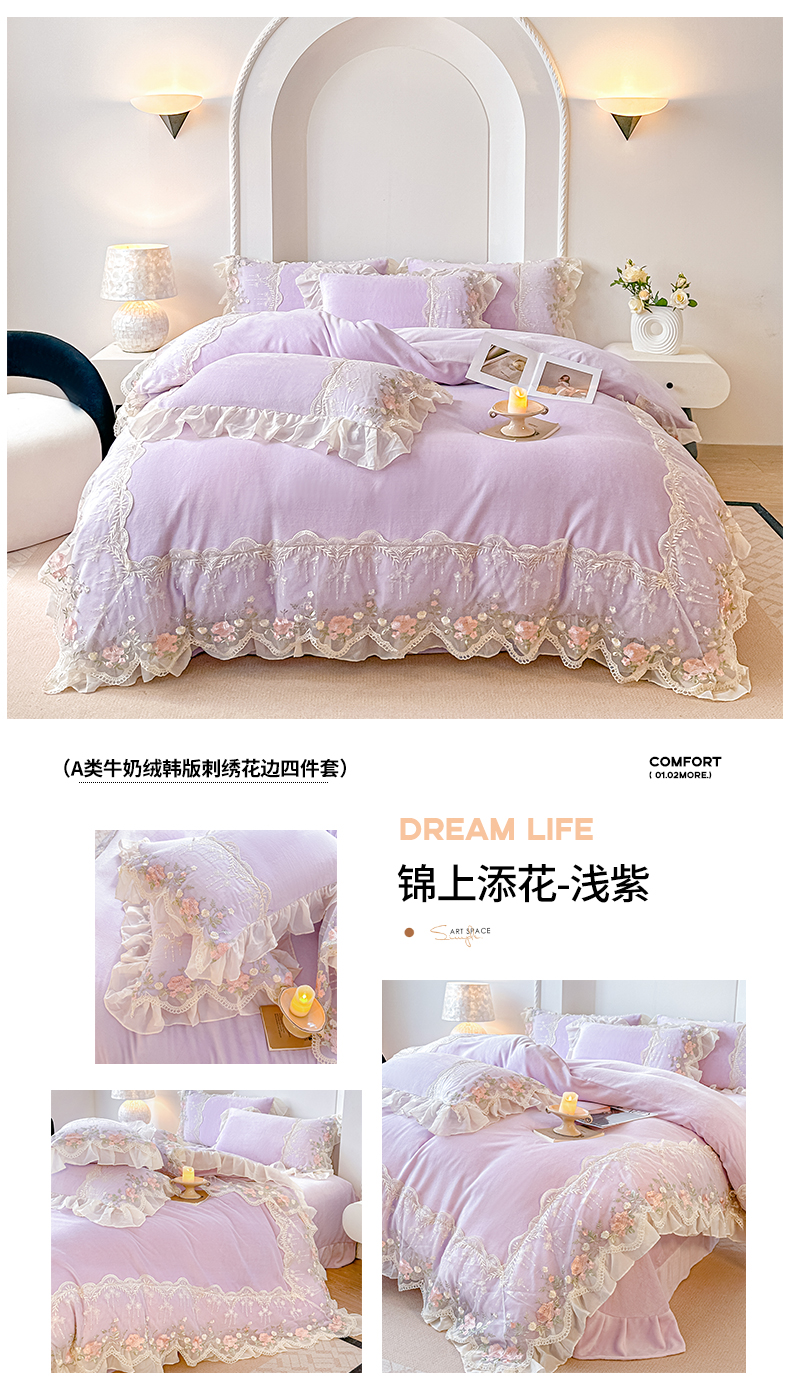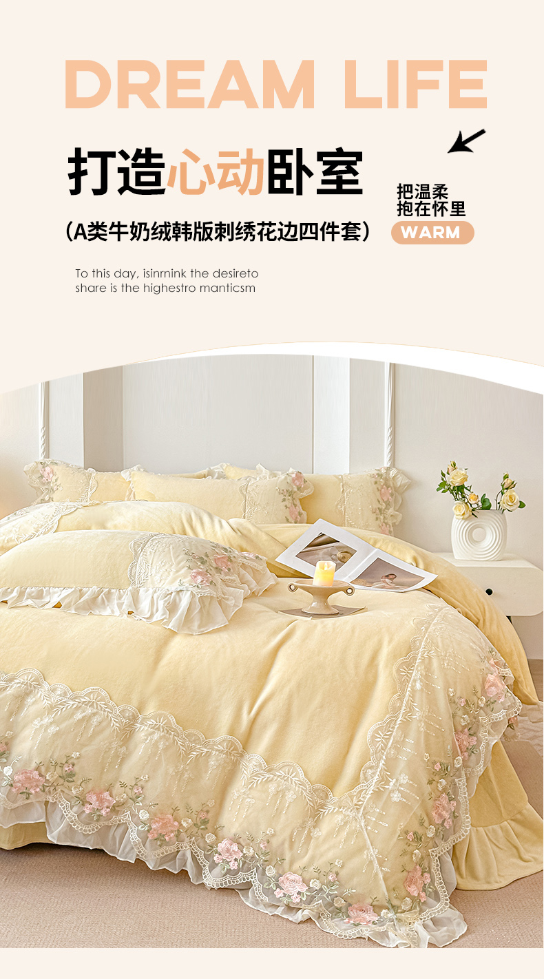 当前位置: 91家纺网 > 商品网购 > 床品套件 > 四件套 > 牛奶绒四件套 > 凯美家居 2025新款A类牛奶绒蕾丝刺绣四件套-锦上添花 锦上添花-浅黄