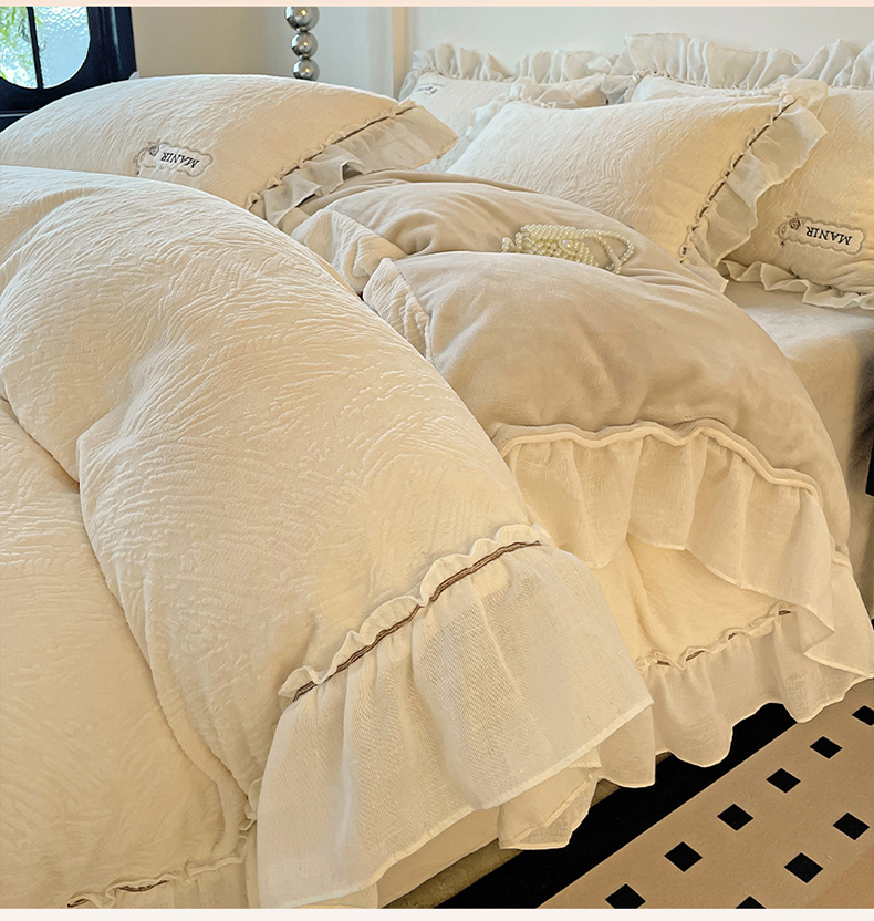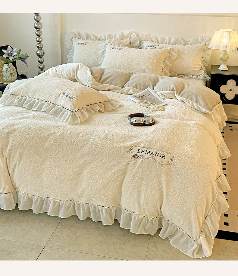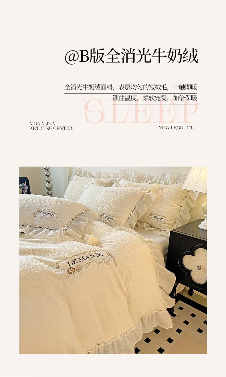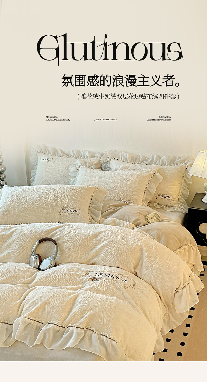 十方家居 2025新款9斤加厚雕花绒全棉纱布韩版双层花边贴布绣高克重全消光牛奶绒四件套 乐漫-奶昔白