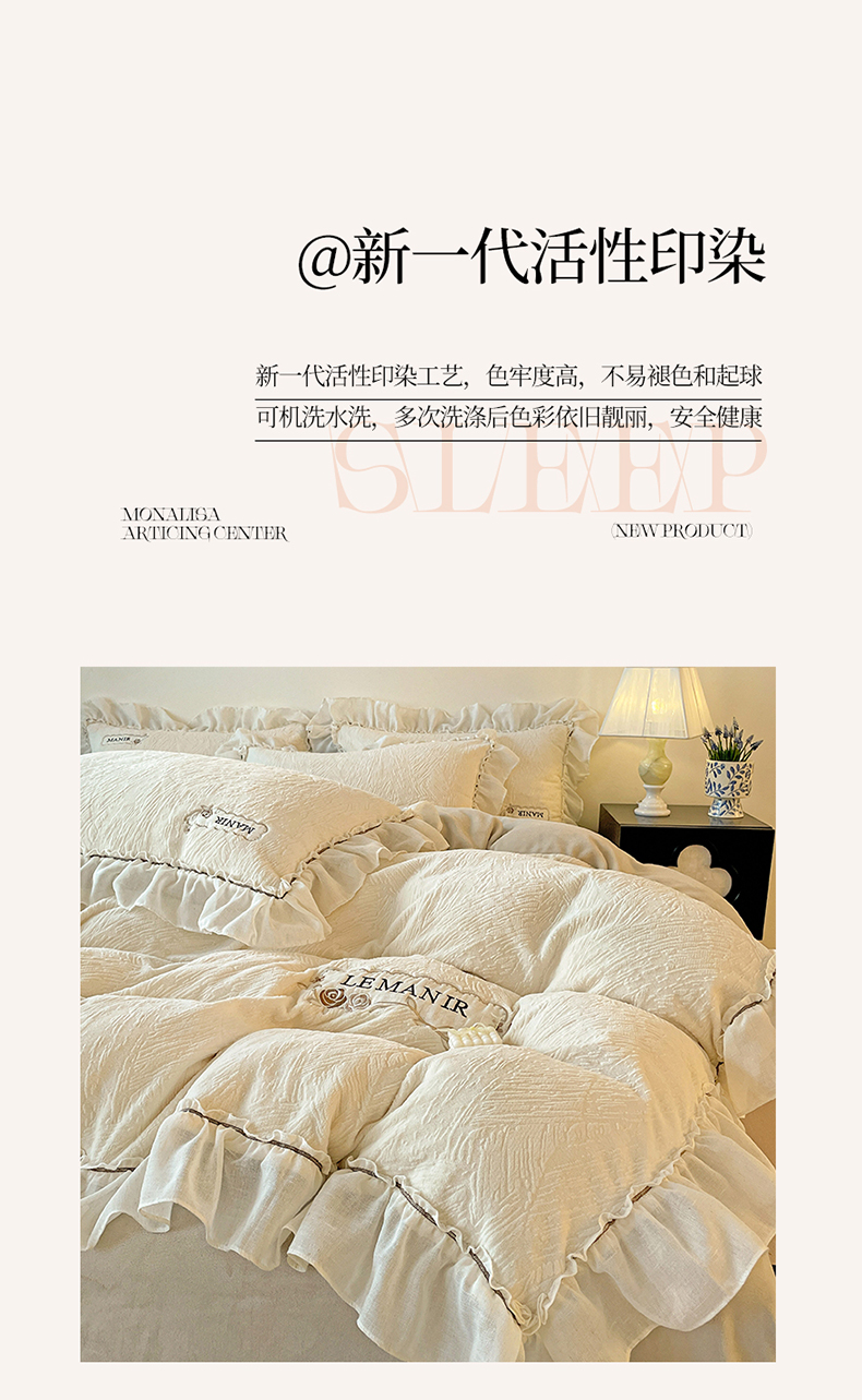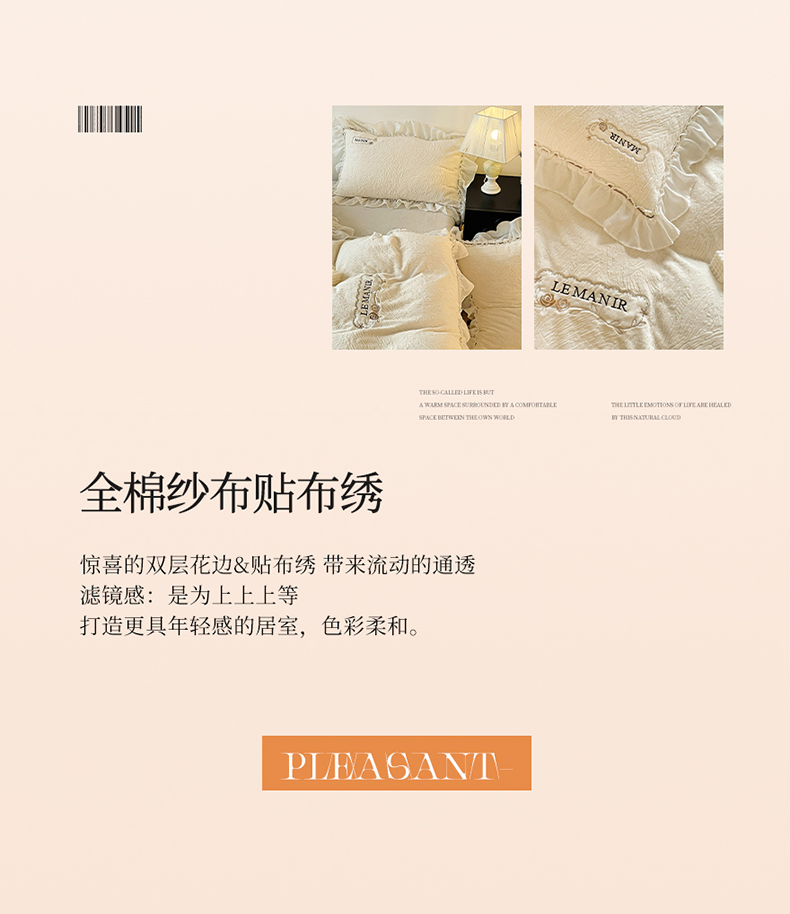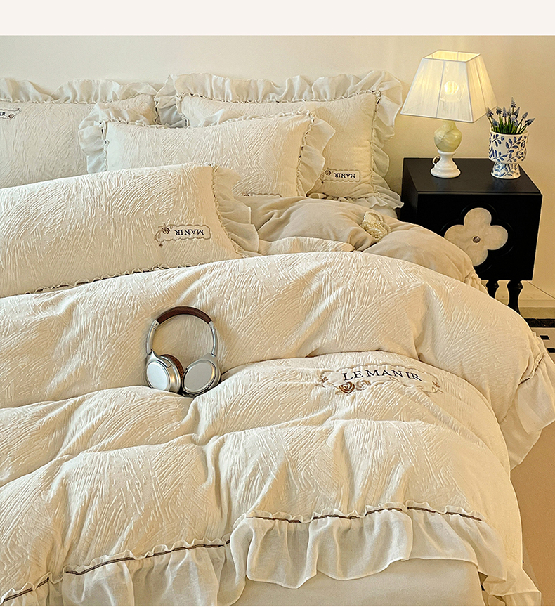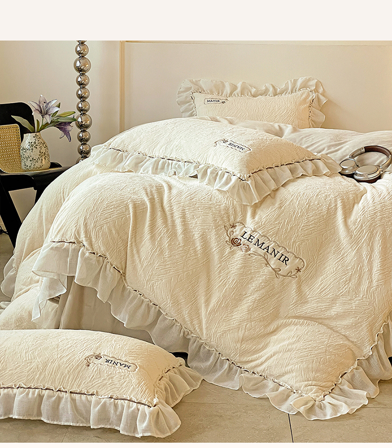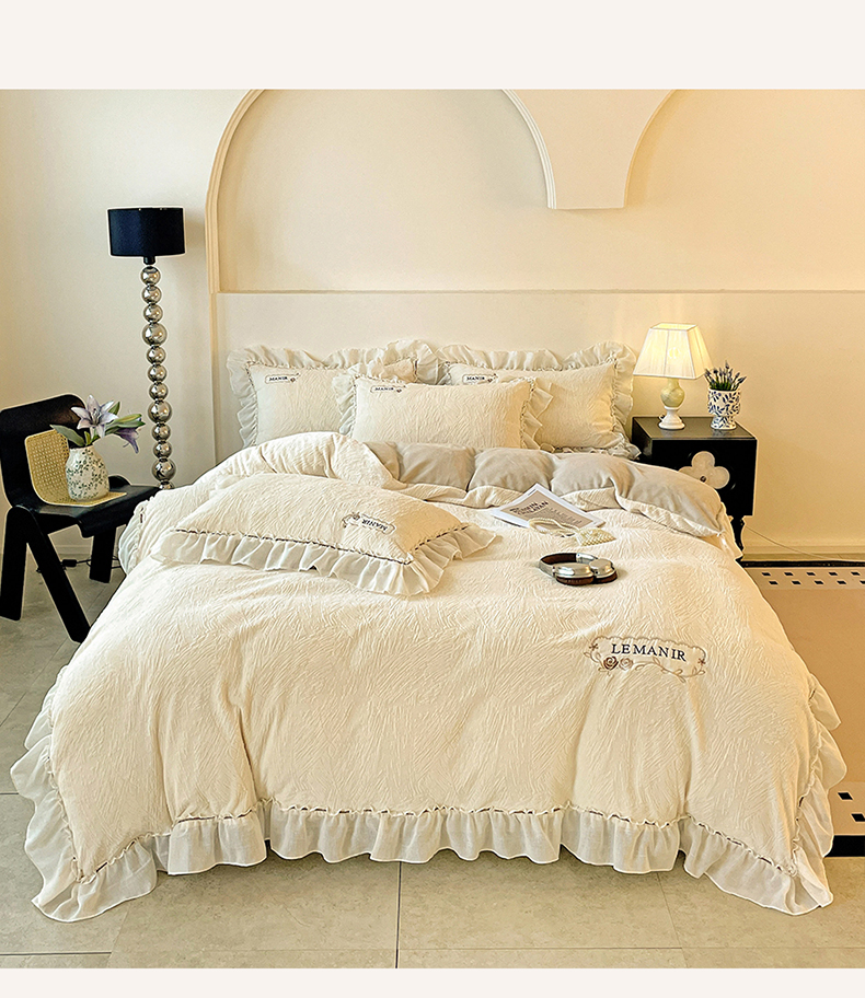 十方家居 2025新款9斤加厚雕花绒全棉纱布韩版双层花边贴布绣高克重全消光牛奶绒四件套 乐漫-奶昔白