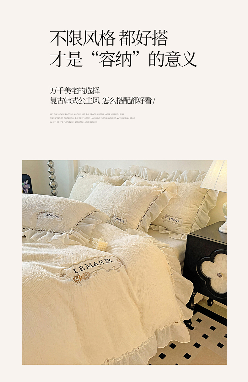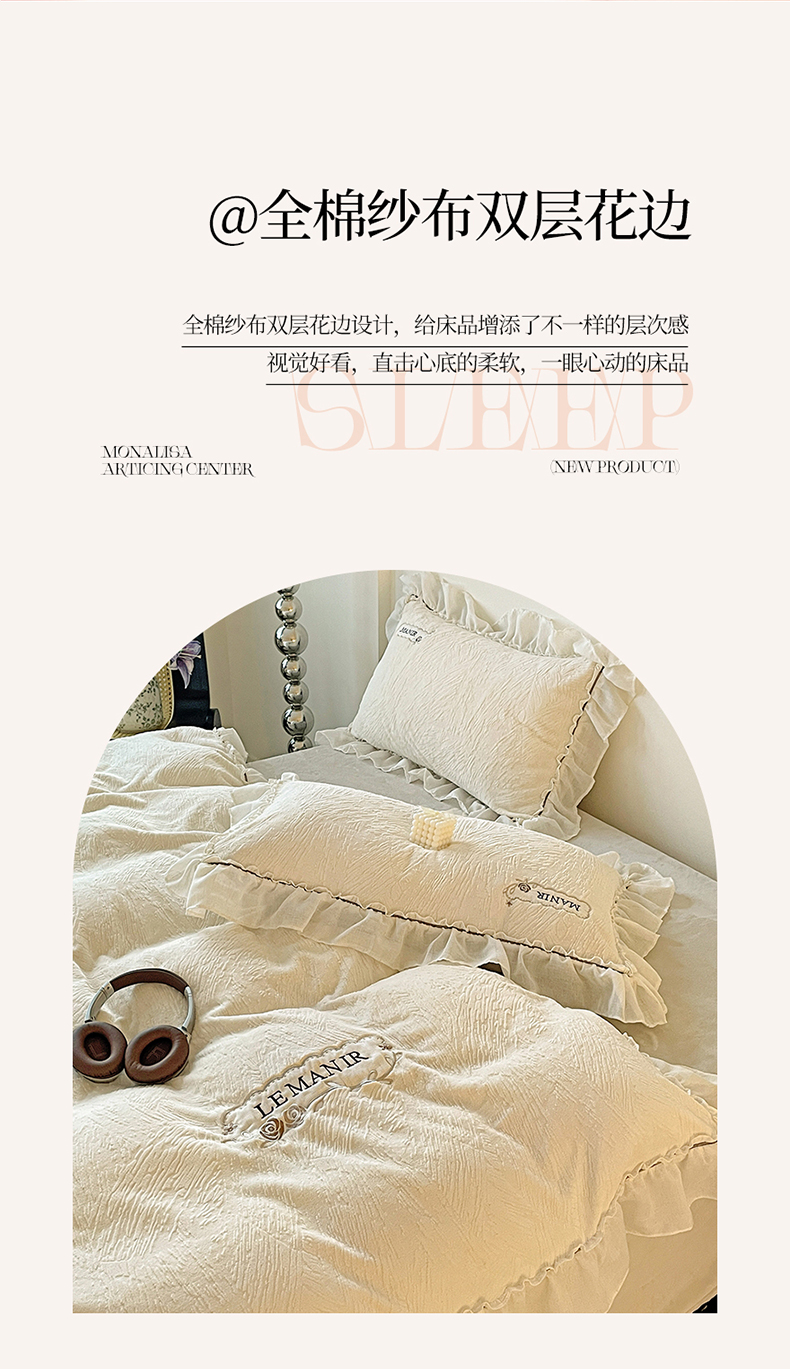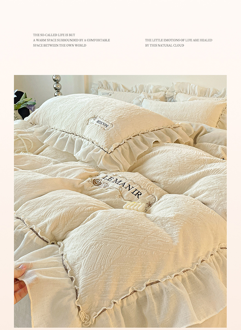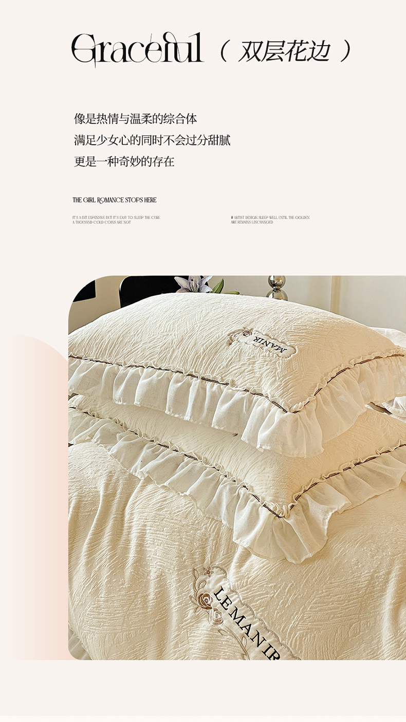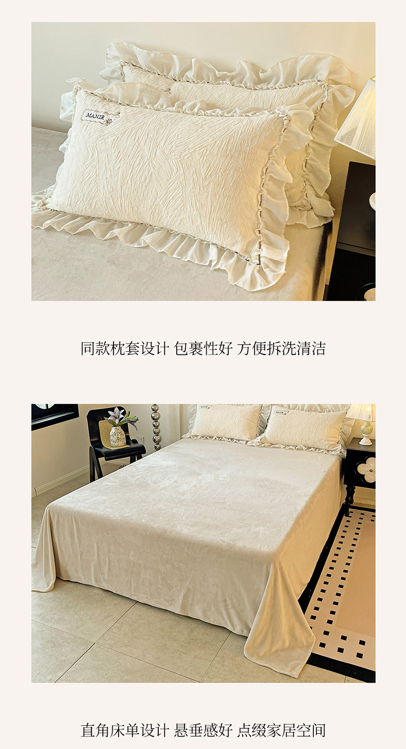 商品名称:十方家居 2025新款9斤加厚雕花绒全棉纱布韩版双层花边贴布绣高克重全消光牛奶绒四件套 乐漫-奶昔白