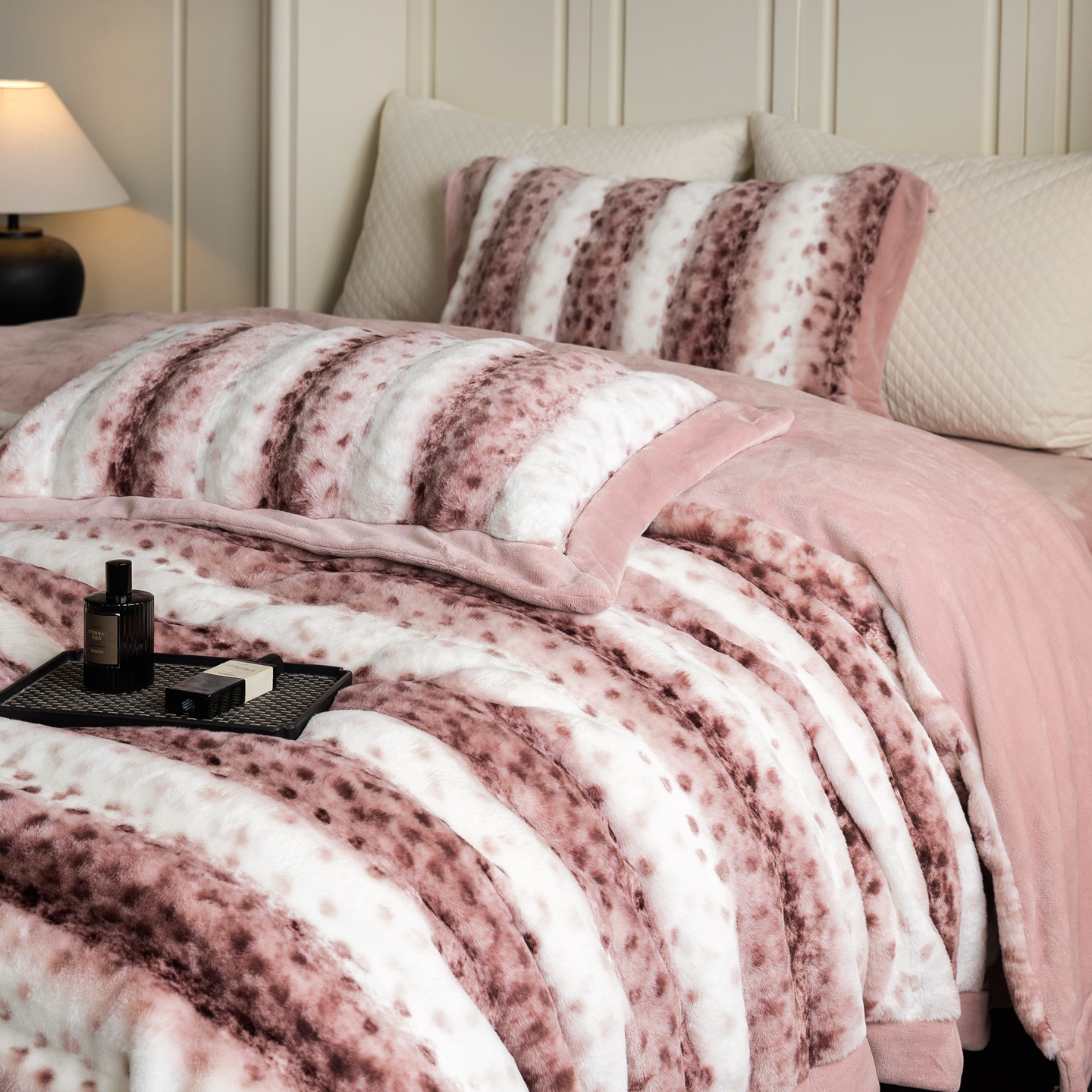 商品名称:时亿家居 2025新款360g兔毛绒拼接牛奶绒四件套-波点兔毛 波点兔毛-深粉