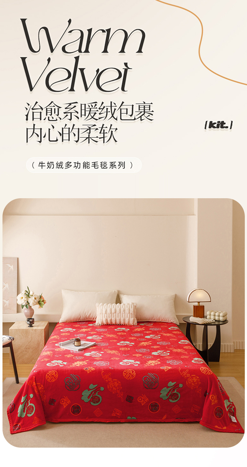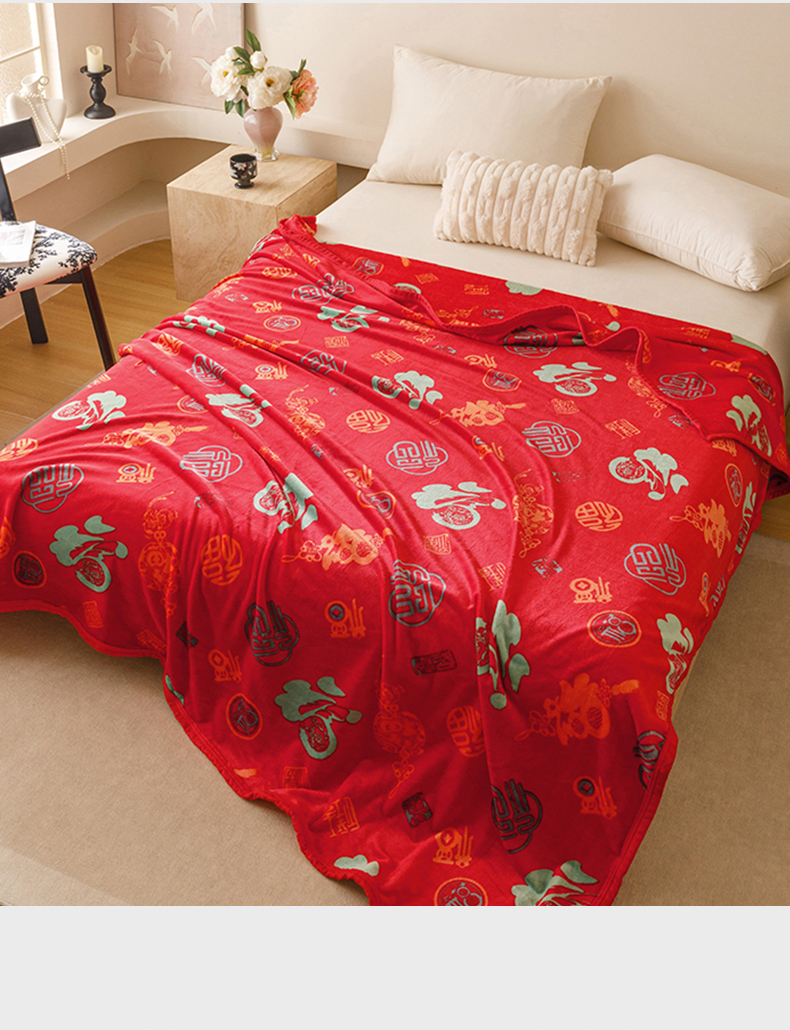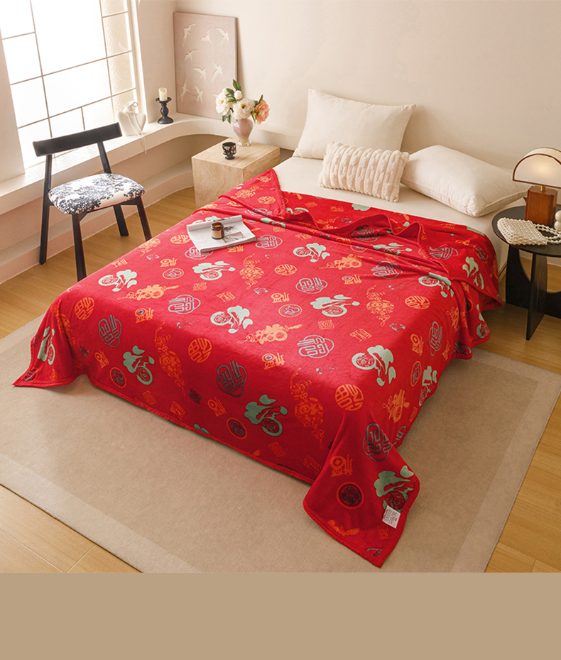 悦然毛巾被 2025新款300克印花牛奶绒盖毯休闲毯素色毛毯毯子 百福毯红