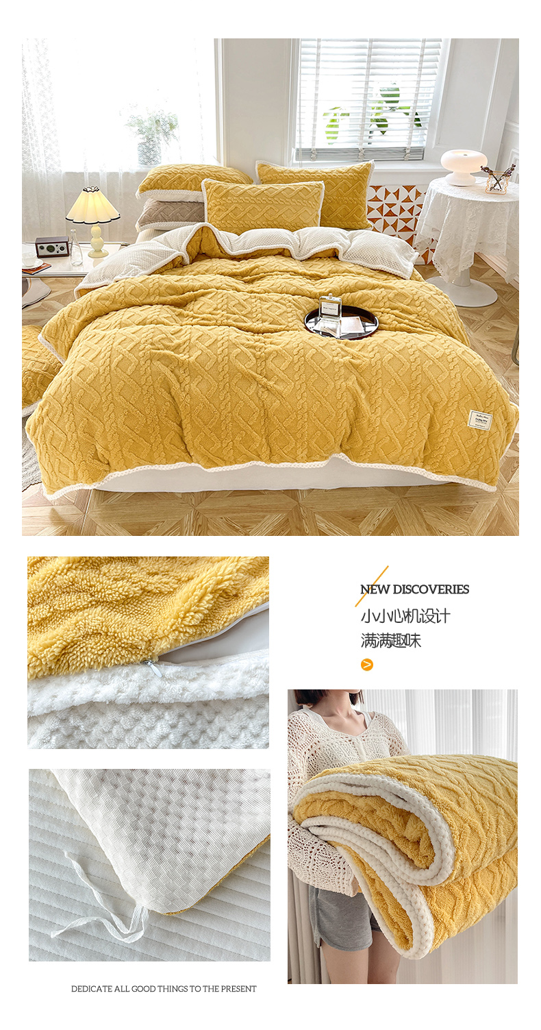 商品名称:雅诗帛 冬季加绒四件套云朵绒法莱绒牛奶绒雕花绒水晶绒塔芙绒毛毯学生宿舍保暖加绒加厚珊瑚绒双面绒 姜黄