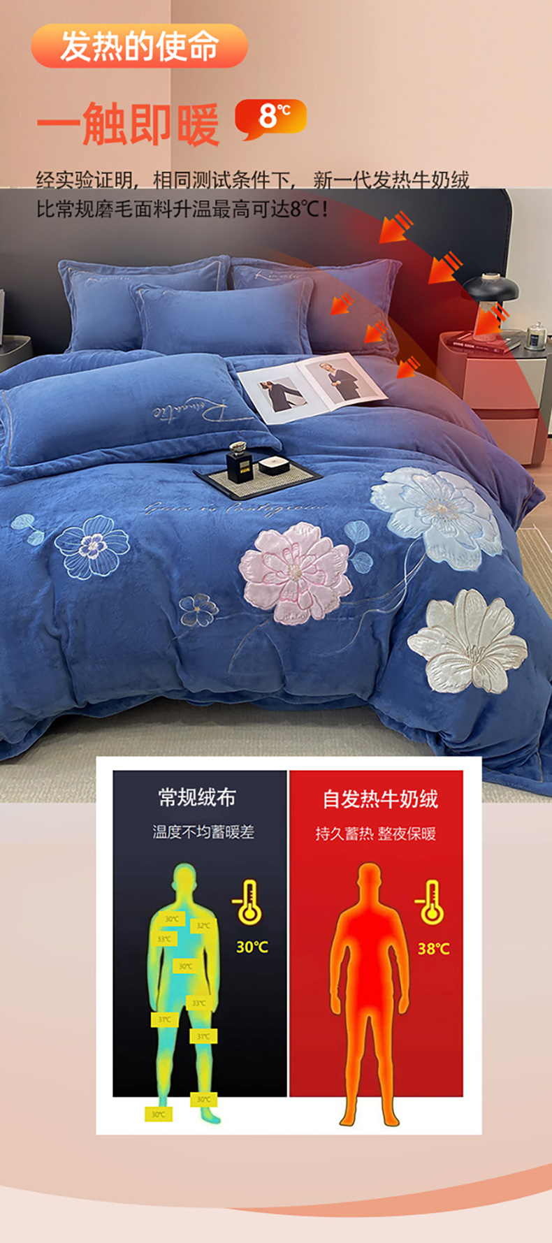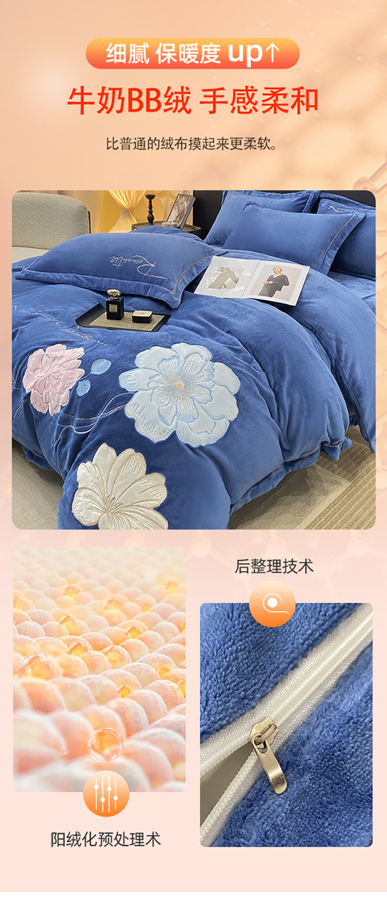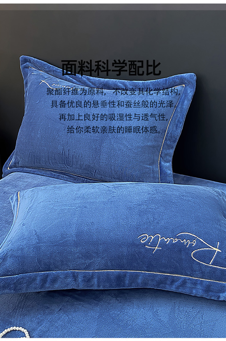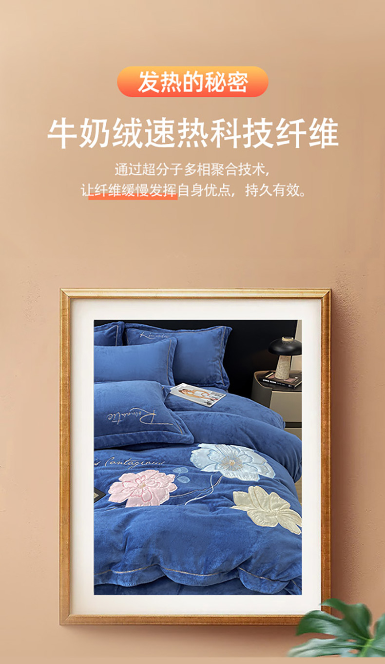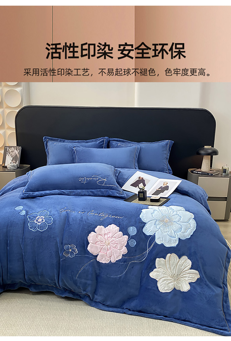 商品名称:悦织湾家纺 2025新款9斤重牛奶绒四件套纯色贴布绣人件富贵系列240克重高密保暖轻奢时尚床上用品4件套 黛西-宾利蓝