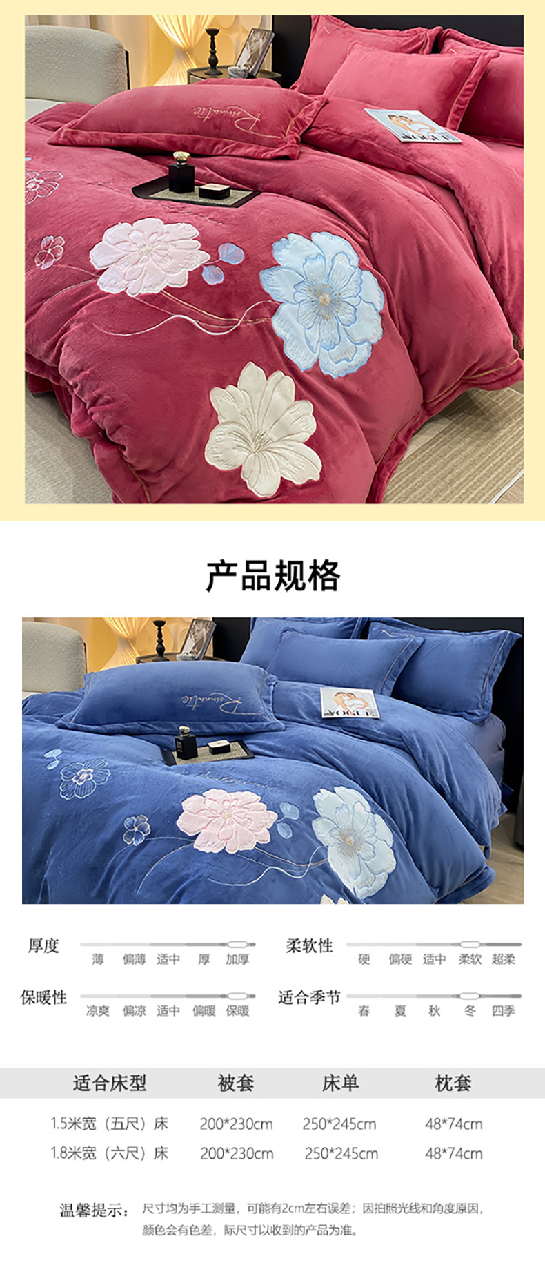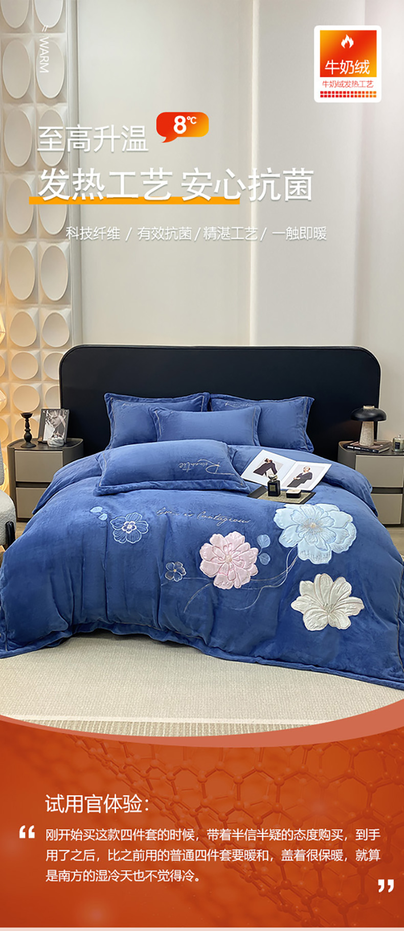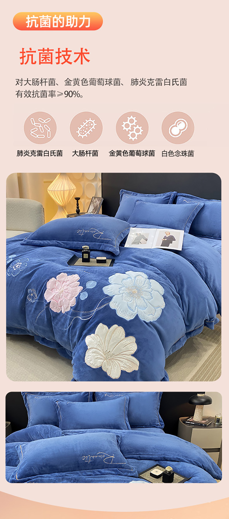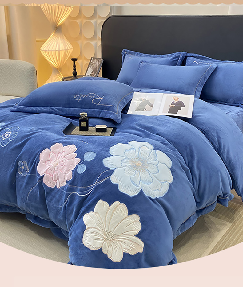 商品名称:悦织湾家纺 2025新款9斤重牛奶绒四件套纯色贴布绣人件富贵系列240克重高密保暖轻奢时尚床上用品4件套 黛西-宾利蓝