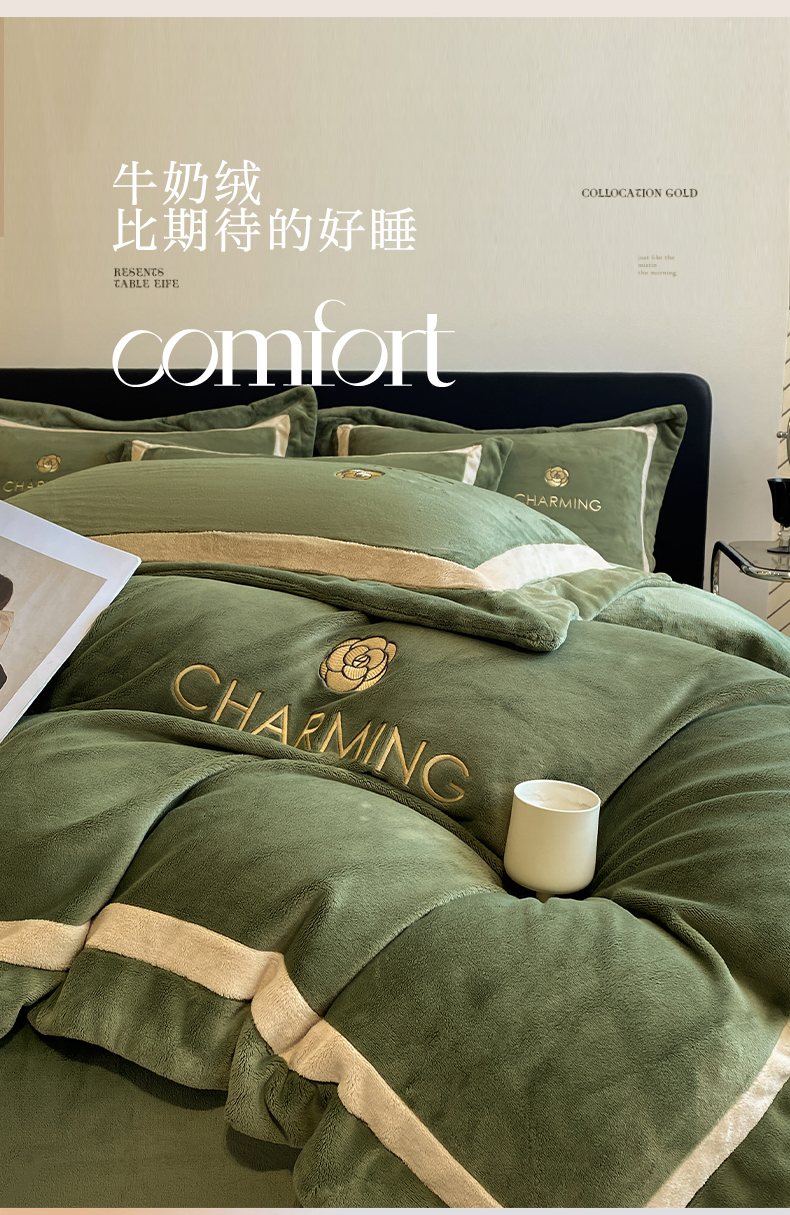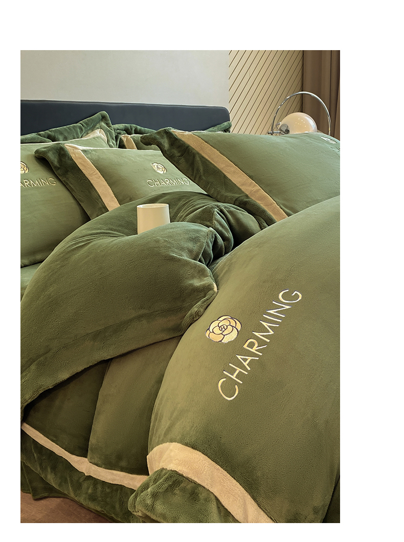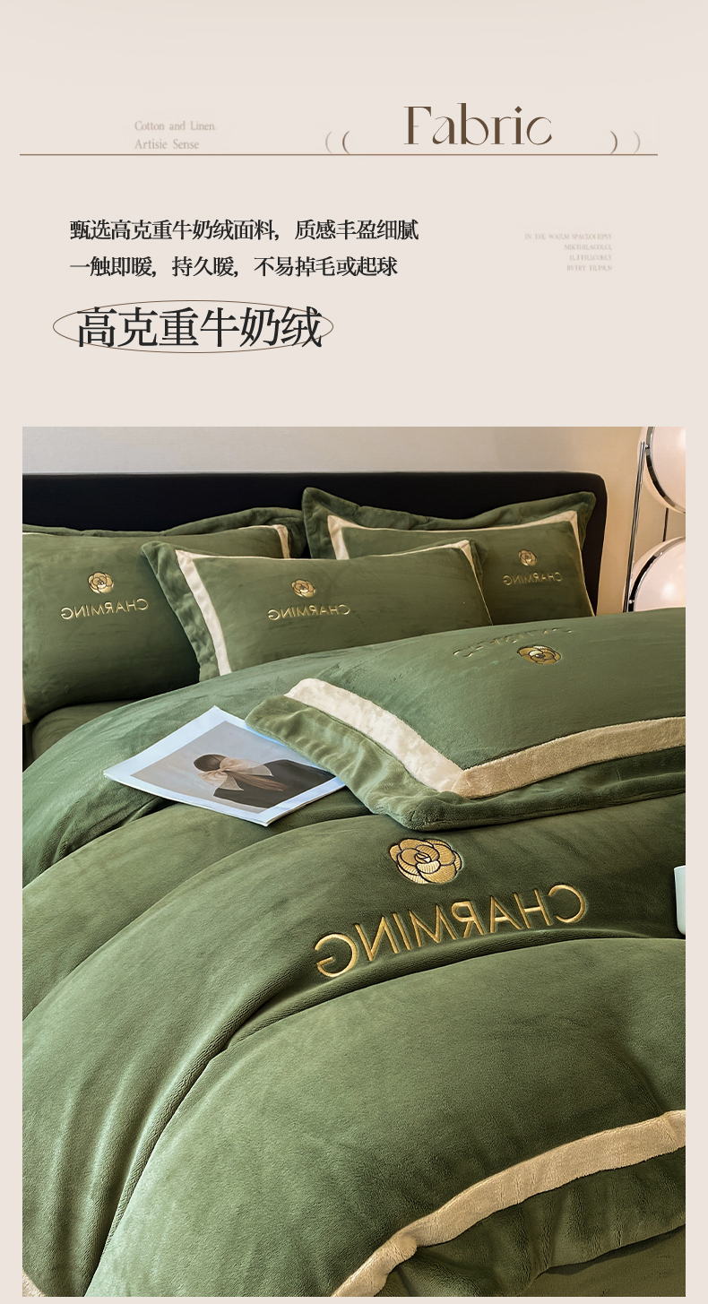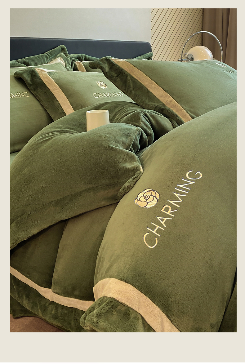 盛秋家纺 2025新款高克重绣花双拼牛奶绒系列山茶花四件套-查伦青藤绿