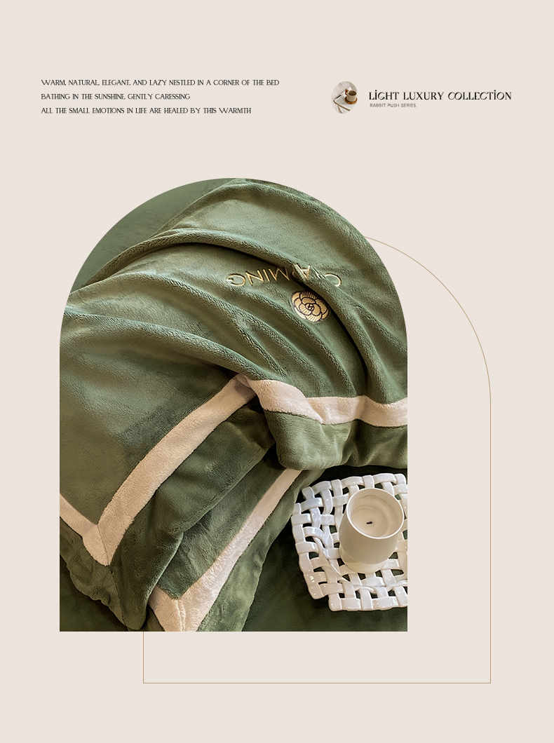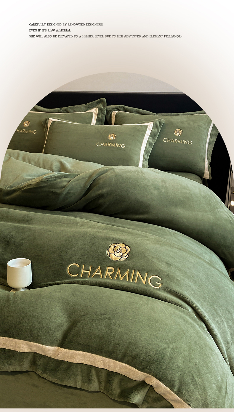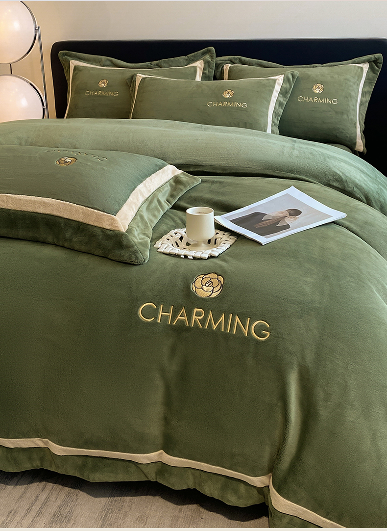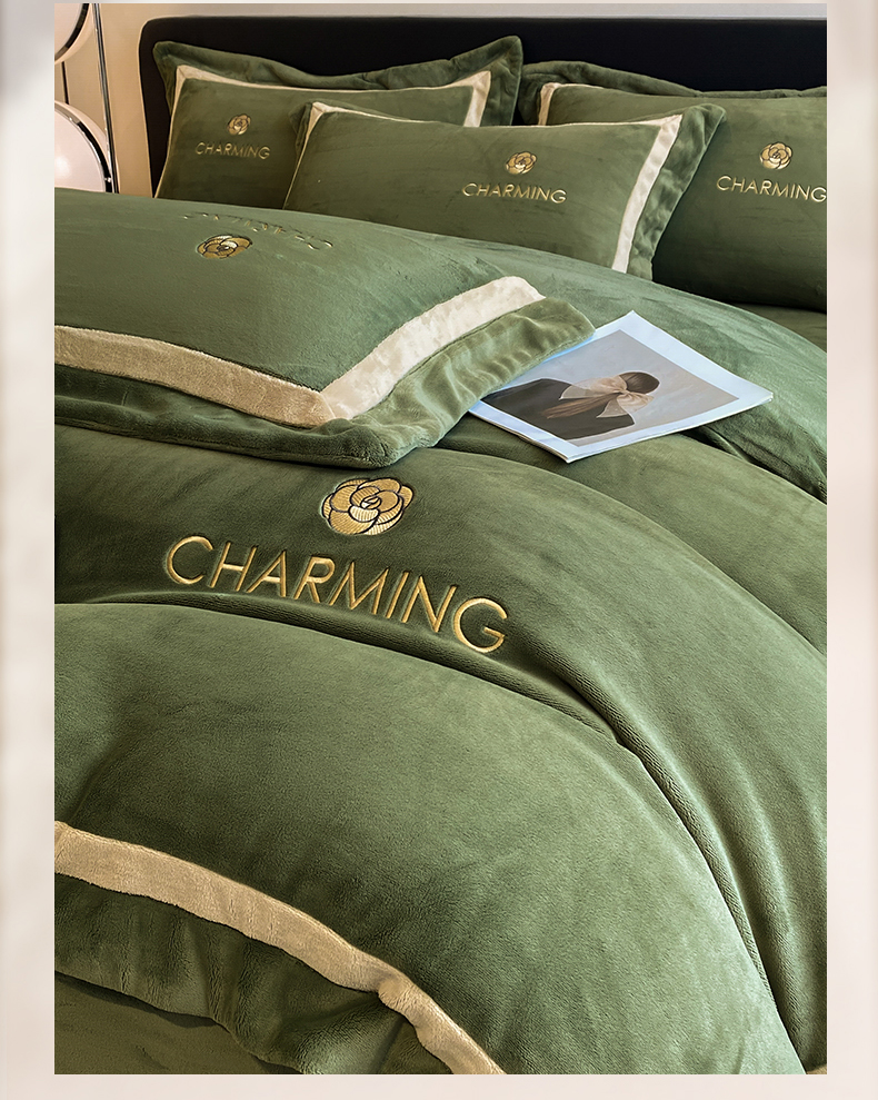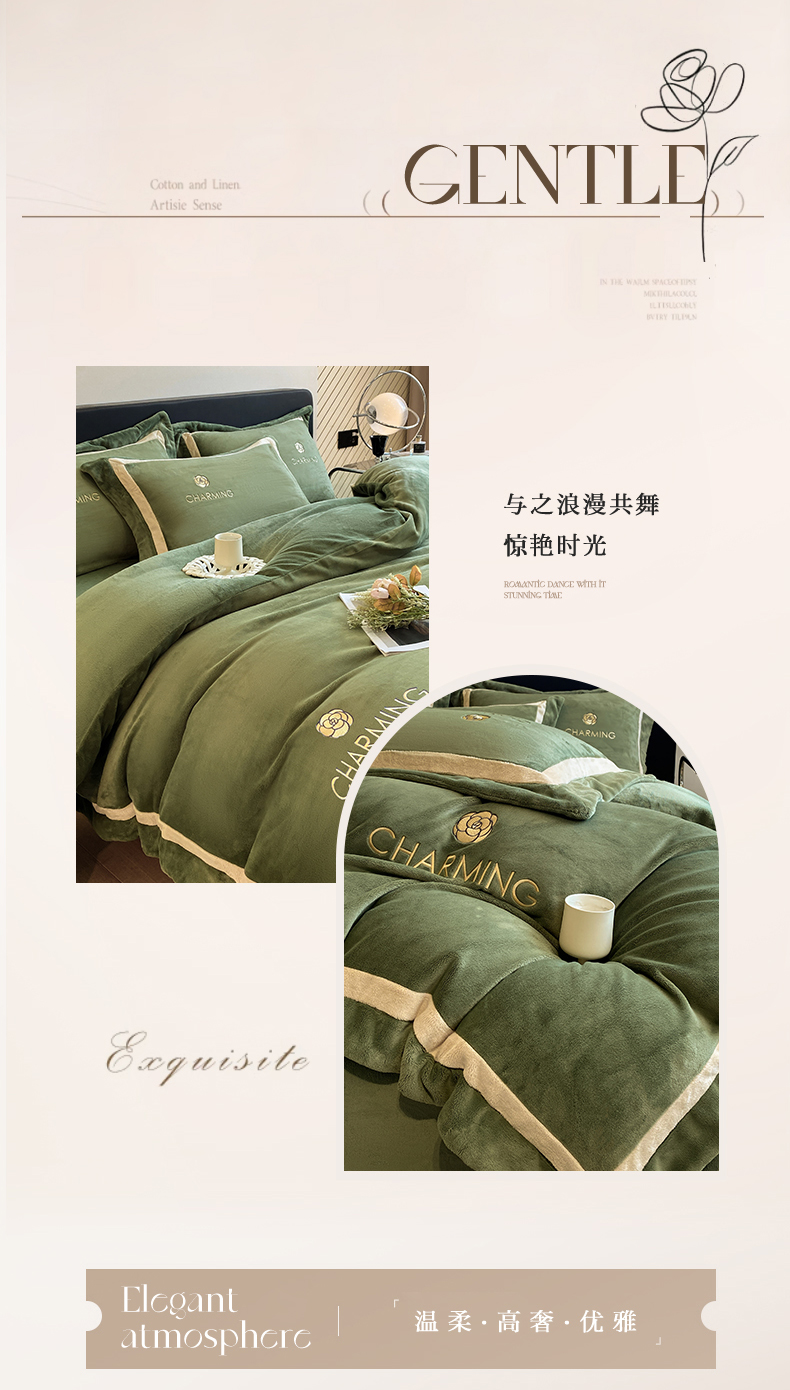盛秋家纺 2025新款高克重绣花双拼牛奶绒系列山茶花四件套-查伦青藤绿