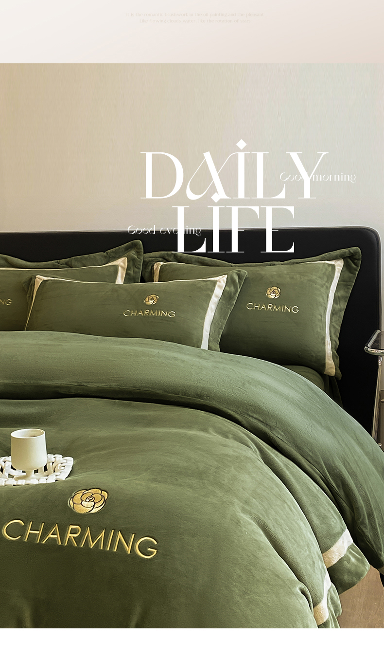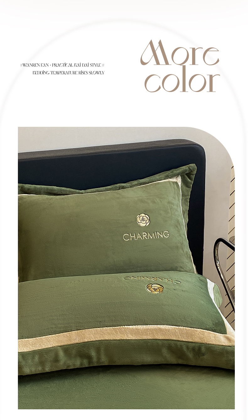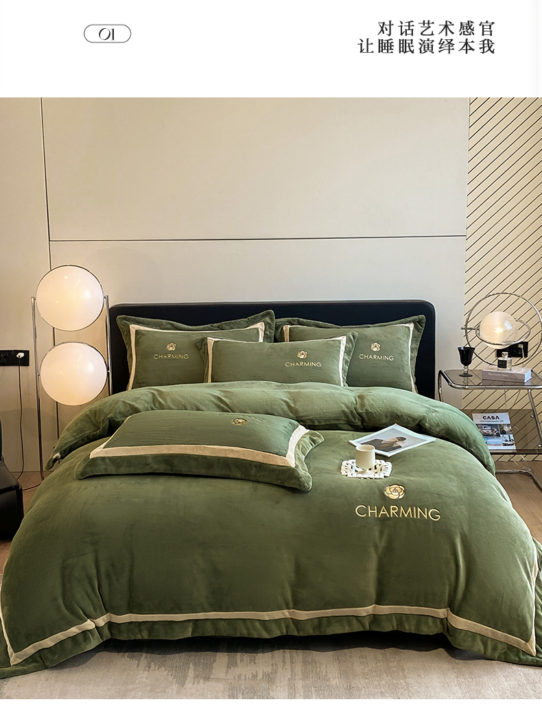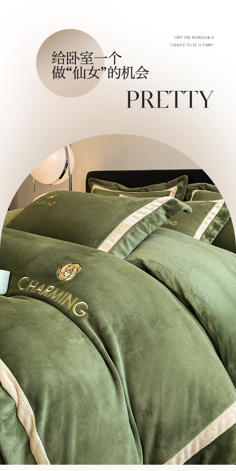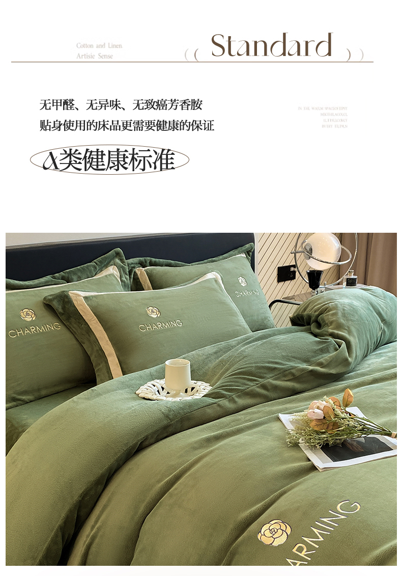 商品名称:盛秋家纺 2025新款高克重绣花双拼牛奶绒系列山茶花四件套-查伦青藤绿