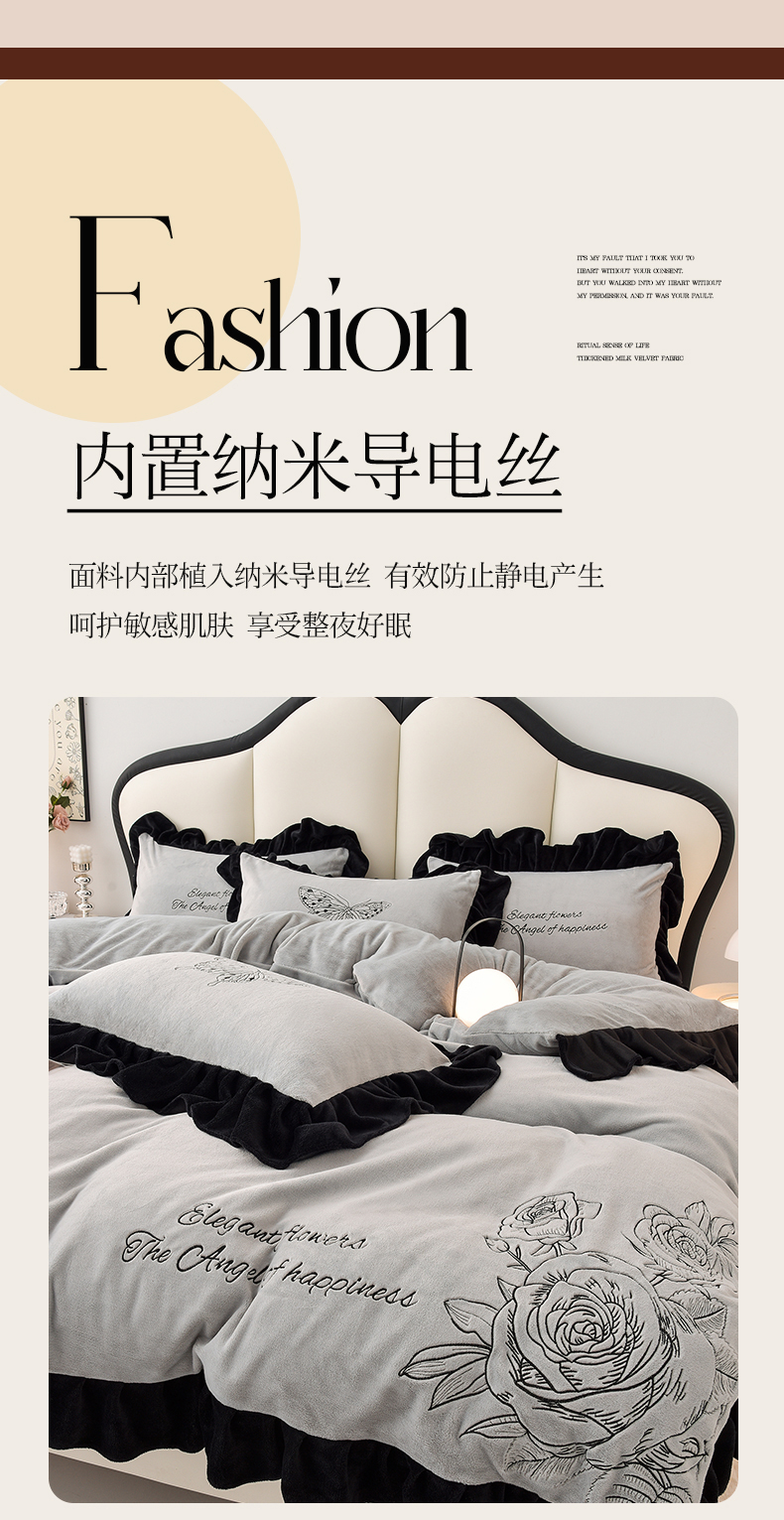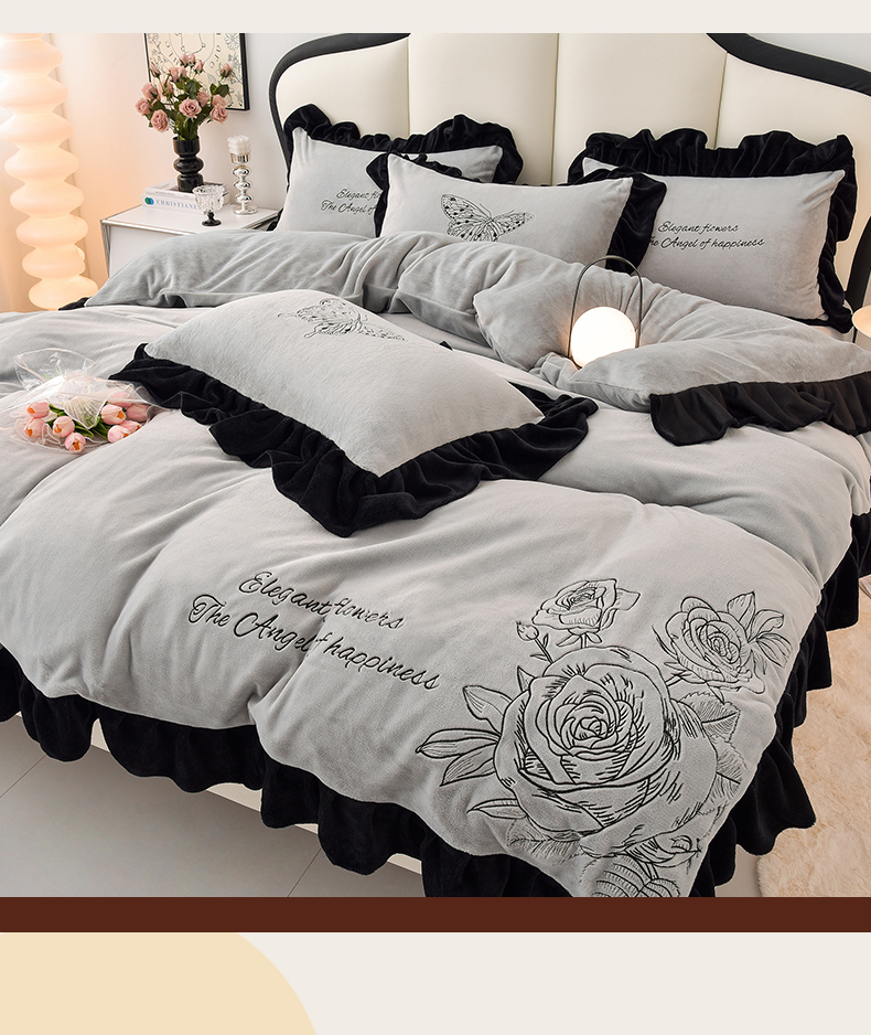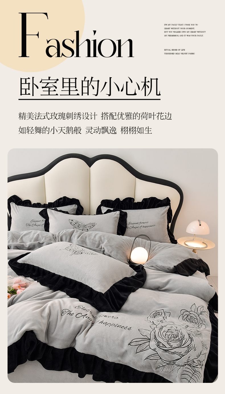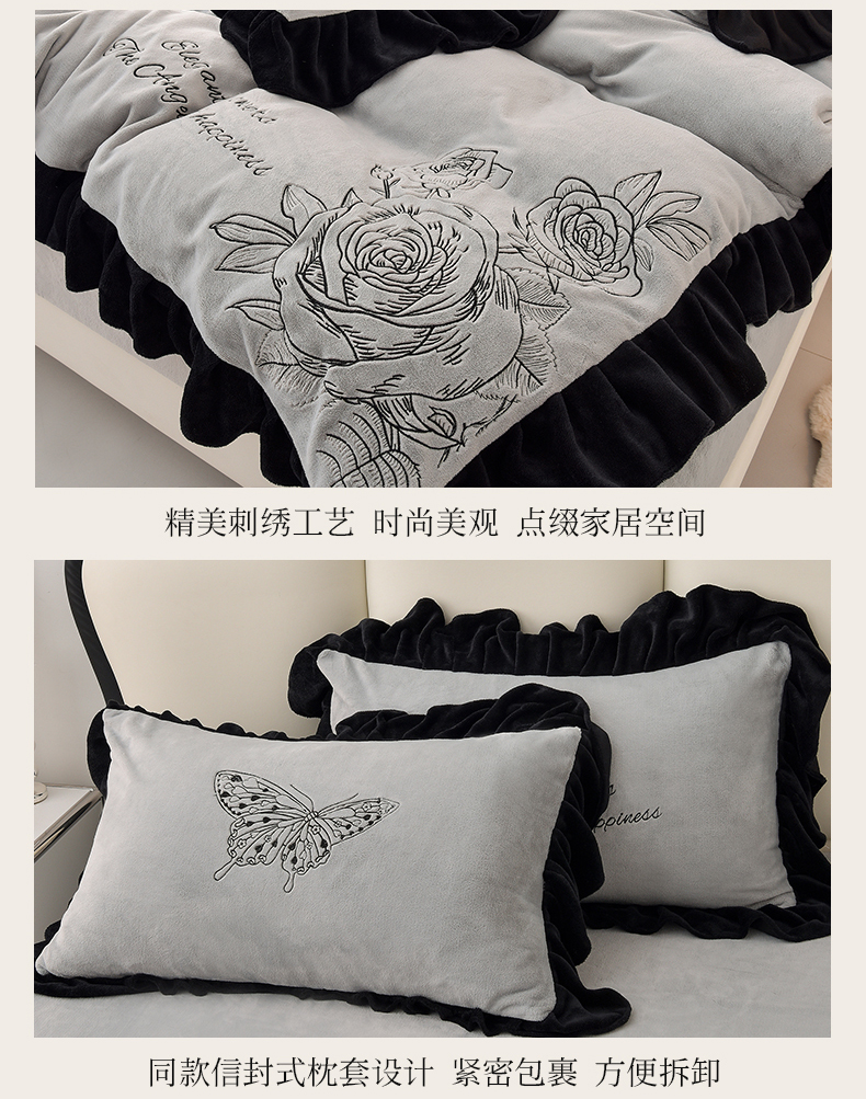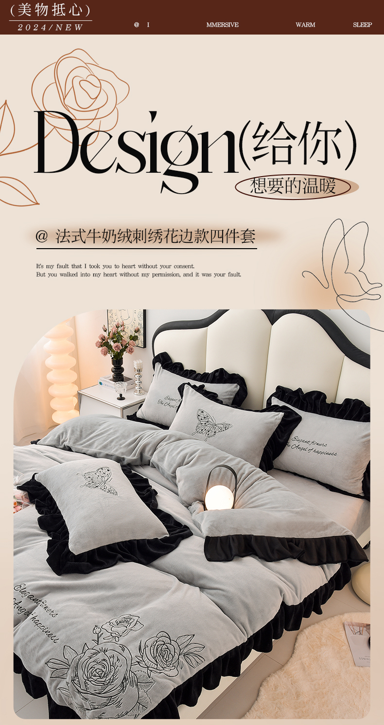 炫拼家纺 2025新款刺绣黑花边高克重牛奶绒四件套-法式玫瑰 法式玫瑰-伯爵灰