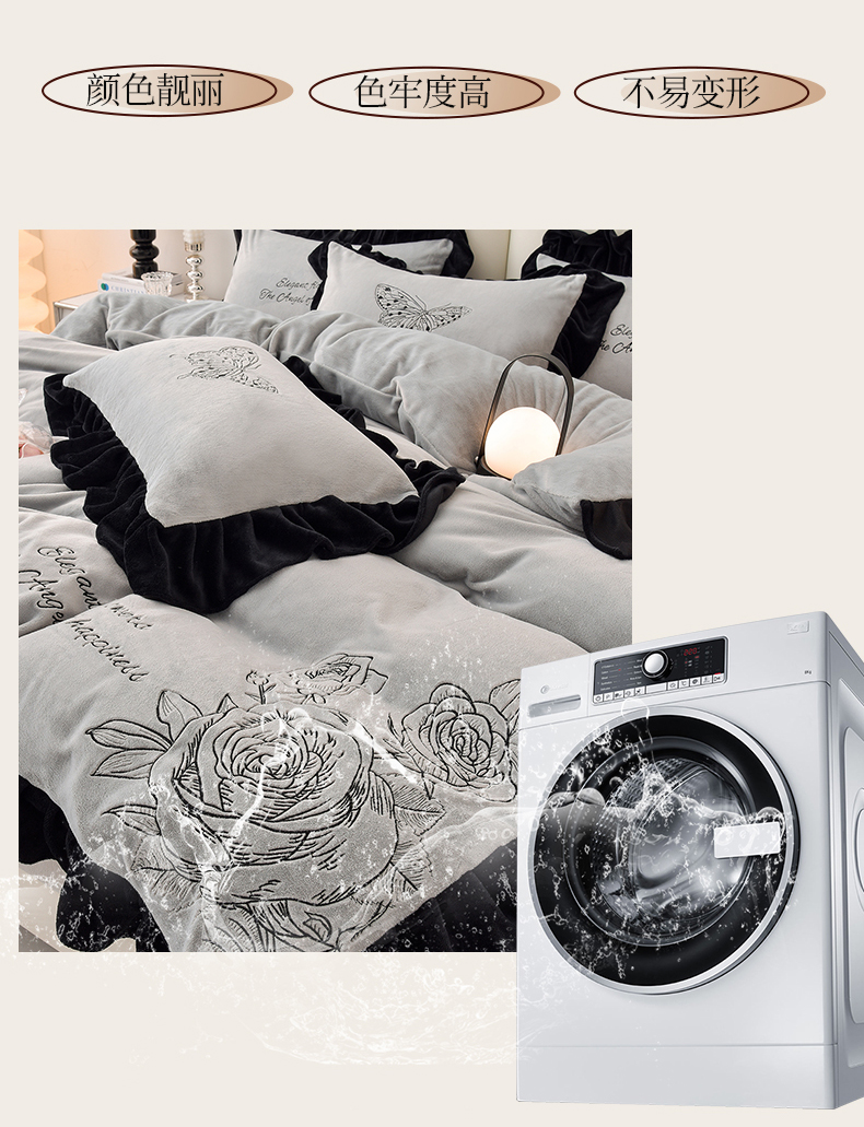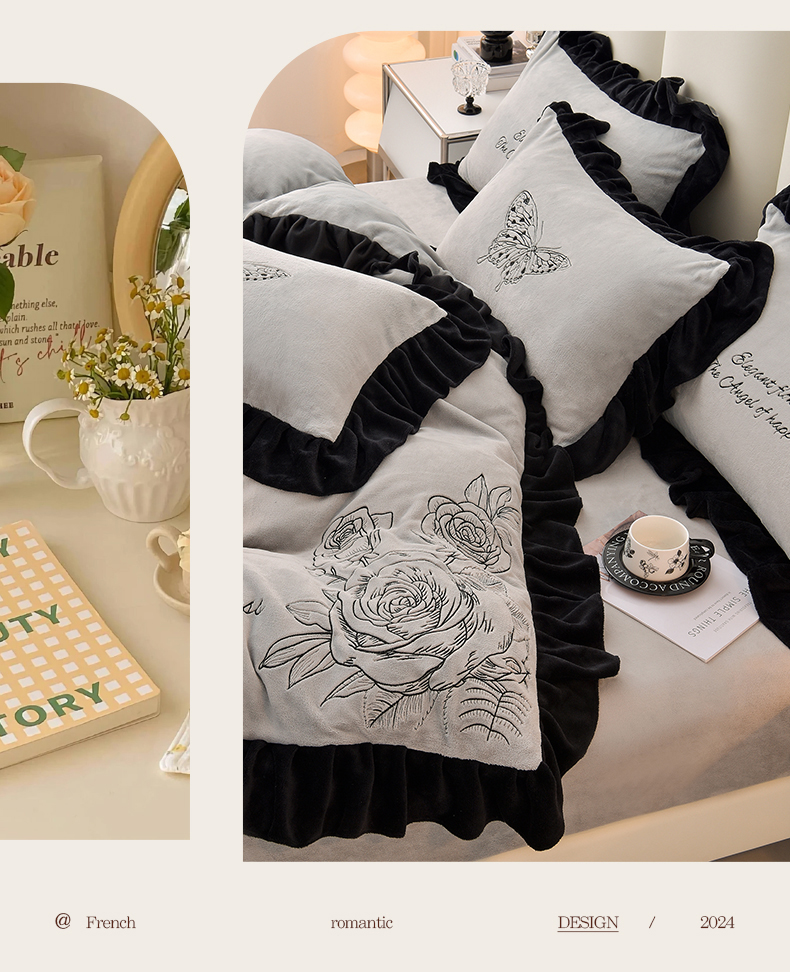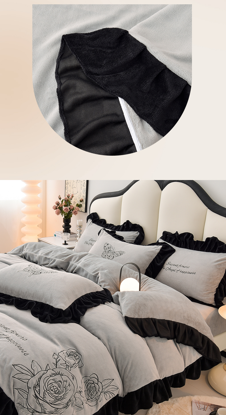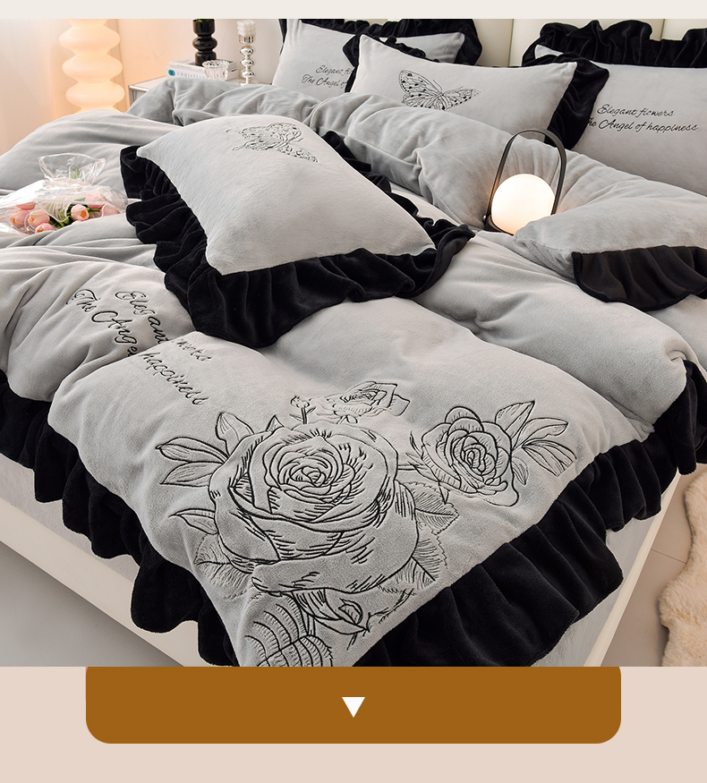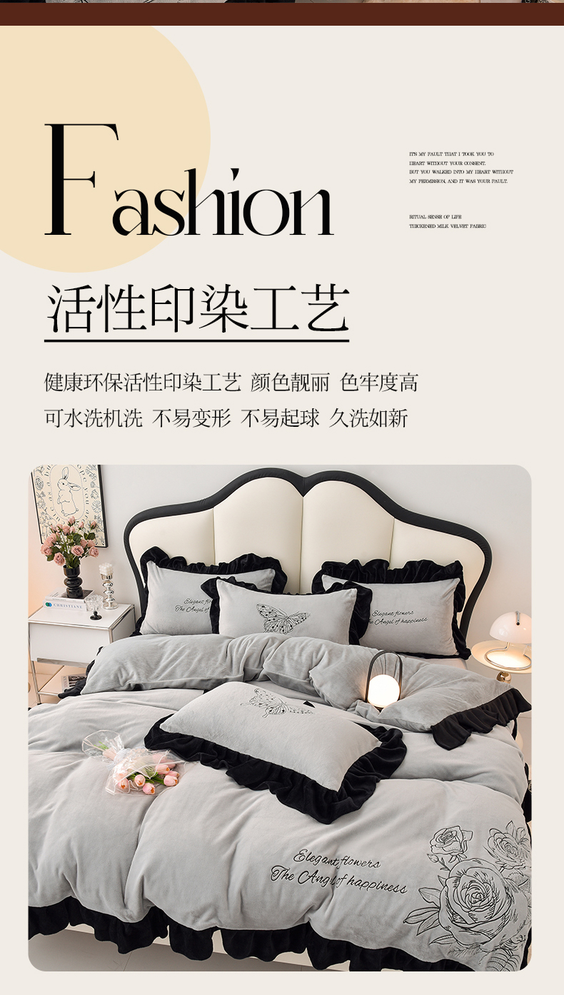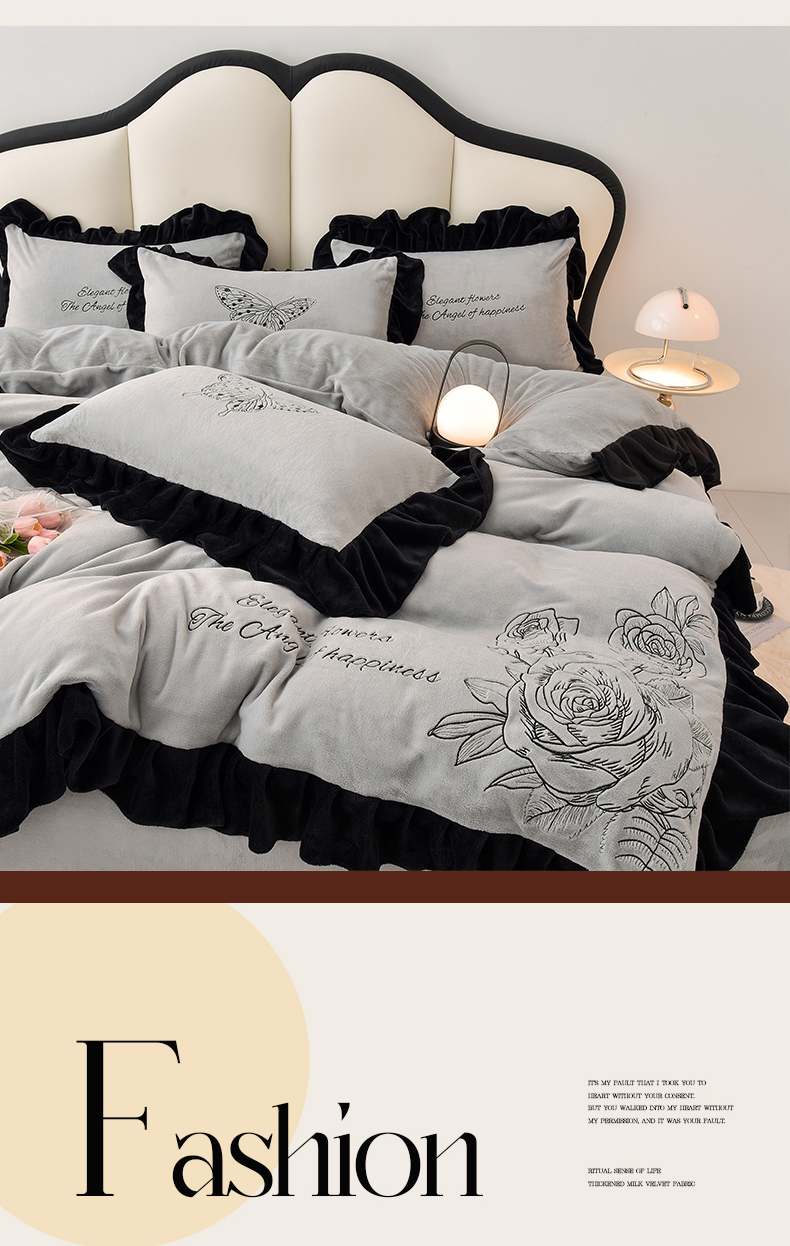 炫拼家纺 2025新款刺绣黑花边高克重牛奶绒四件套-法式玫瑰 法式玫瑰-伯爵灰
