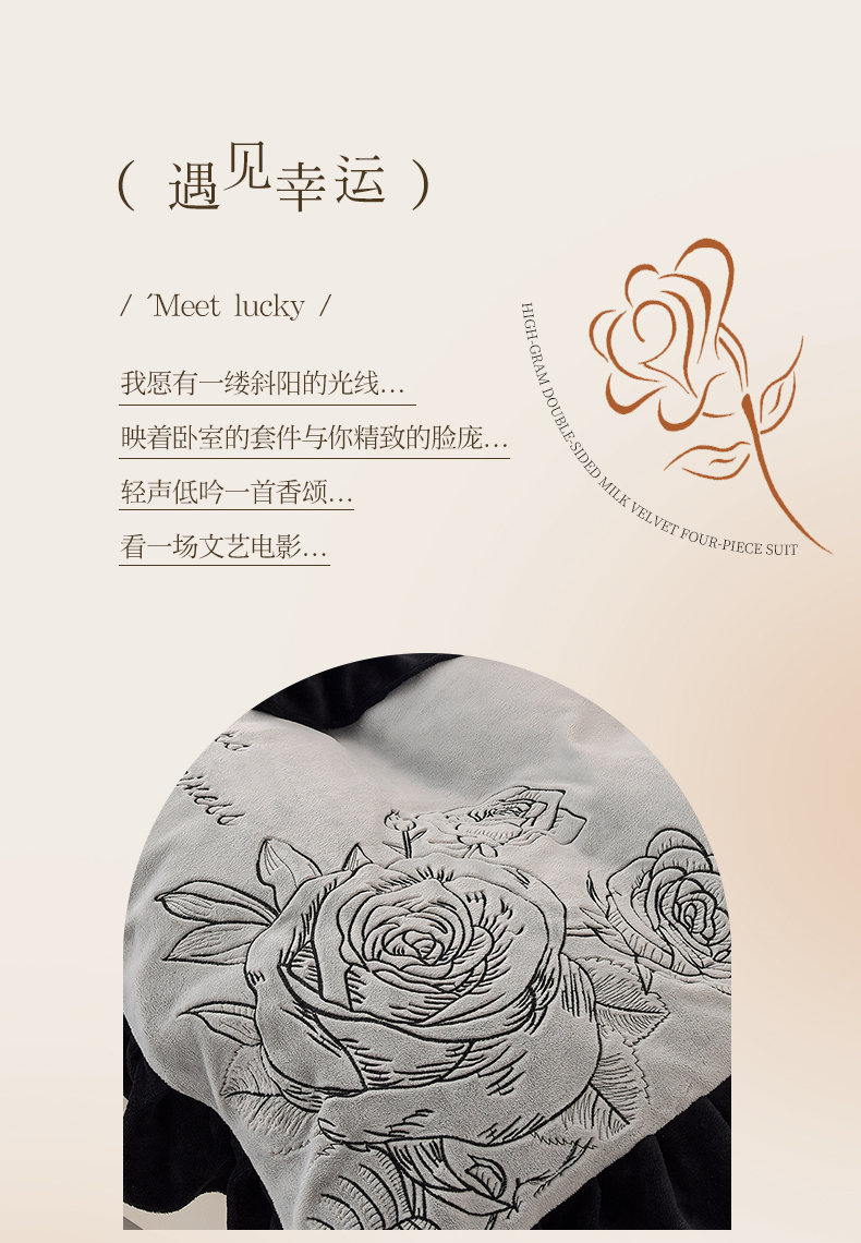 商品名称:炫拼家纺 2025新款刺绣黑花边高克重牛奶绒四件套-法式玫瑰 法式玫瑰-伯爵灰