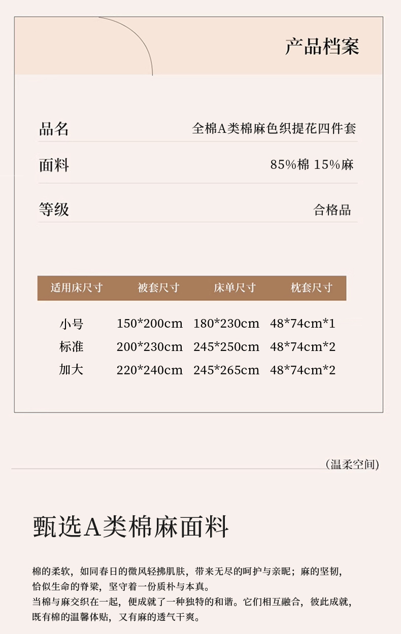 商品名称:(总)寐居家纺 2025新款全棉A类棉麻色织提花四件套
