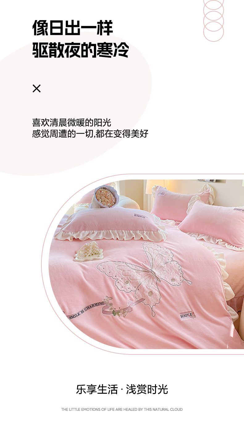 商品名称:梵克保罗 2025新款高克重全消光牛奶绒蕾丝刺绣韩版花边四件套-蝶恋花(带无纺布包装) 淡雅粉