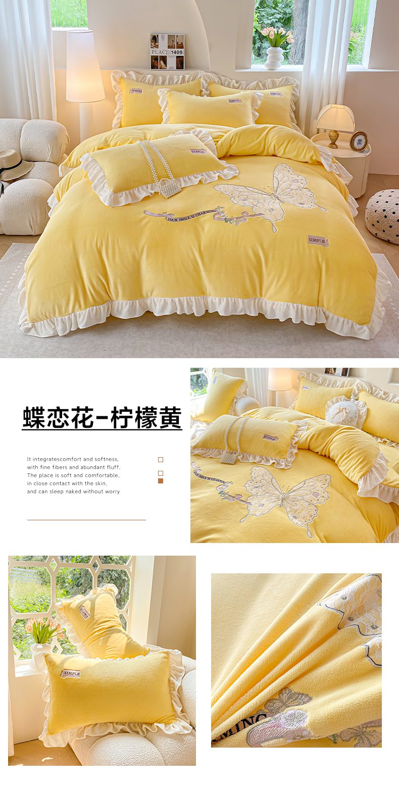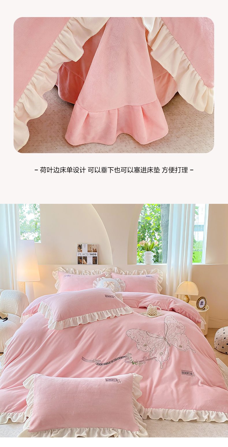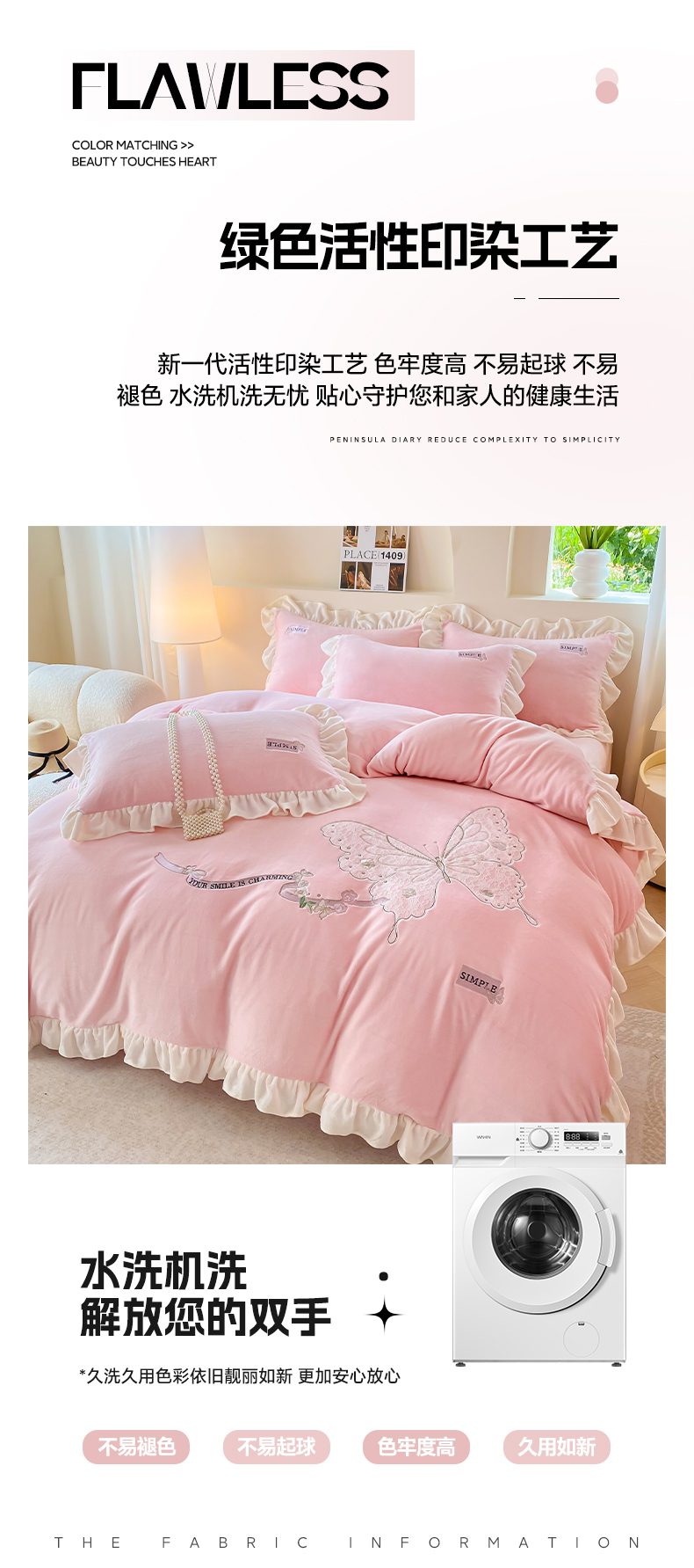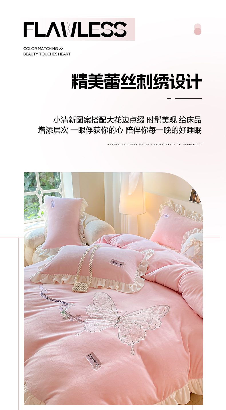 梵克保罗 2025新款高克重全消光牛奶绒蕾丝刺绣韩版花边四件套-蝶恋花(带无纺布包装) 淡雅粉