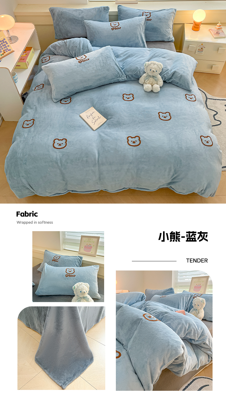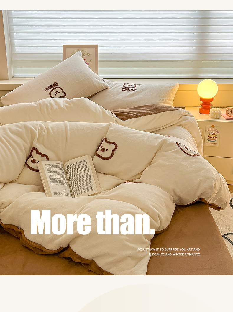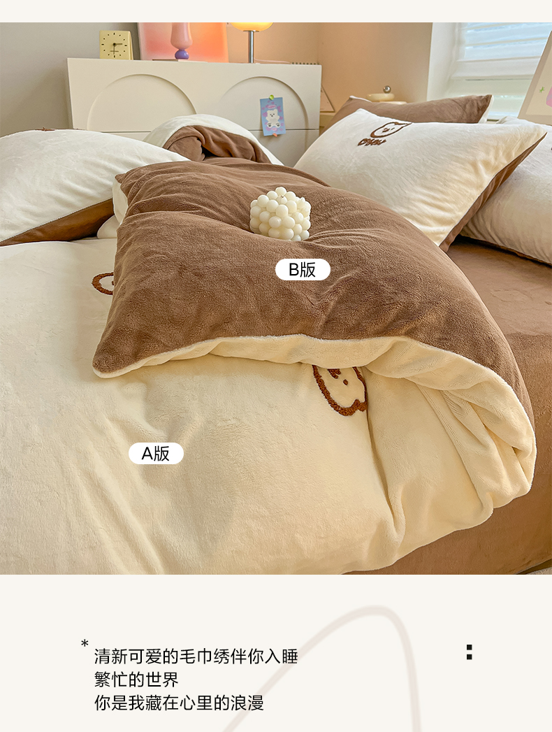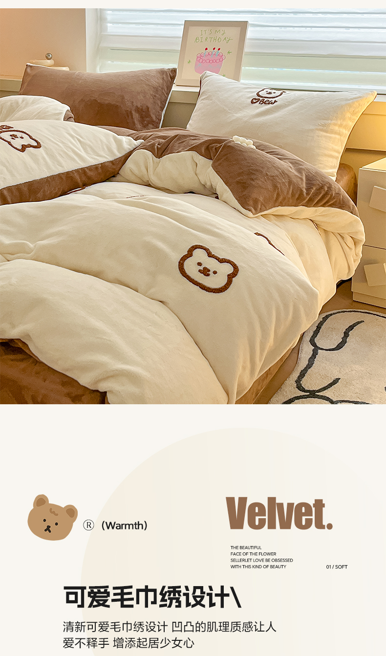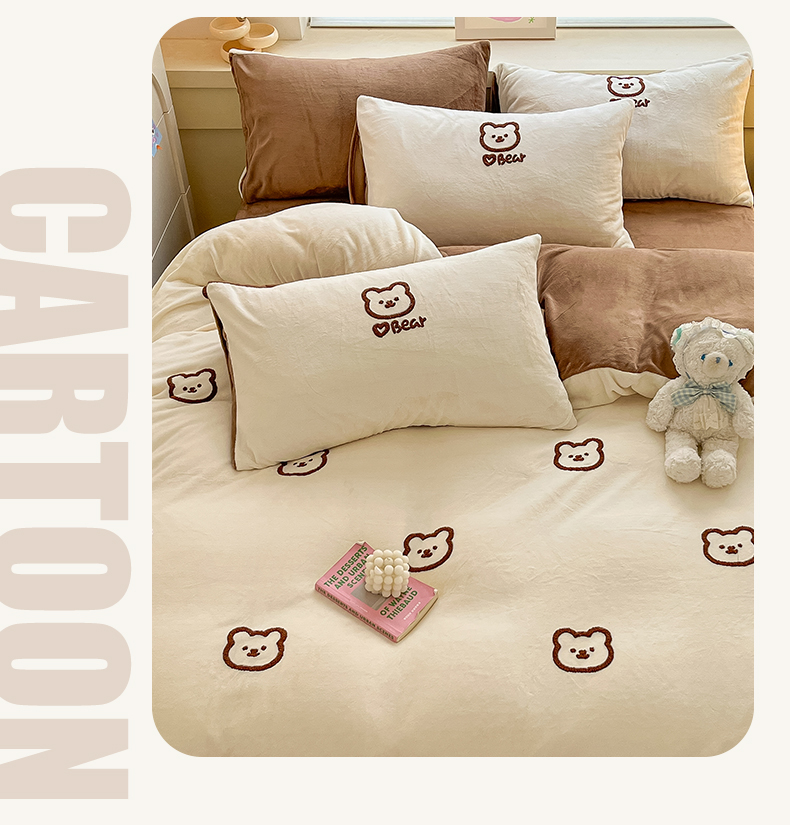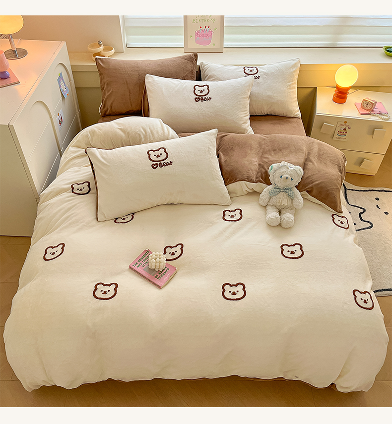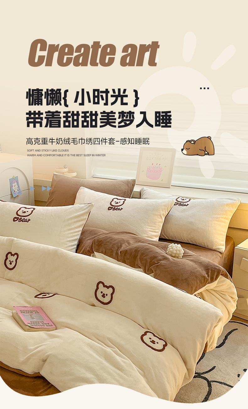 商品名称:雅居纺家纺 2025新款高克重牛奶绒毛巾绣四件套-小熊系列 小熊-白咖