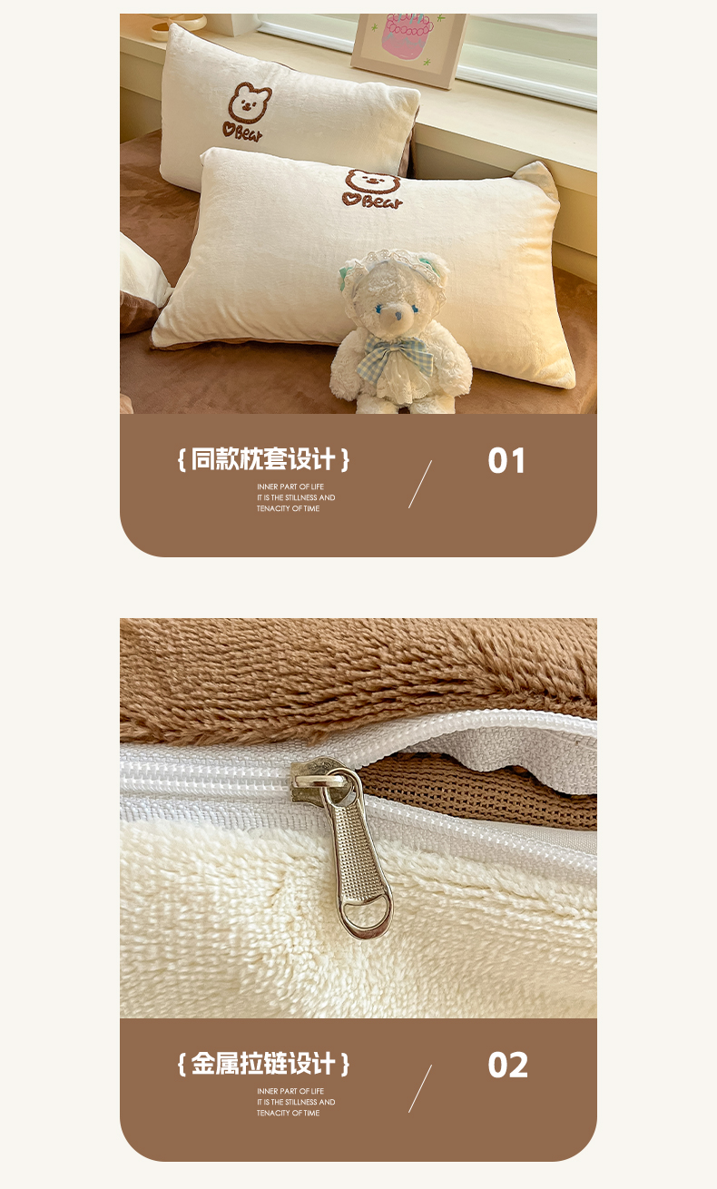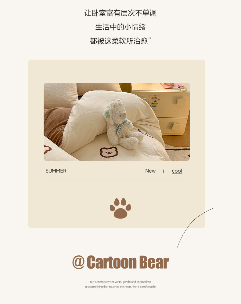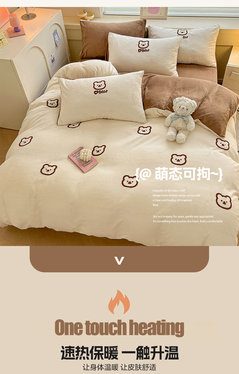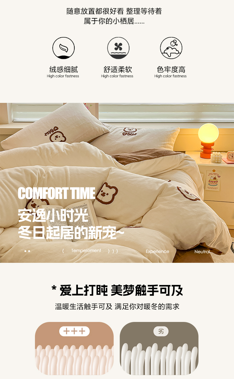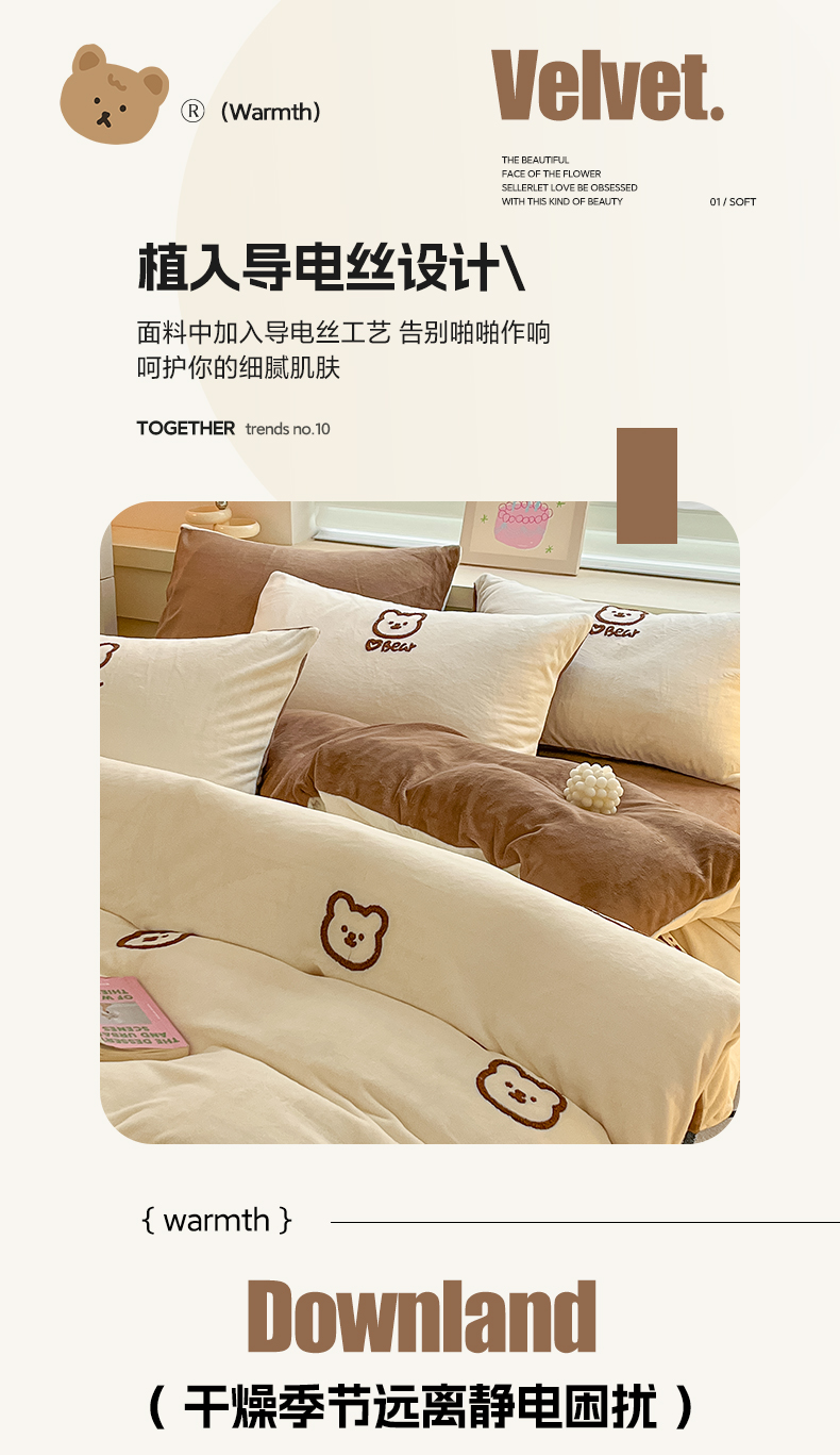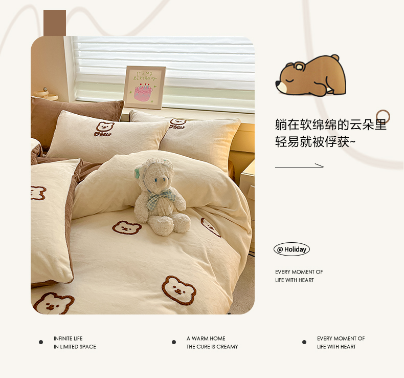 商品名称:雅居纺家纺 2025新款高克重牛奶绒毛巾绣四件套-小熊系列 小熊-白咖