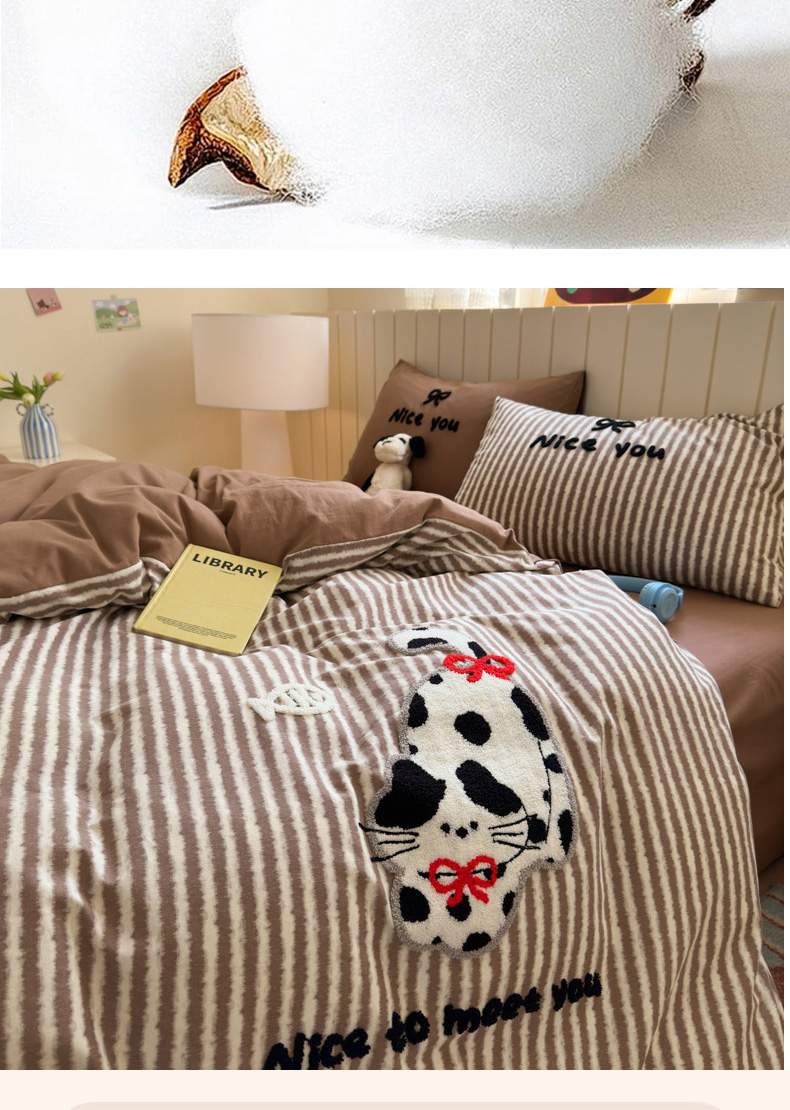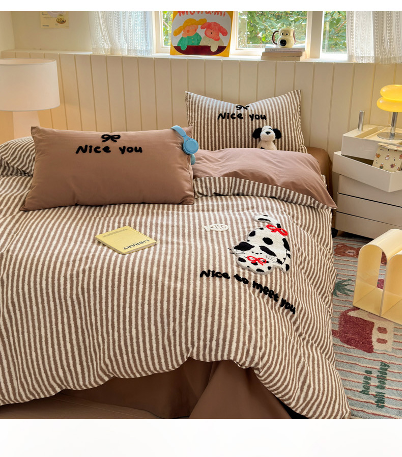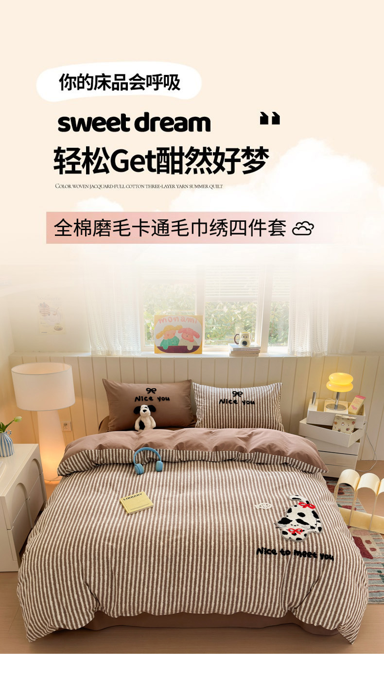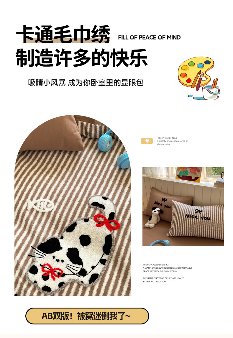 当前位置: 91家纺网 > 商品网购 > 床品套件 > 四件套 > 毛巾绣四件套 > 如意朵 2025新款全棉磨毛卡通毛巾绣四件套(专版花型)-场景二 猫抓鱼