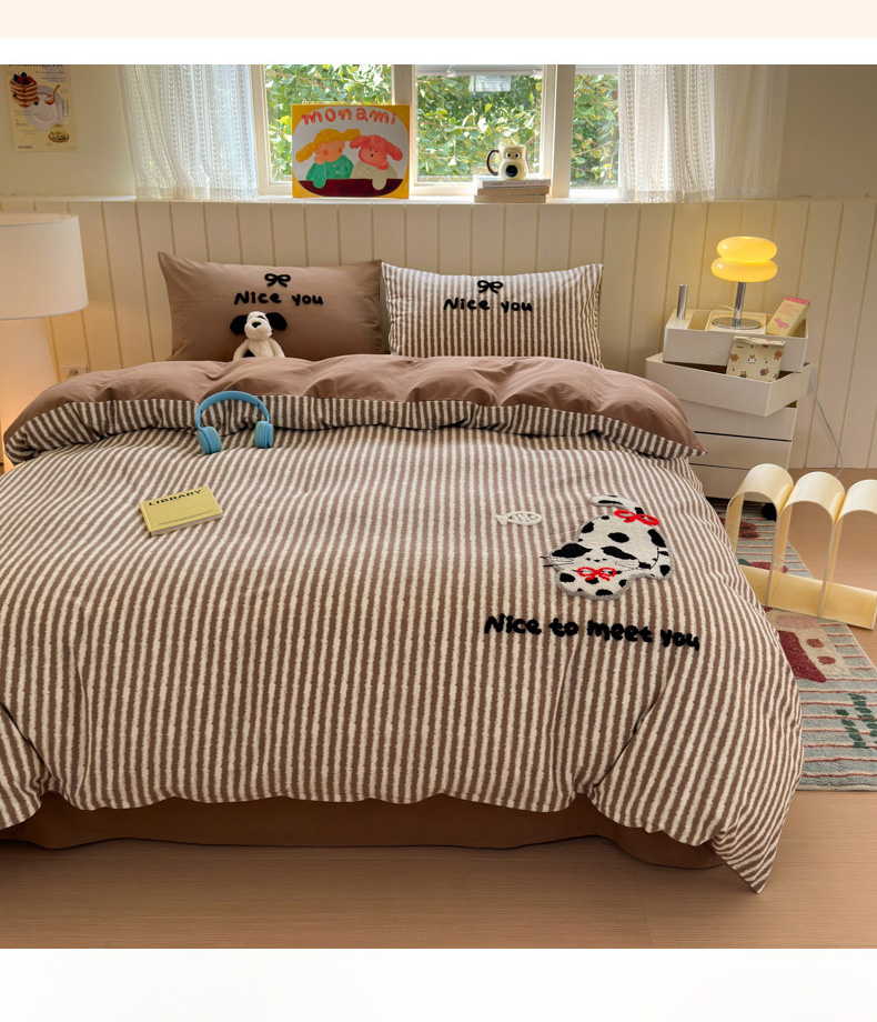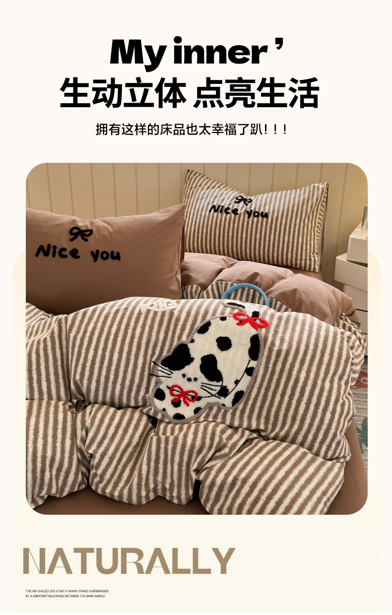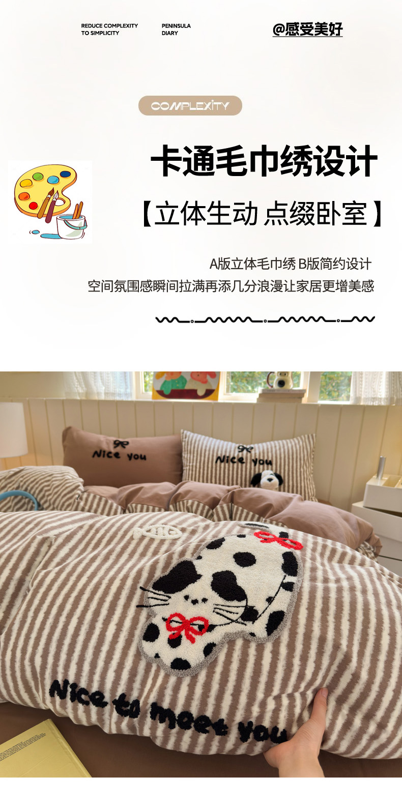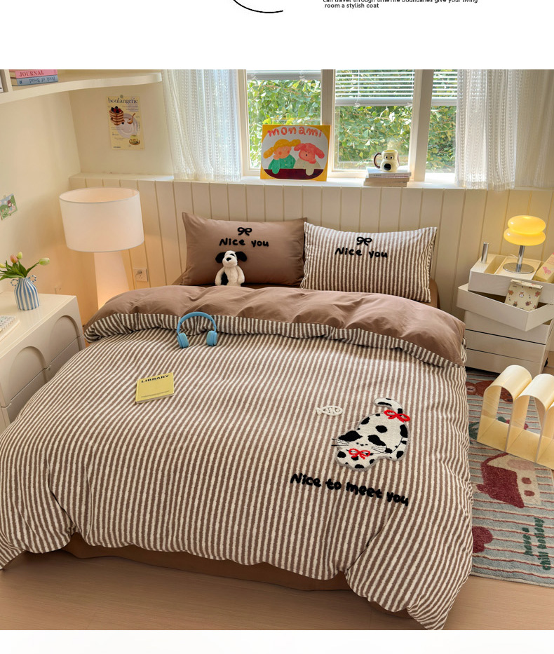 当前位置: 91家纺网 > 商品网购 > 床品套件 > 四件套 > 毛巾绣四件套 > 如意朵 2025新款全棉磨毛卡通毛巾绣四件套(专版花型)-场景二 猫抓鱼