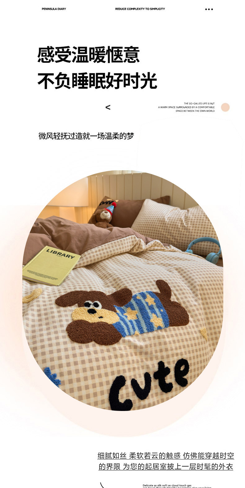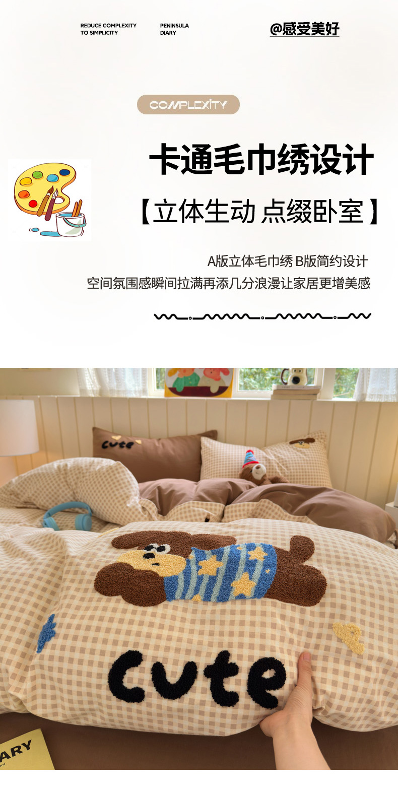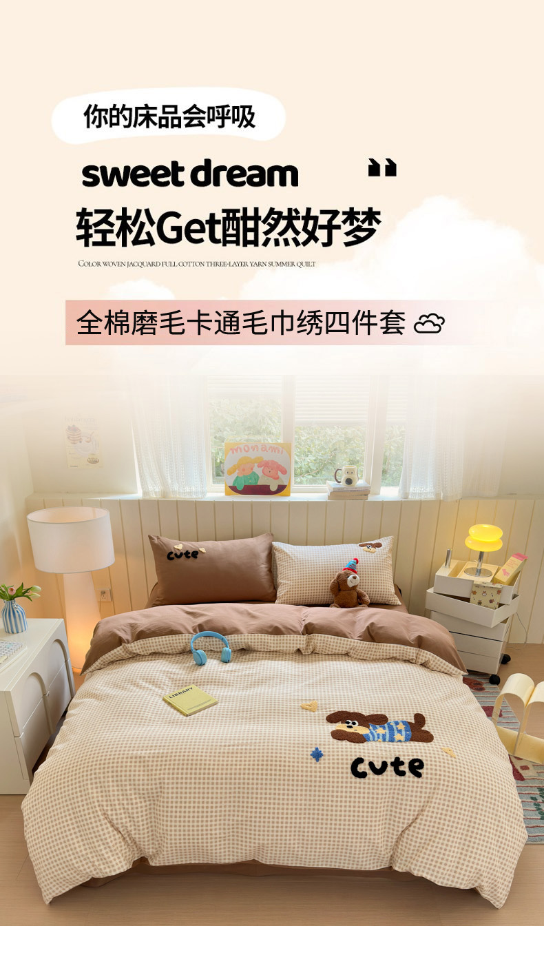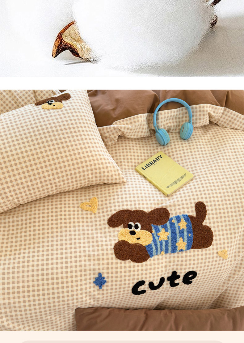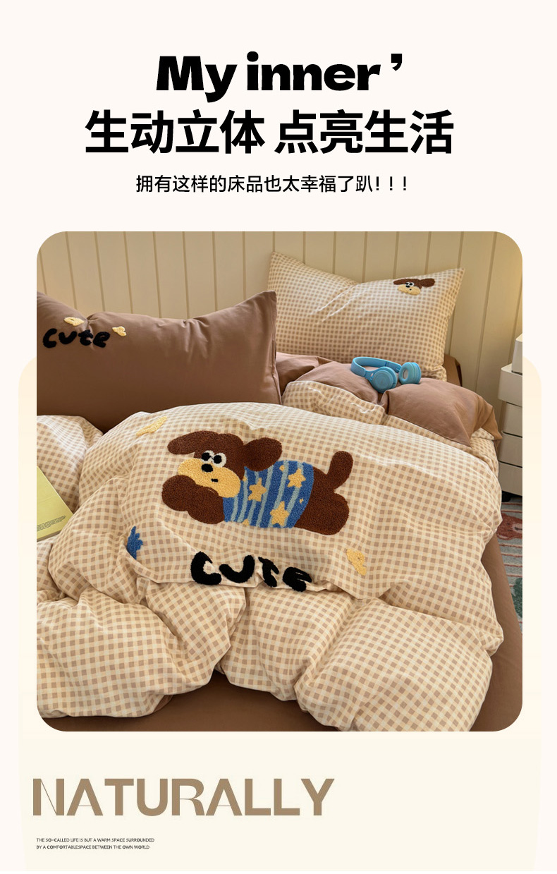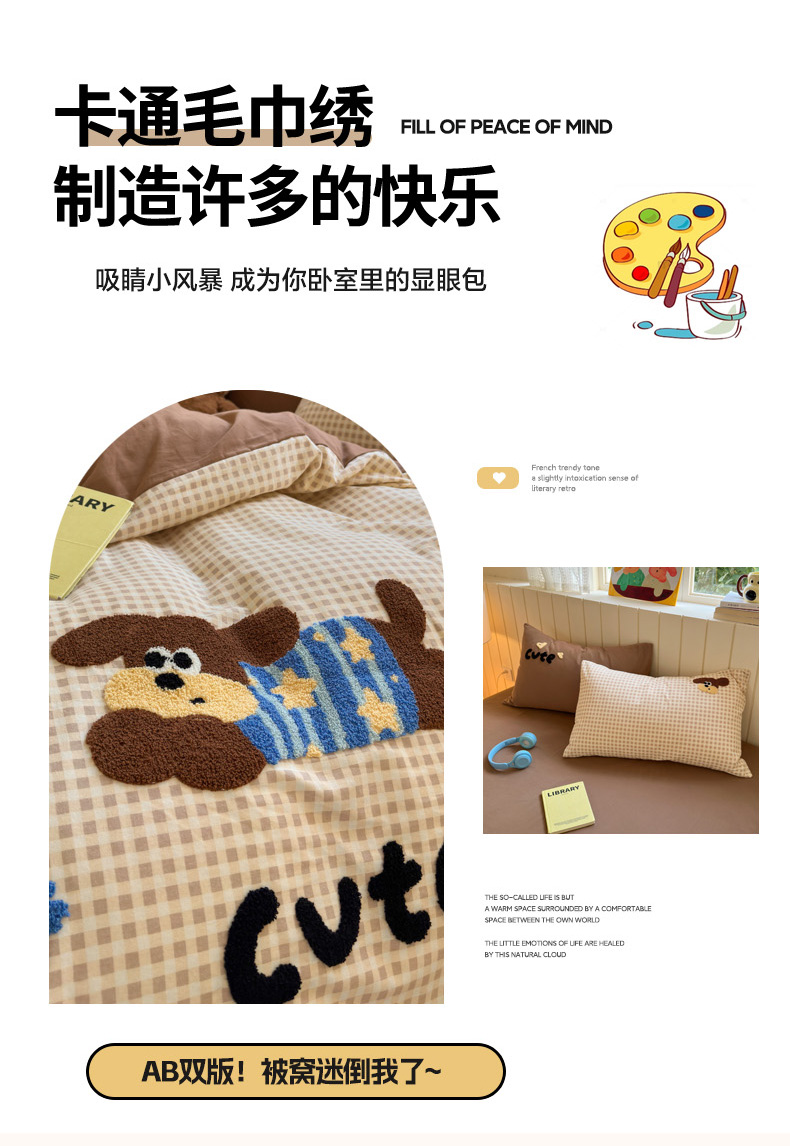 当前位置: 91家纺网 > 商品网购 > 床品套件 > 四件套 > 毛巾绣四件套 > 如意朵 2025新款全棉磨毛卡通毛巾绣四件套(专版花型)-场景二 羞羞狗