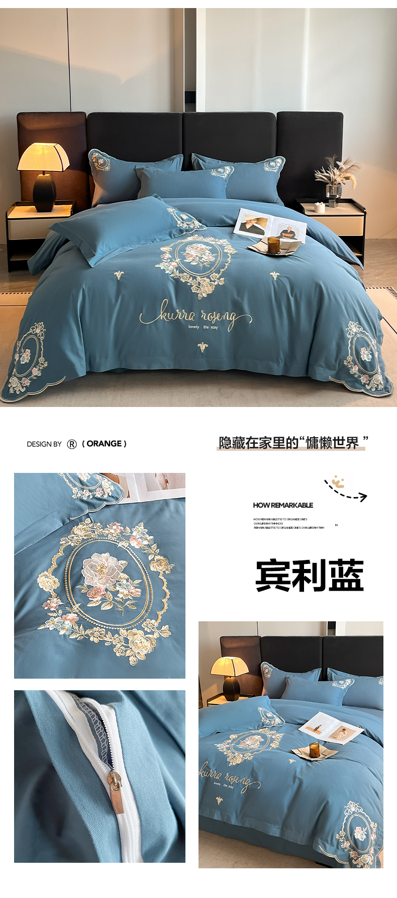 (总)博纳家纺 2025新款亲服棉宽边高级简奢款绣花四件套-盛世年华,宾利蓝,繁星蓝,粉玉,高级灰,香槟