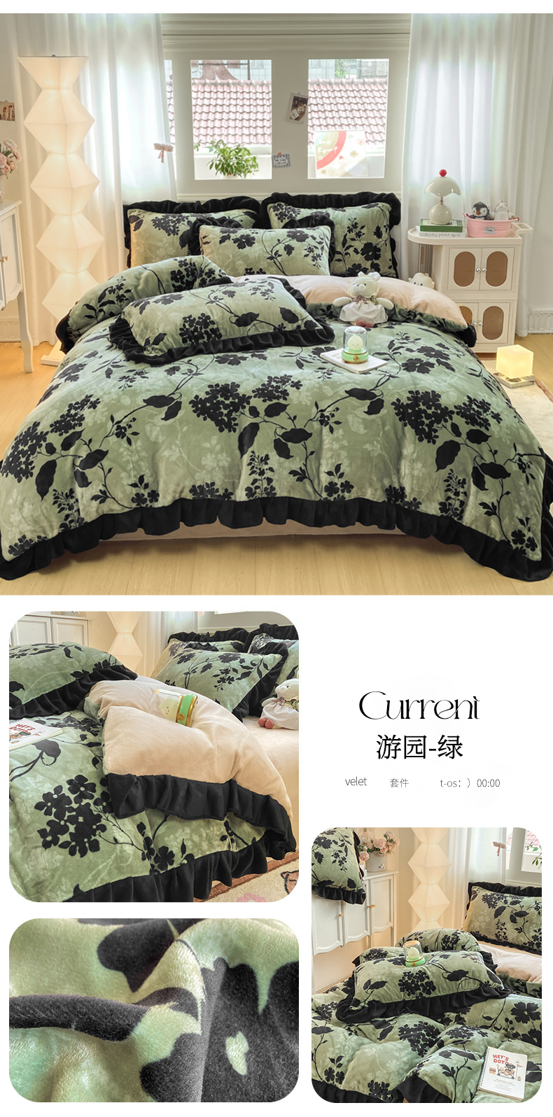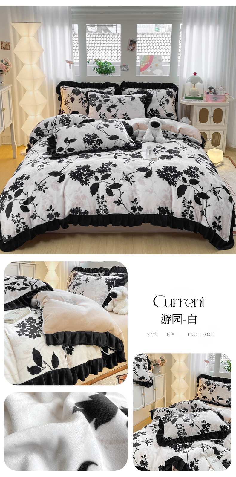 (总)富之航家纺 2025新款小香风赫本风ins风大牌韩版大花边轻奢牛奶绒四件套,蝶恋花,蝶栖,黑糖,楼桃,眠语,慕秋,叶叙,游园-白,游园-绿,紫萝