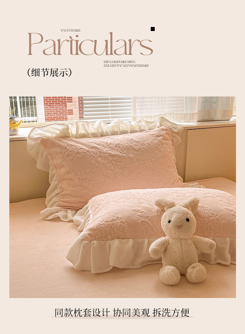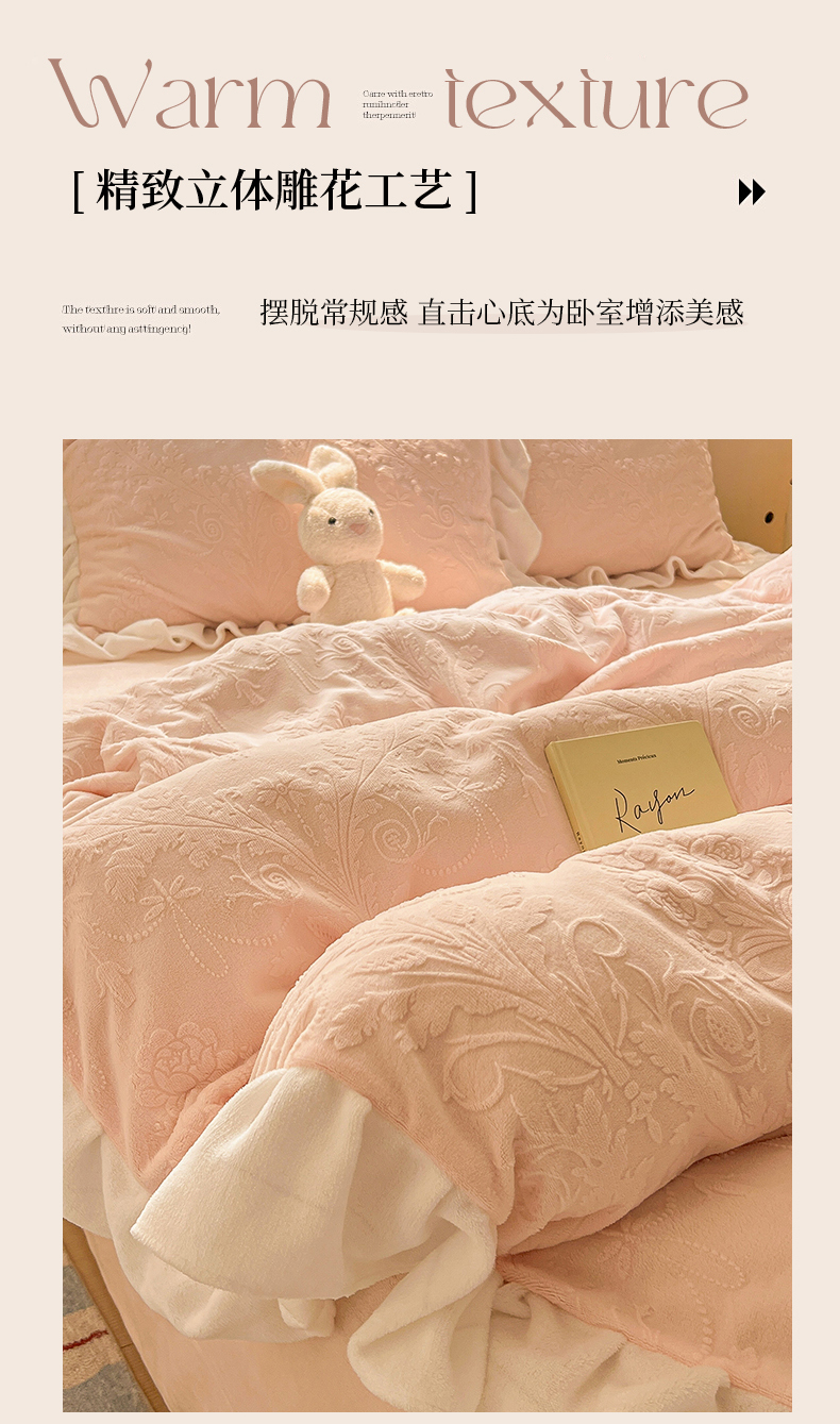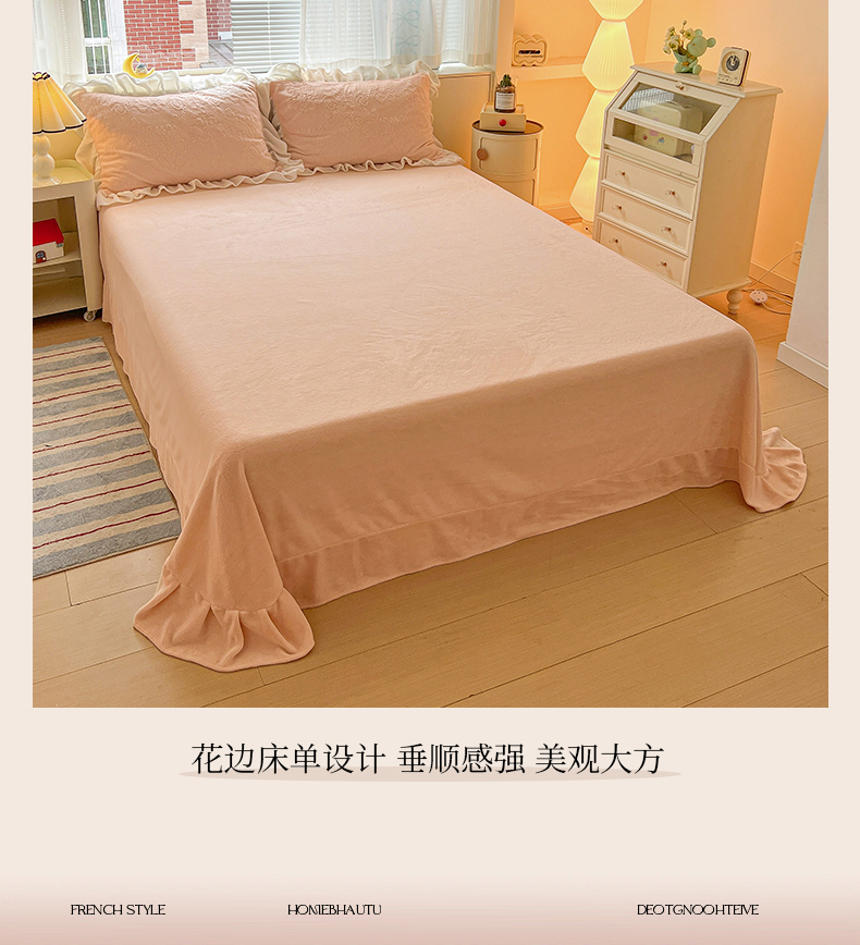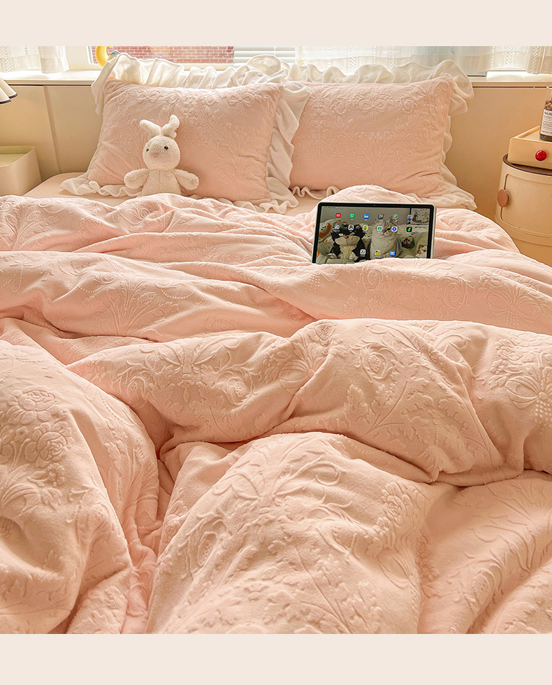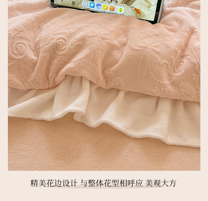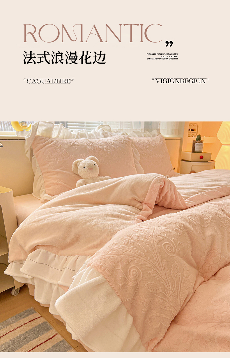 当前位置: 91家纺网 > 商品网购 > 床品套件 > 四件套 > 牛奶绒四件套 > 亿梵家居 2025新款法式花边款A类5D牛奶绒立体雕花四件套(提供买家秀) 花边款 芙洛拉-樱花粉