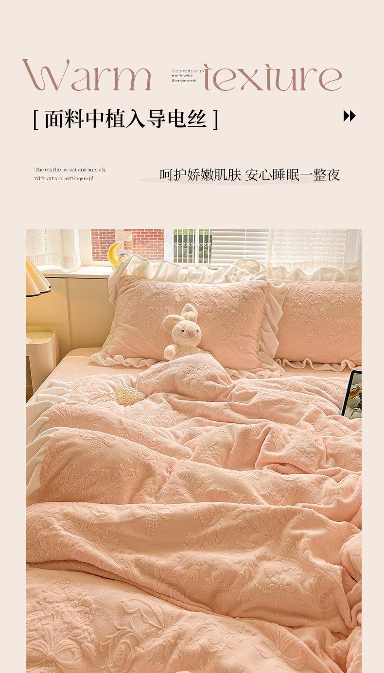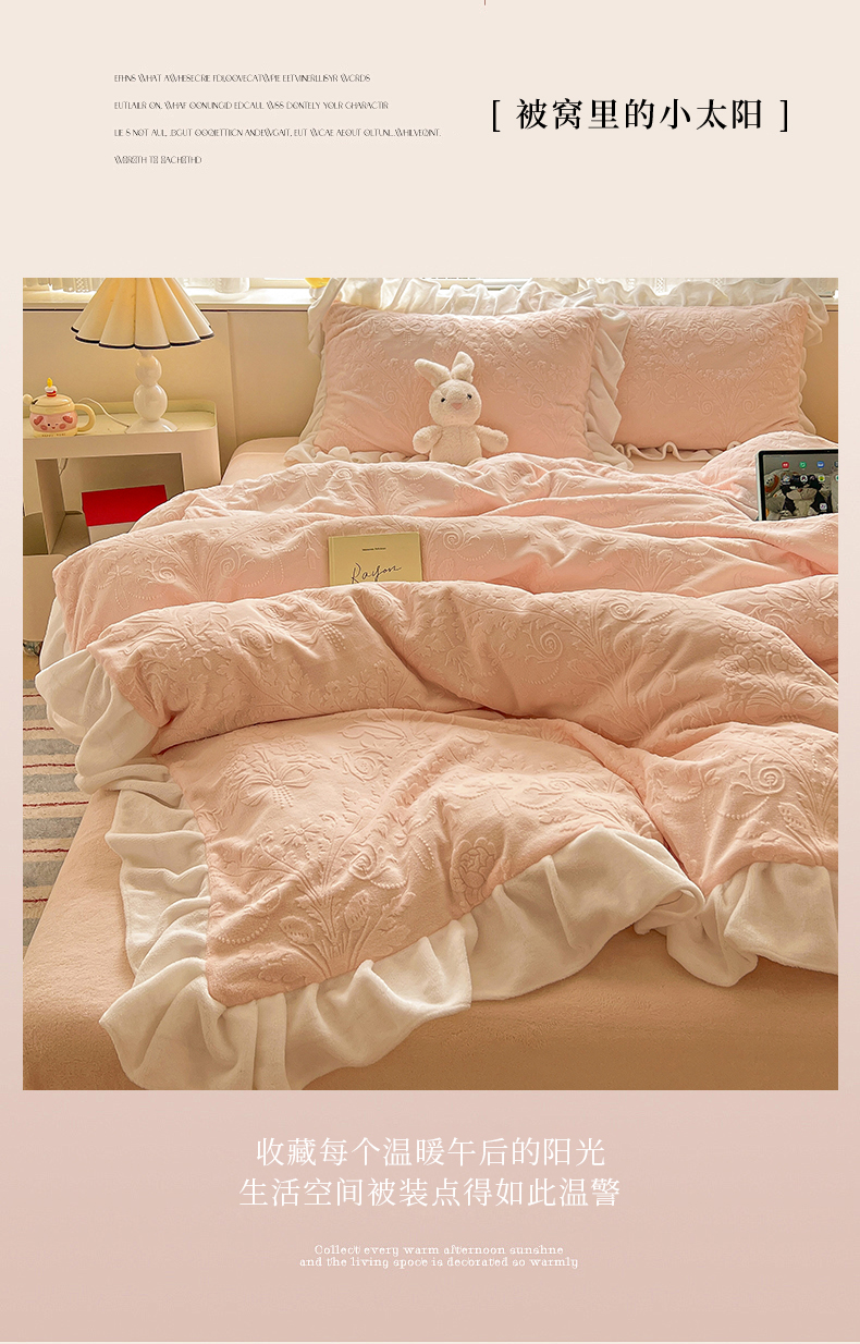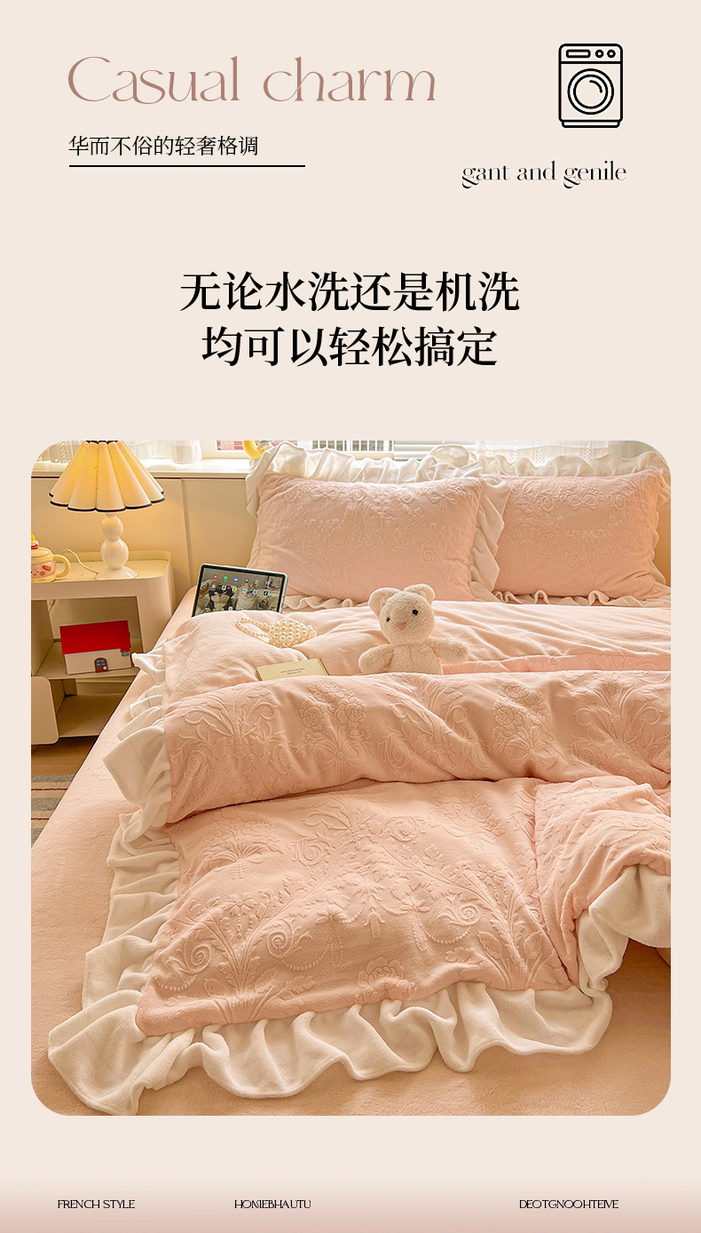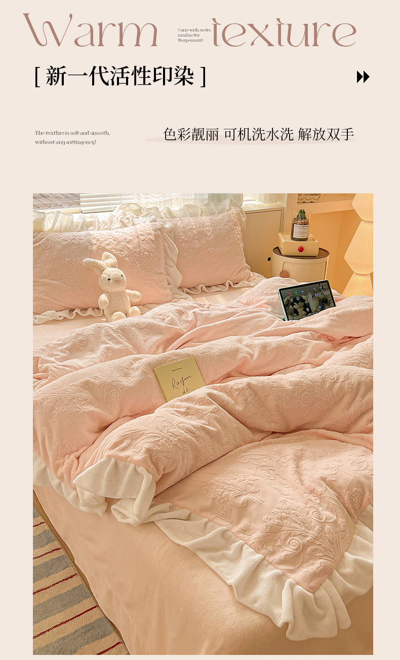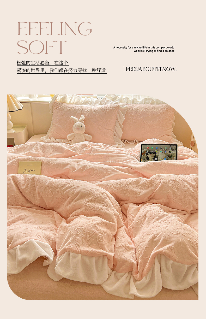 当前位置: 91家纺网 > 商品网购 > 床品套件 > 四件套 > 牛奶绒四件套 > 亿梵家居 2025新款法式花边款A类5D牛奶绒立体雕花四件套(提供买家秀) 花边款 芙洛拉-樱花粉