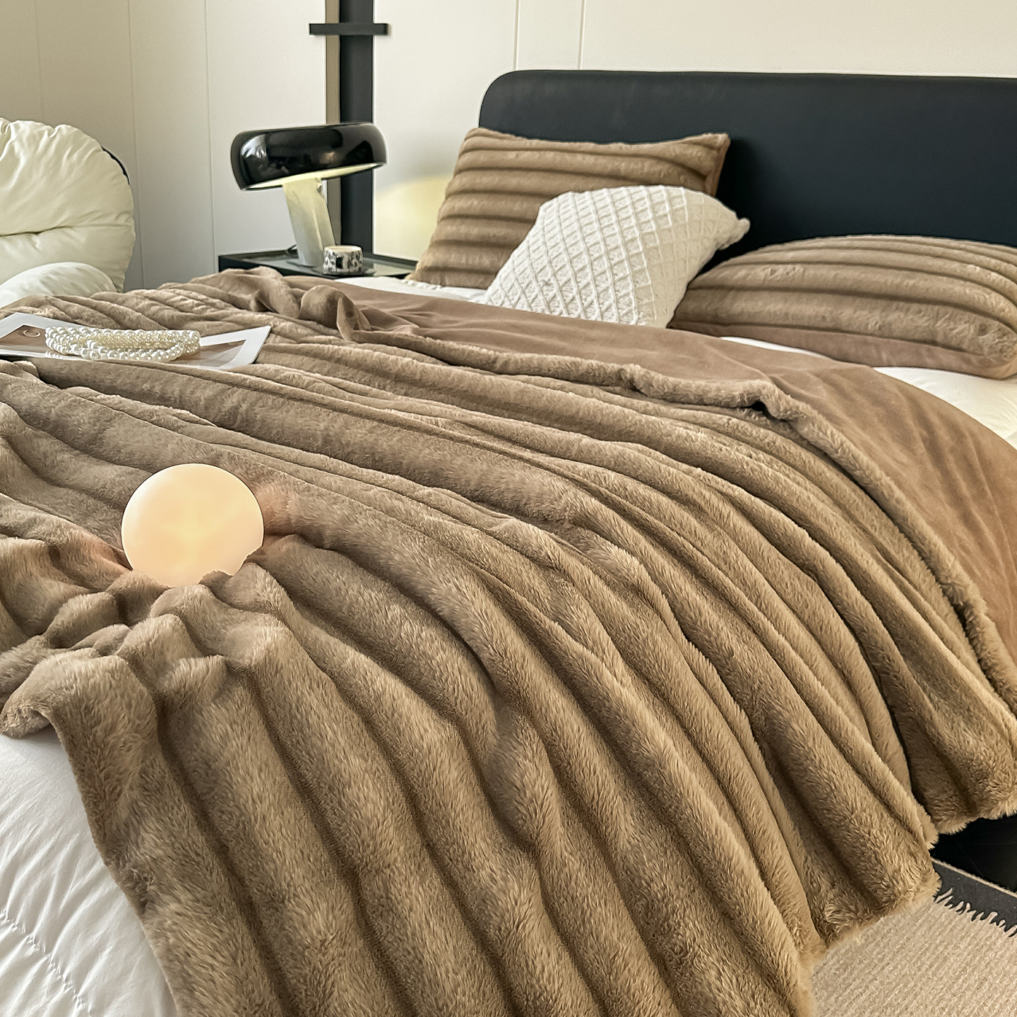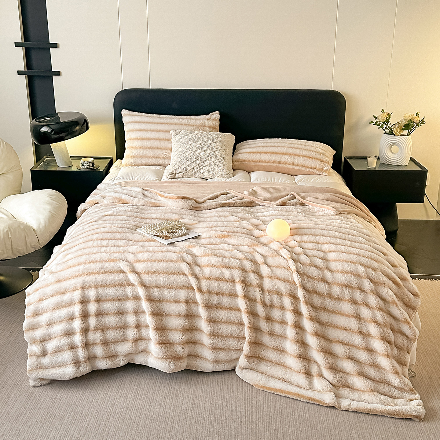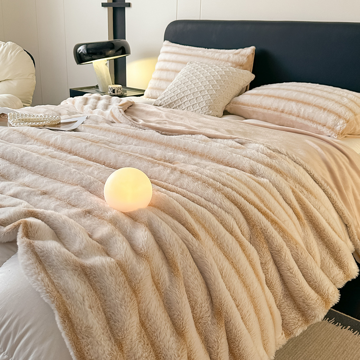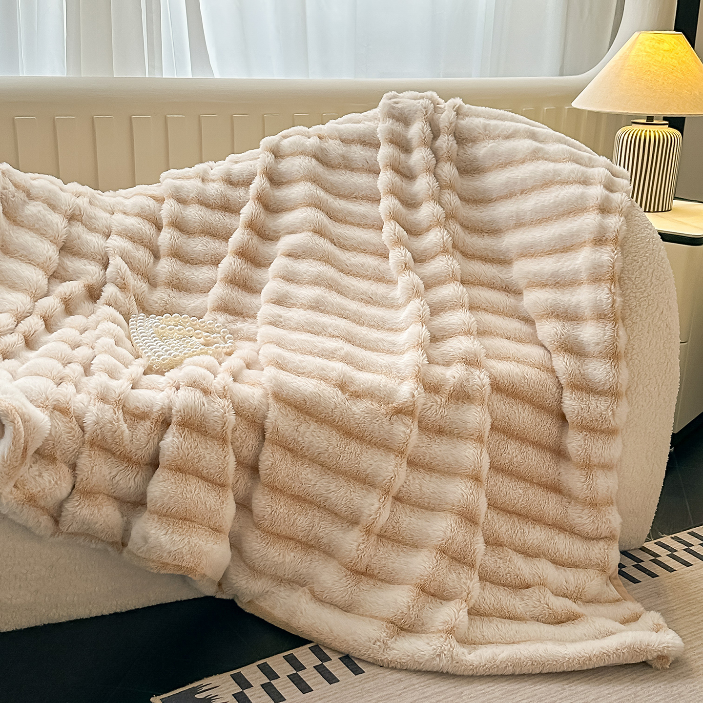 商品名称:梵克保罗 2025新款加厚美拉德抽条兔毛绒毛毯毛毯毯子 支持跨境外贸 奶白
