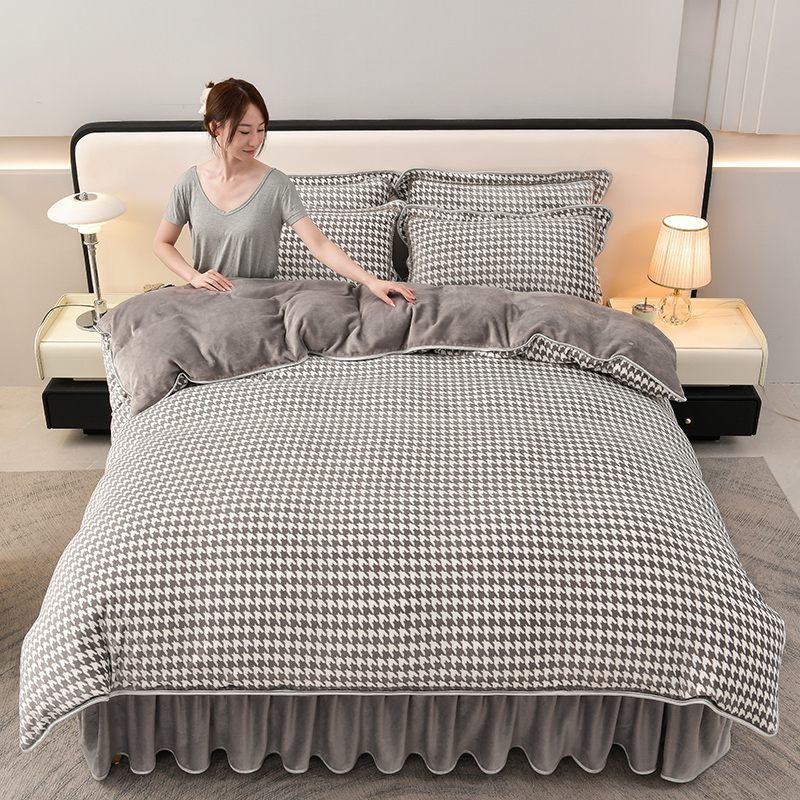 商品名称:绘萱2025新品爆款8斤包边印花牛奶绒四件套床裙款法莱绒金貂貂狐 千鸟格-灰