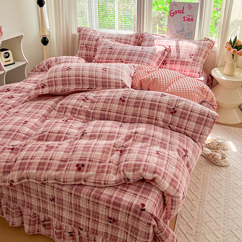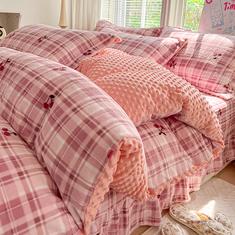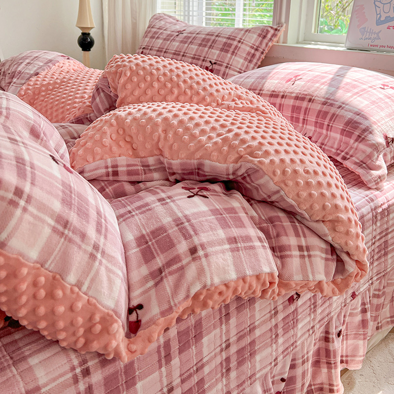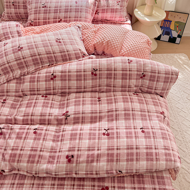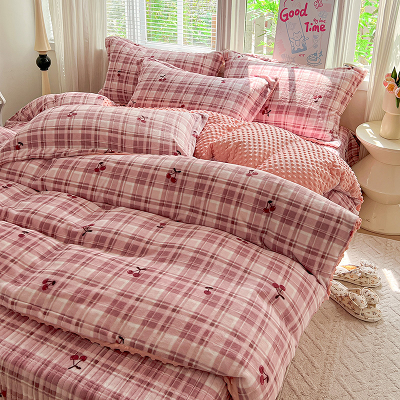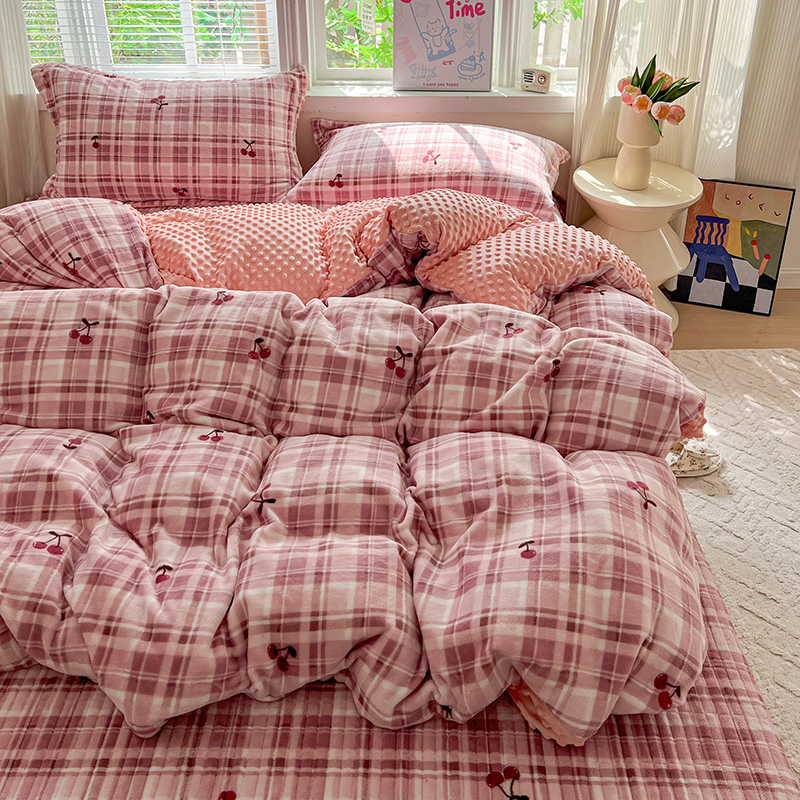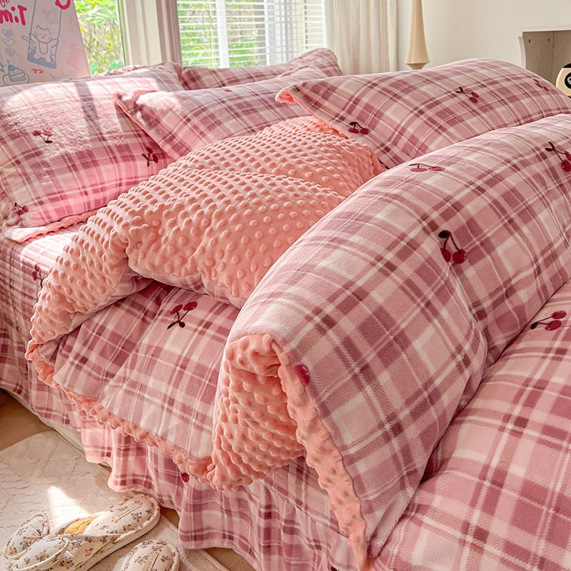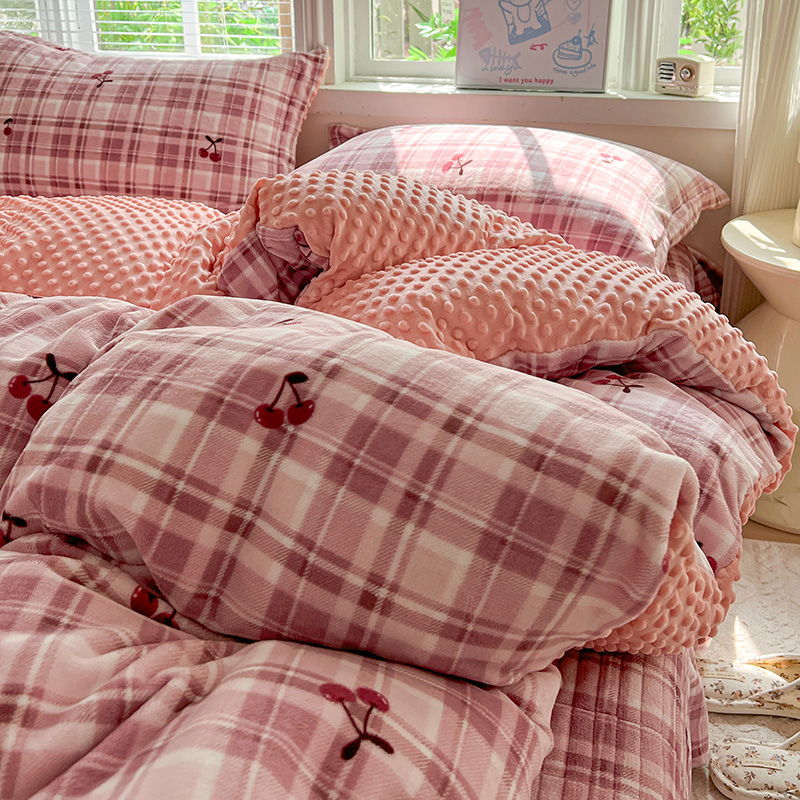 当前位置: 91家纺网 > 商品网购 > 床品套件 > 四件套 > 牛奶绒四件套 > 一比一 2025新款加厚保暖豆豆牛奶绒床盖款四件套车厘子