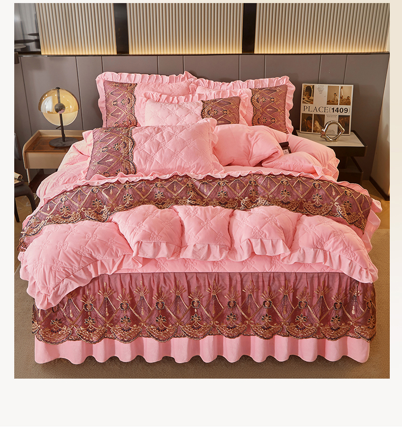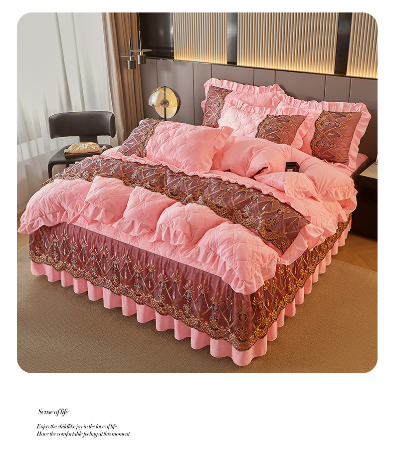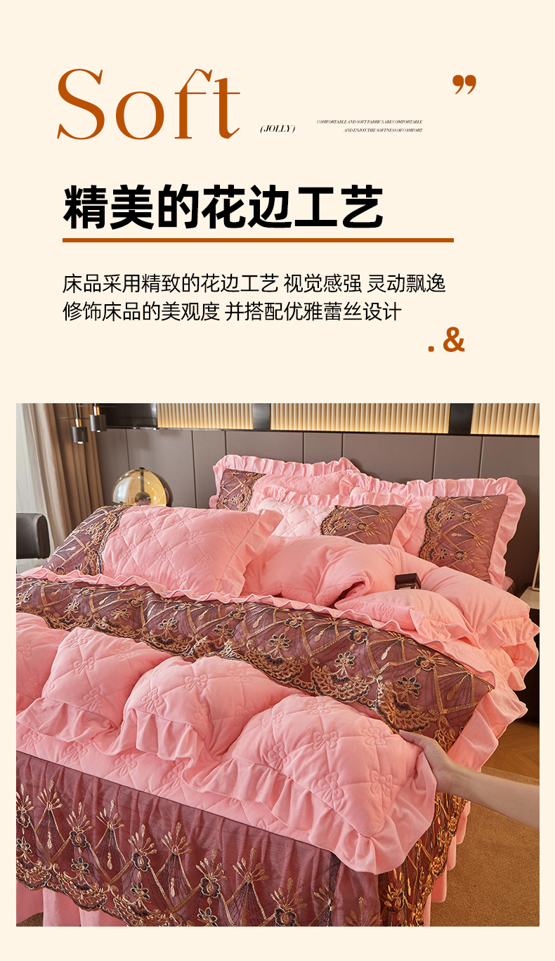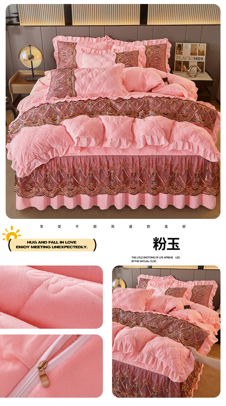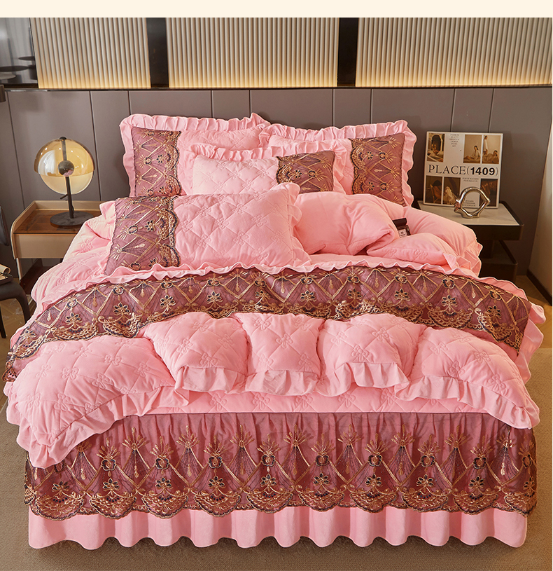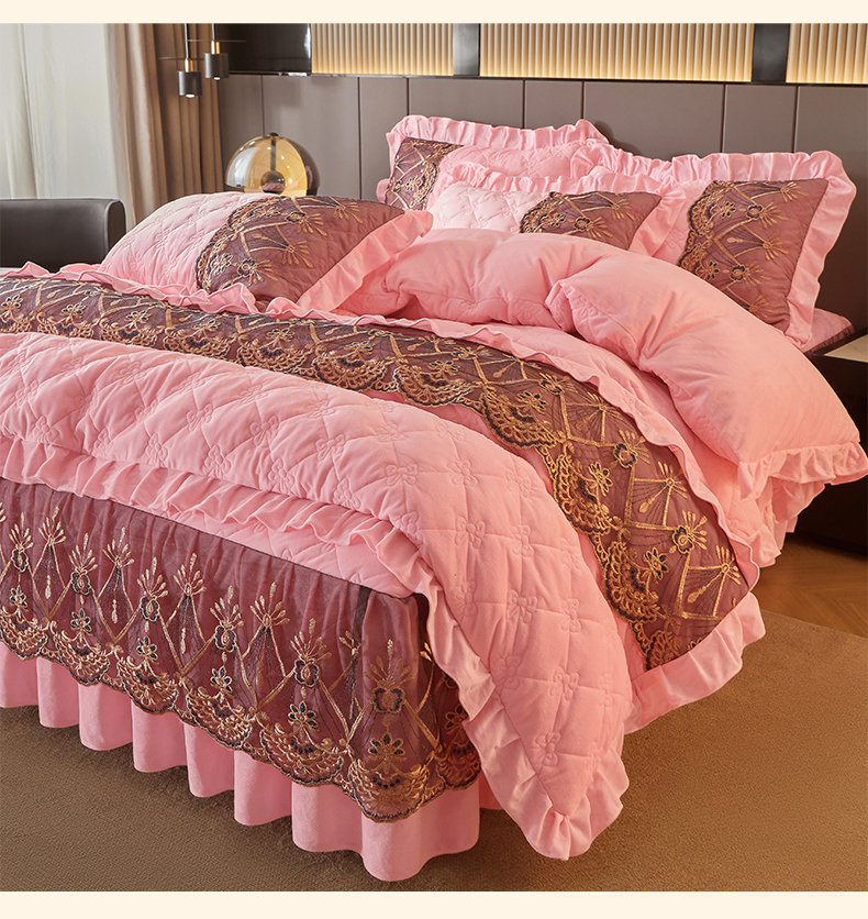 当前位置: 91家纺网 > 商品网购 > 床品套件 > 四件套 > 水晶绒四件套 > 屹成家纺2025新款水晶绒夹棉绗缝床裙四件套(塞纳河畔)四件套起售价不低于230元 粉玉