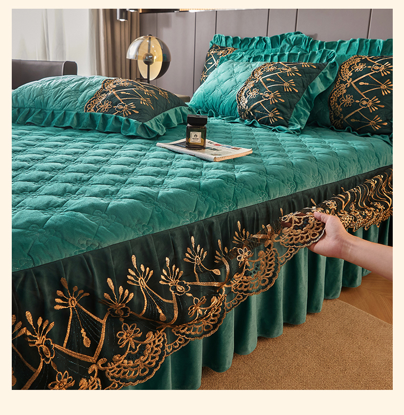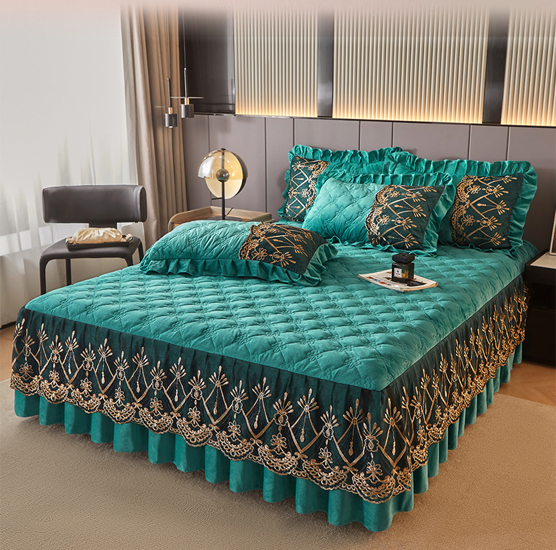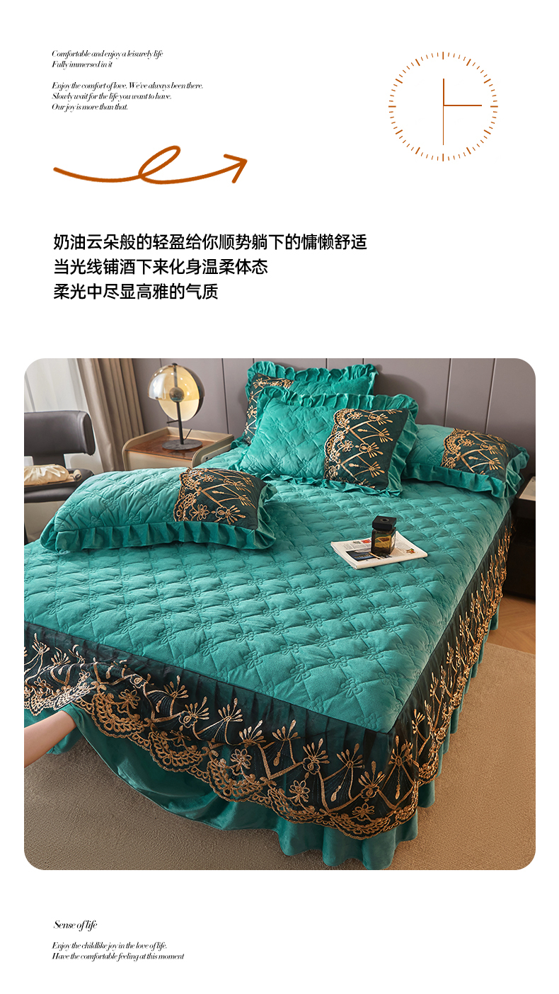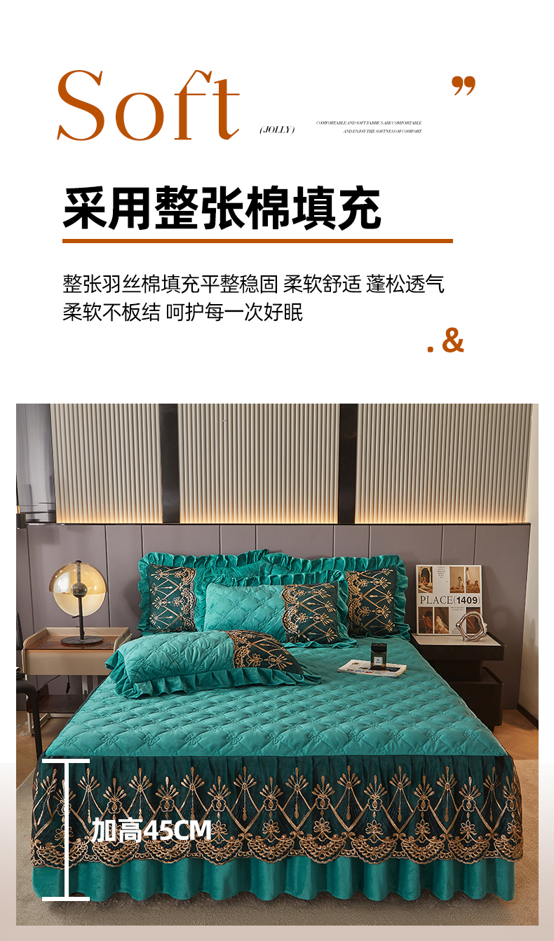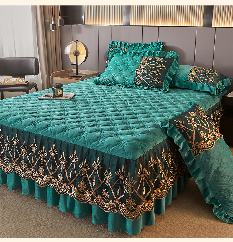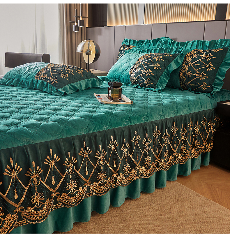 屹成家纺2025新款水晶绒夹棉绗缝蕾丝床裙三件套(塞纳河畔)床裙单件起售价不低于105元 翡翠绿