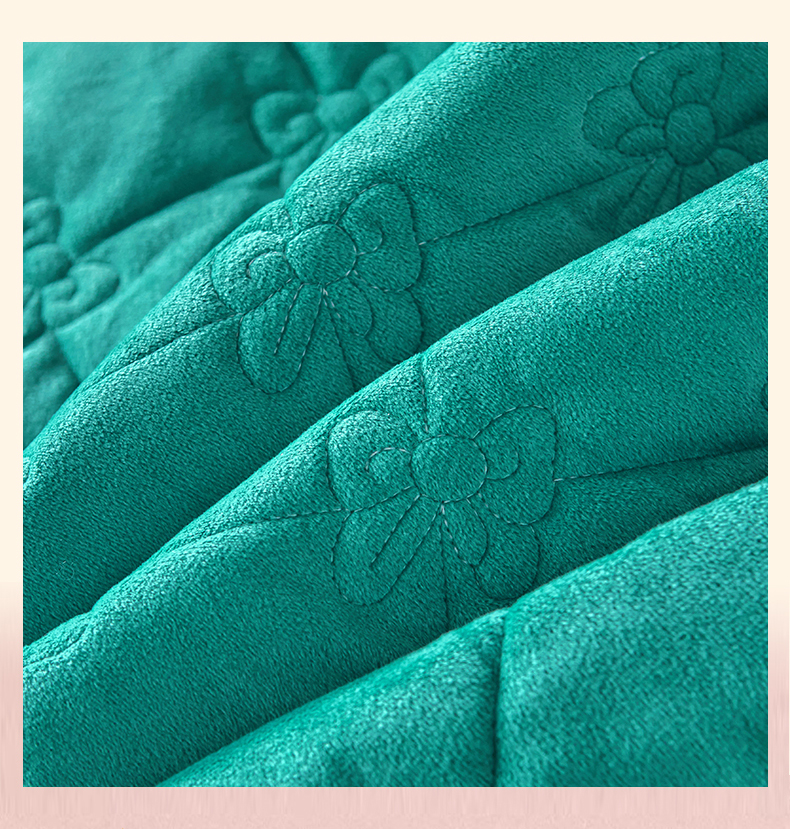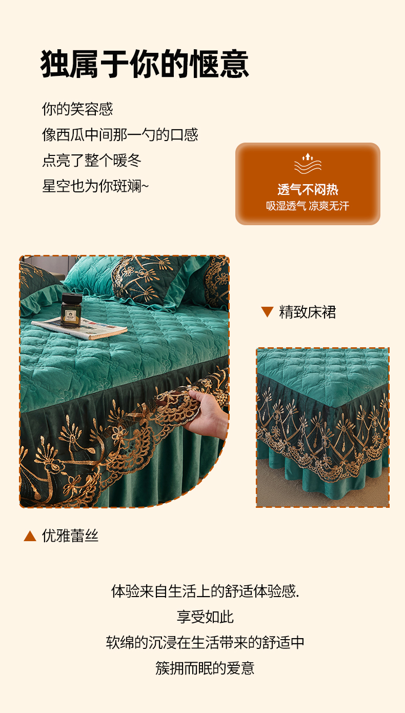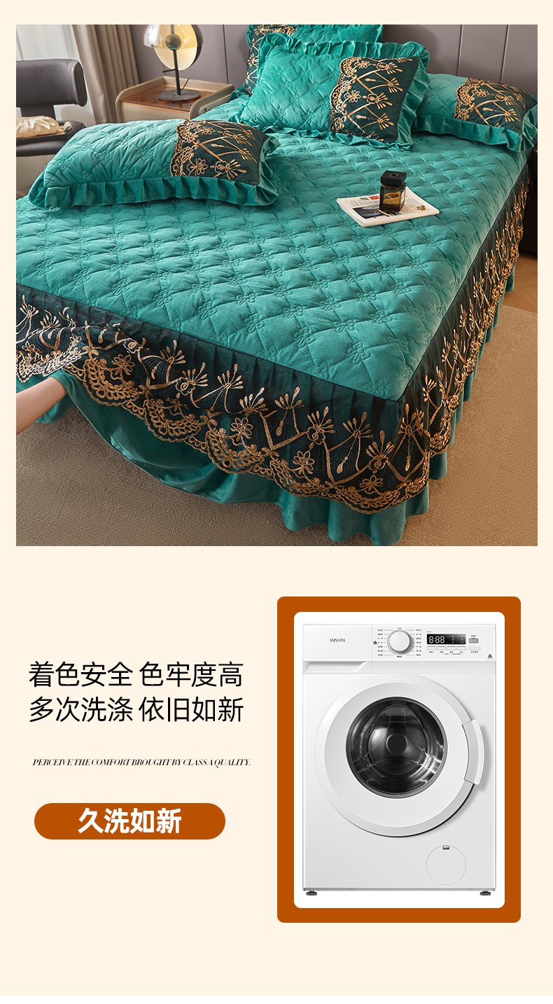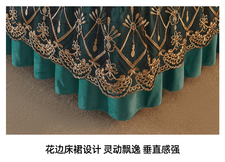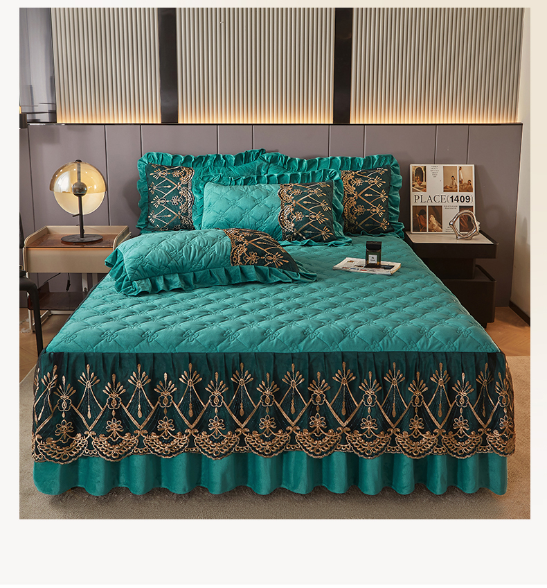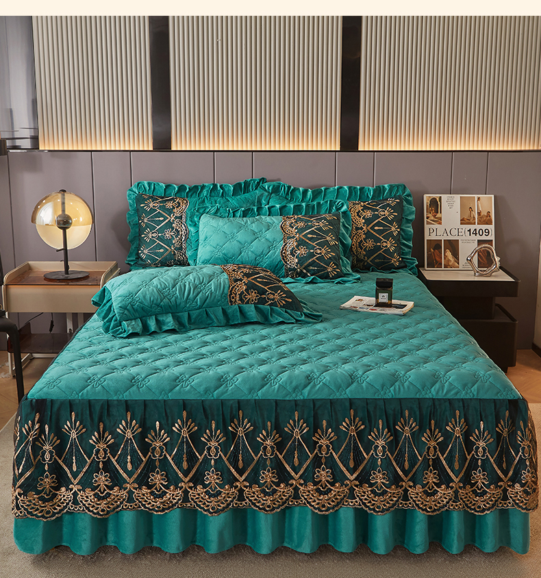 屹成家纺2025新款水晶绒夹棉绗缝蕾丝床裙三件套(塞纳河畔)床裙单件起售价不低于105元 翡翠绿