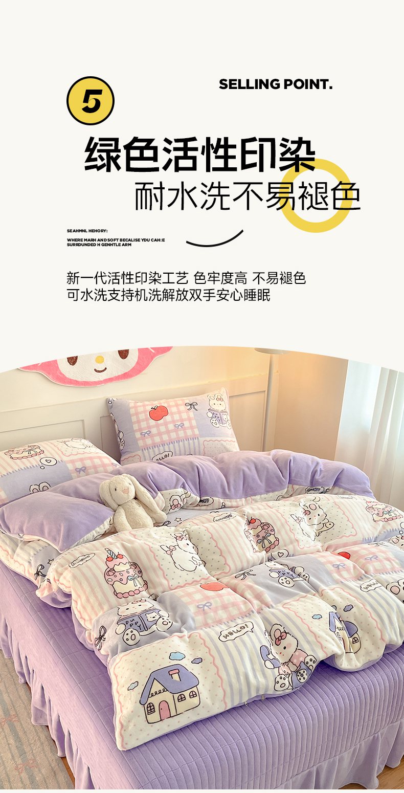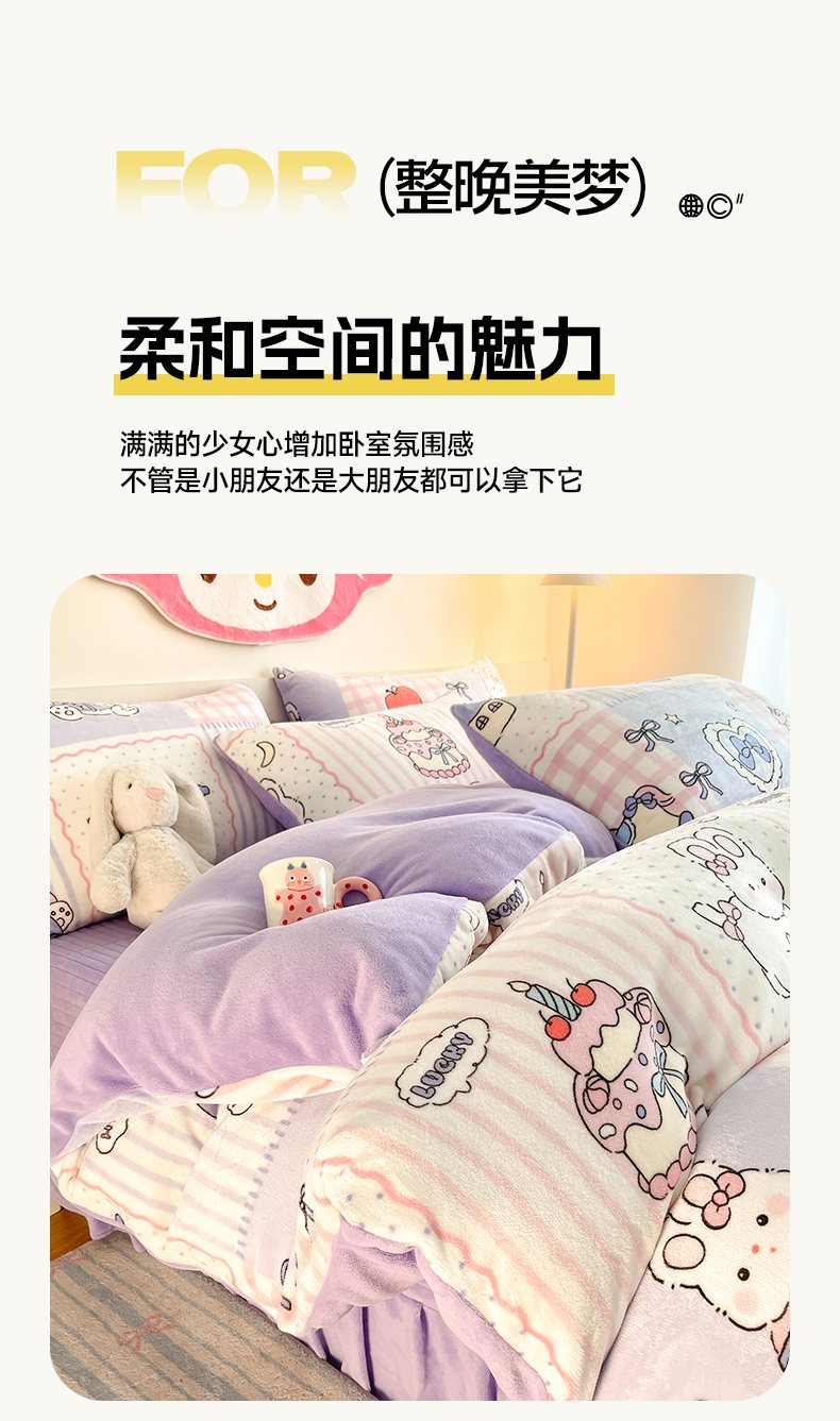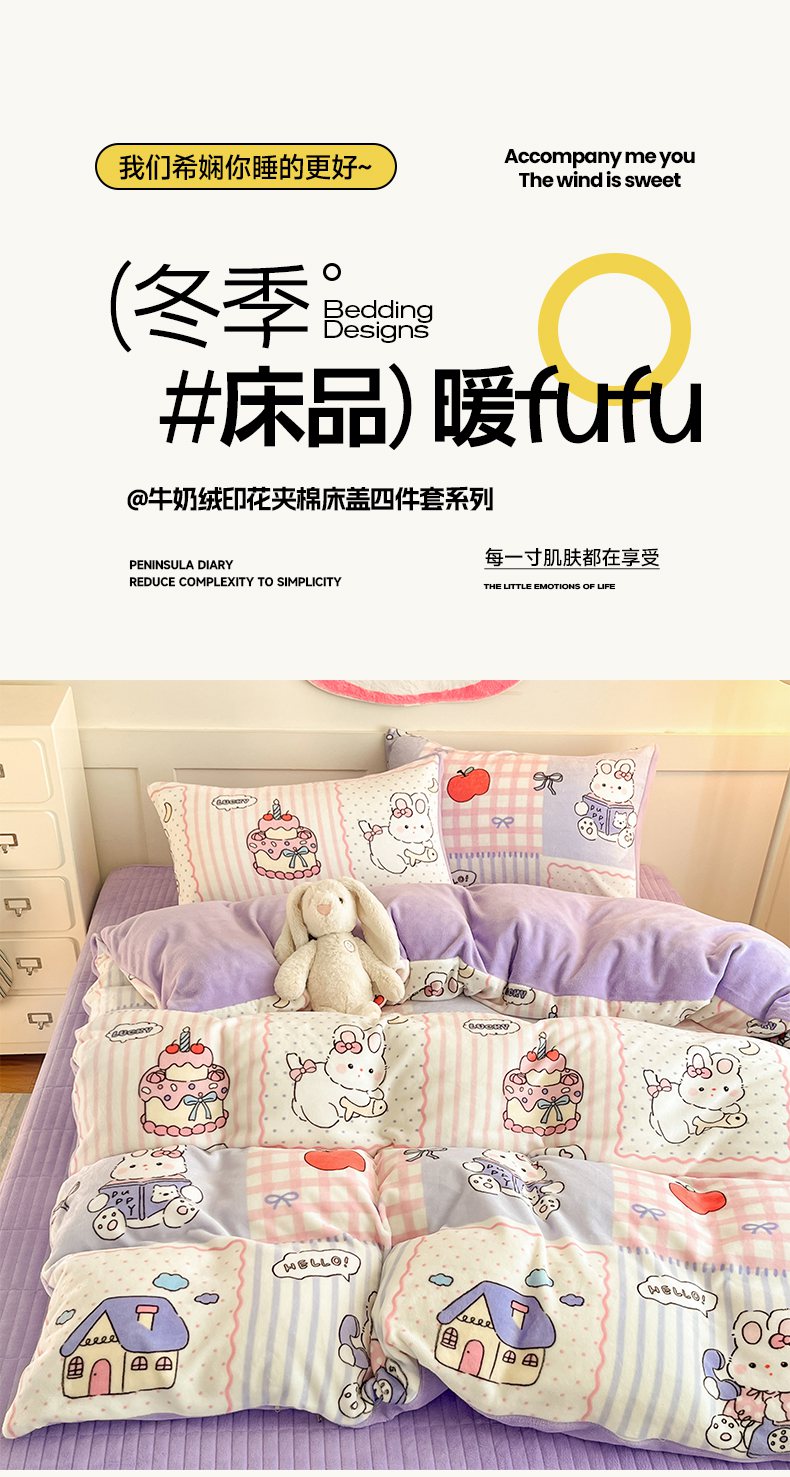 当前位置: 91家纺网 > 商品网购 > 床品套件 > 四件套 > 其它四件套 > 摩妮卡 2025新款牛奶绒印花夹棉床盖印花四件套 萌兔小屋
